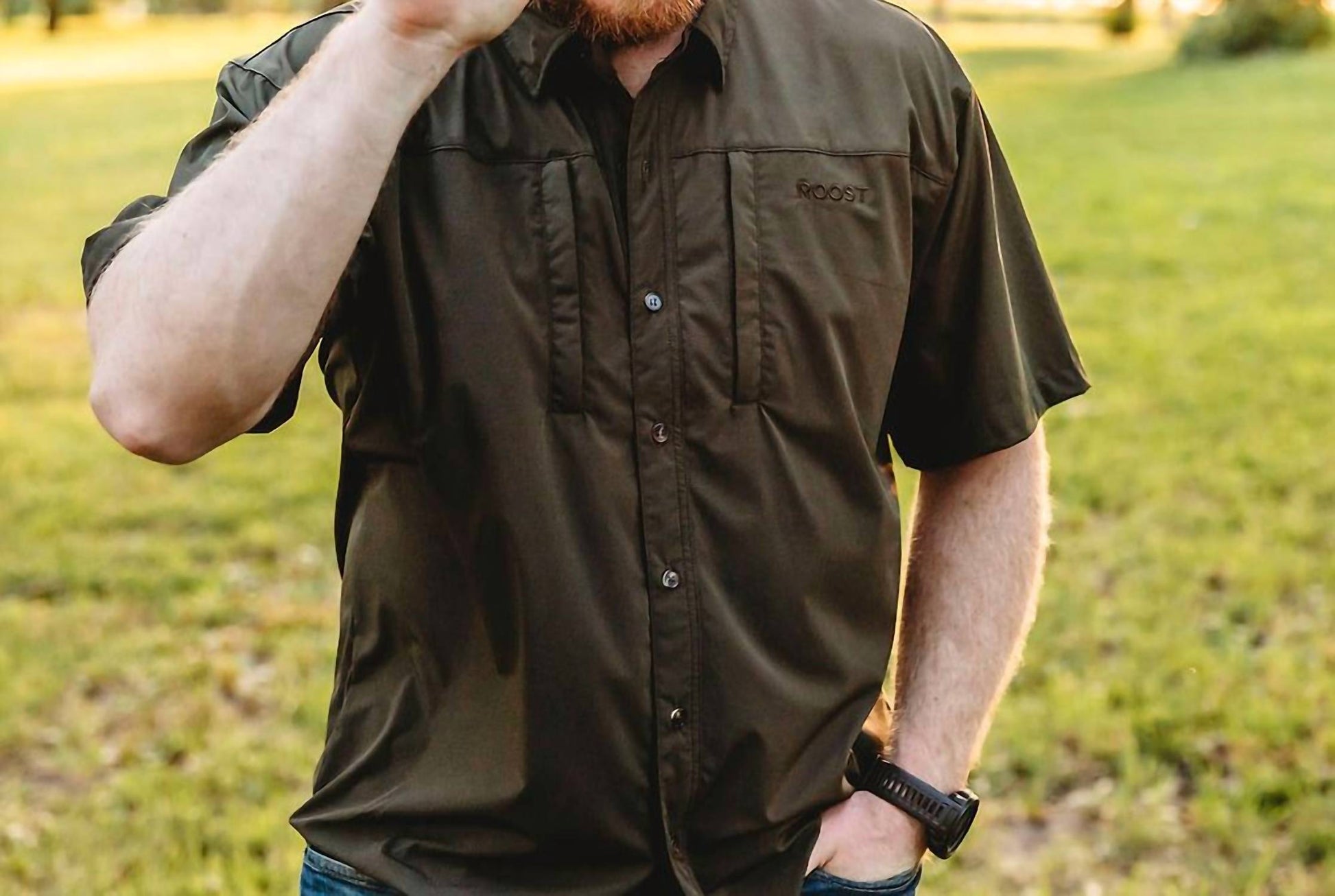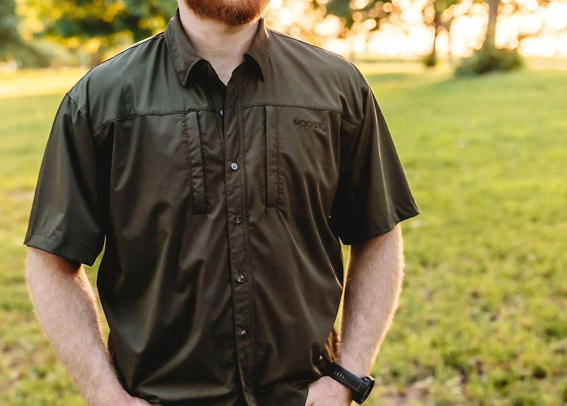 Perfectly tailored and soft to the touch. Introducing the Men's Roost Classic Short Sleeve Button Down Shirt by Fieldstone, your ultimate companion for outdoor adventures. Crafted from a 90% Nylon, 10% Spandex blend, this solid hue shirt offers a cooling 4-way stretch and water-repellent properties. Featuring a collar neckline, button closure, and practical pockets, it's perfect for hiking or any casual outdoor activity. Care instructions: Machine wash, ready for action on your next escapade.