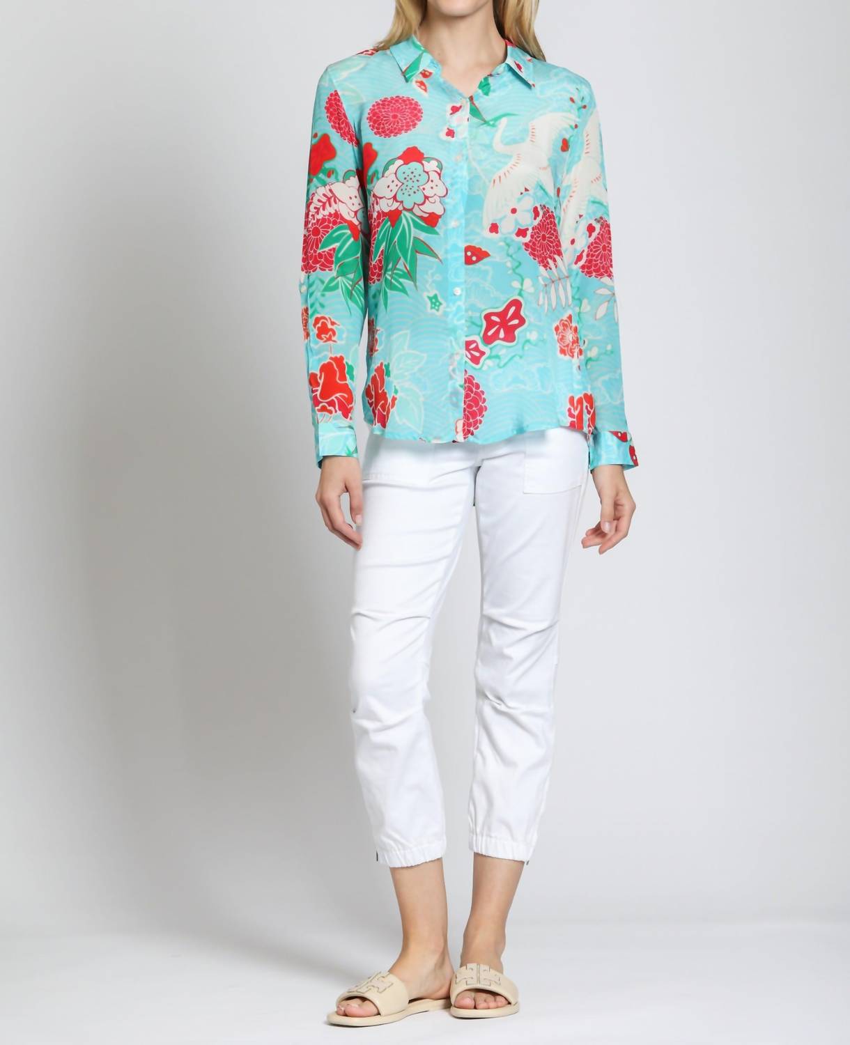 This button down shirt is comfortable yet polished. Vibrant turquoise, accented by a floral pattern. Long-sleeve shirt features roll-tab cuffs and a full button closure, perfect for a chic holiday party or Thanksgiving gathering. Crafted from 64% Cupro and 36% Viscose. Lightweight shirt is both comfortable and stylish. Machine washable and easy to care for, effortlessly blending workwear and global flair. Model is wearing size Small and is 5’9”.