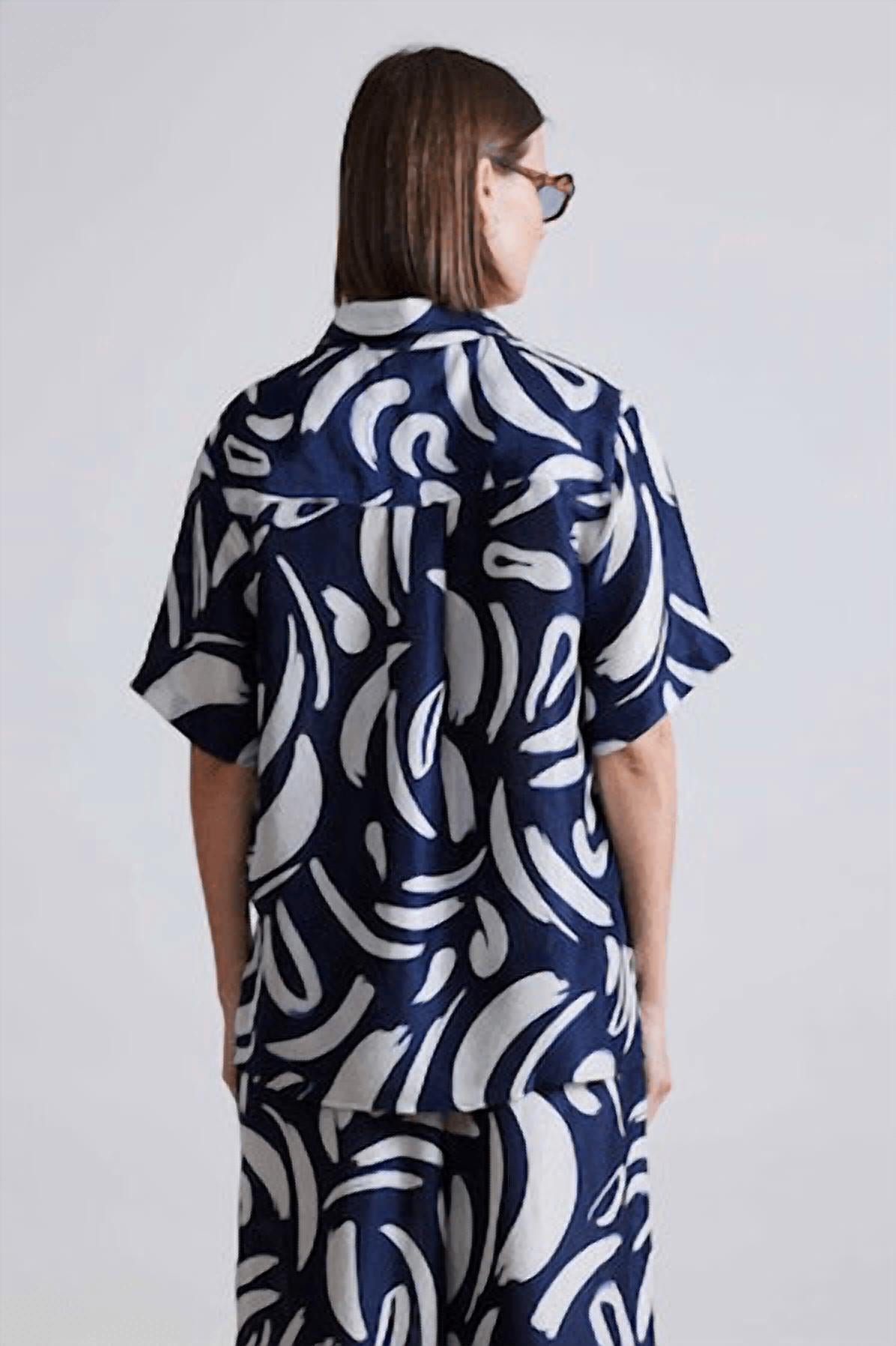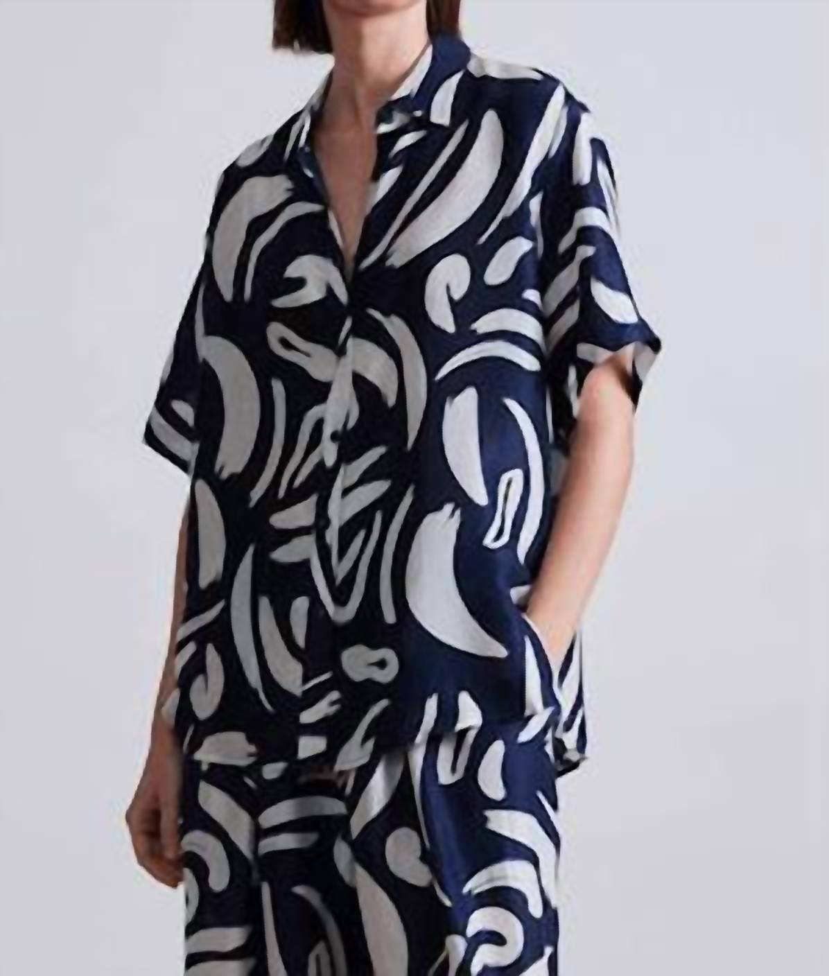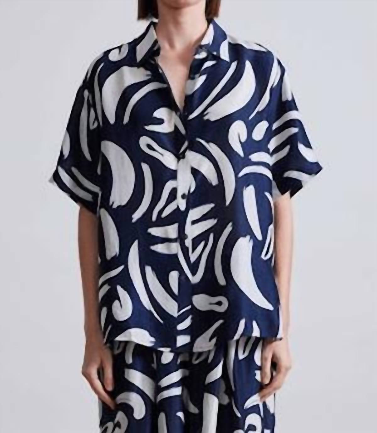 Perfectly tailored and soft to the touch. Elevate your holiday party ensemble with the Albers Button Down Top by APIECE APART, crafted for sophisticated summer style. This short-sleeved top, made from 100% silk, features a button closure and a striking navy abstract brush strokes print. Its classic collar adds a refined touch, making it both chic and comfortable. Please note that care instructions are not specified.