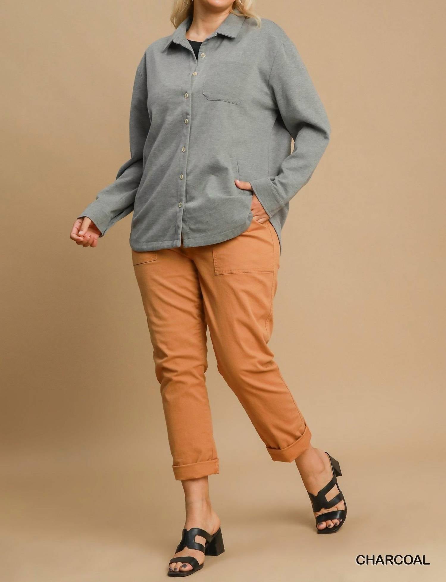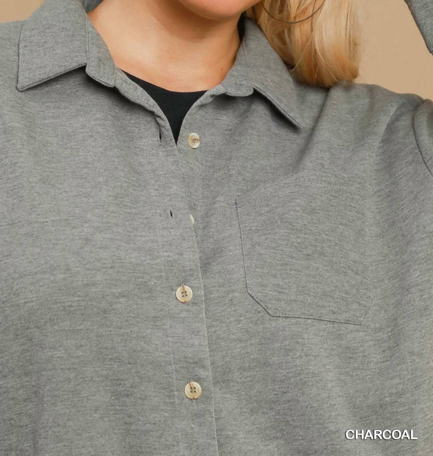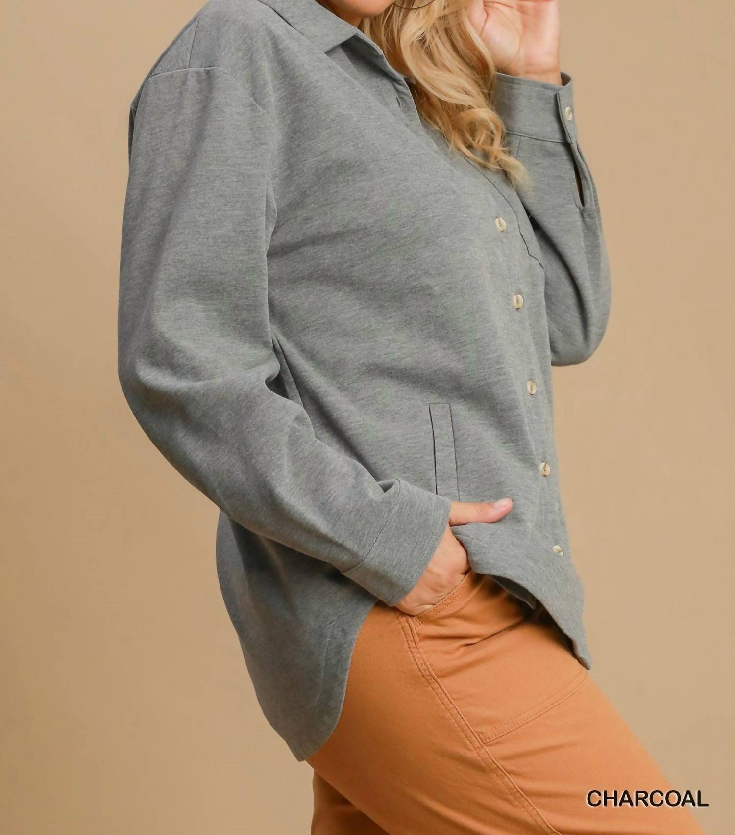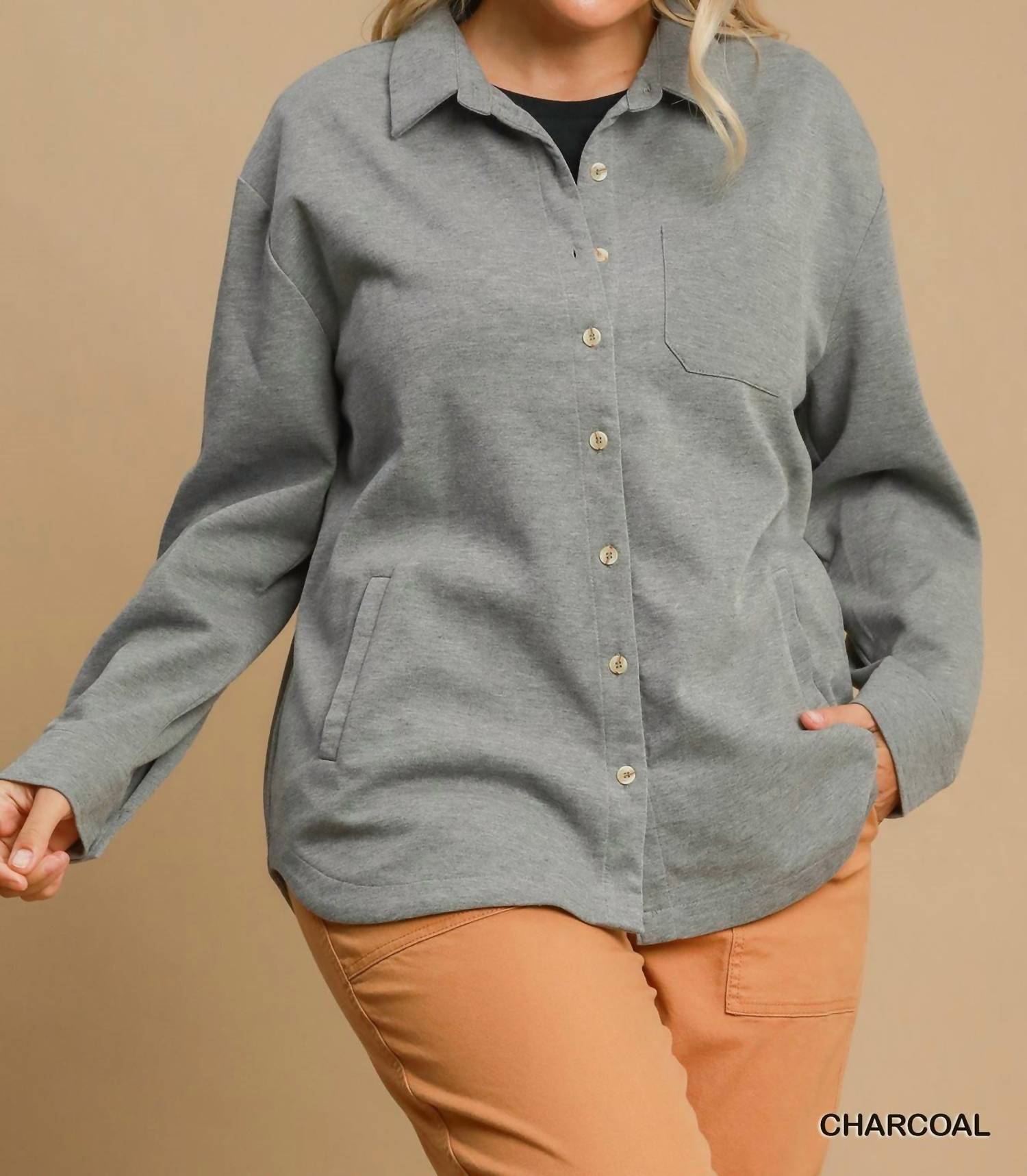 Perfectly tailored and soft to the touch. Introducing the Umgee Luxknit Oversized Shirt Jacket, a perfect addition to your wardrobe for chic layering. With long sleeves and crafted from a cotton blend composed of 52% cotton, 40% polyester, and 8% spandex, it offers comfort and flexibility. This charcoal shacket features a button closure and a stylish collar neckline, complete with practical pockets and a curved split hem. Available in sizes XL, 1X, and 2X, it provides a relaxed, true-to-size fit.