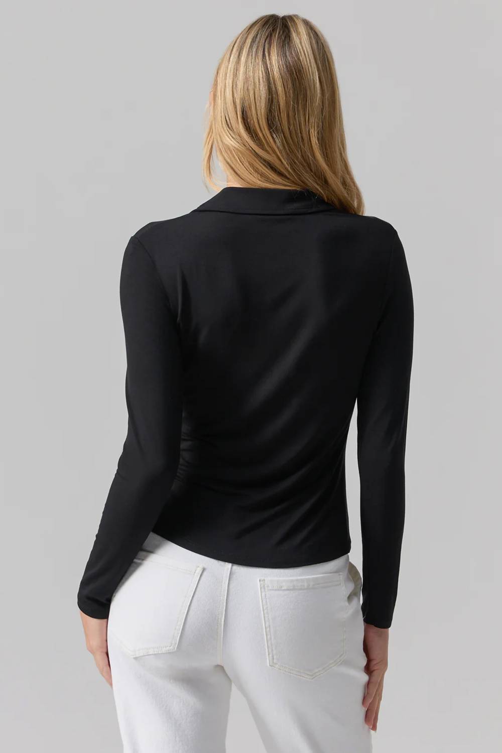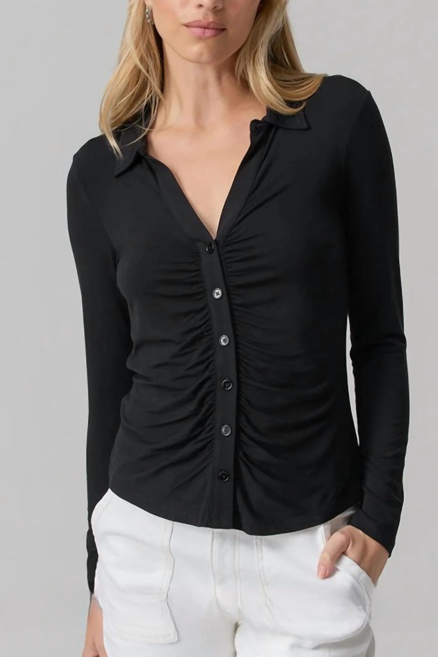 This button down shirt is comfortable yet polished. Discover the Women's Dream Girl Button Up Top by Sanctuary, a chic black essential for your wardrobe. Crafted with long sleeves and a luxurious blend of 95% rayon and 5% spandex, this buttery-soft shirt offers comfort and versatility. The button front closure and slightly rouched design highlight an effortlessly stylish look suitable for any vacation outing. This bra-friendly piece is imported and should be machine washed cold and laid flat to dry. Model is 5'9" wearing size small.