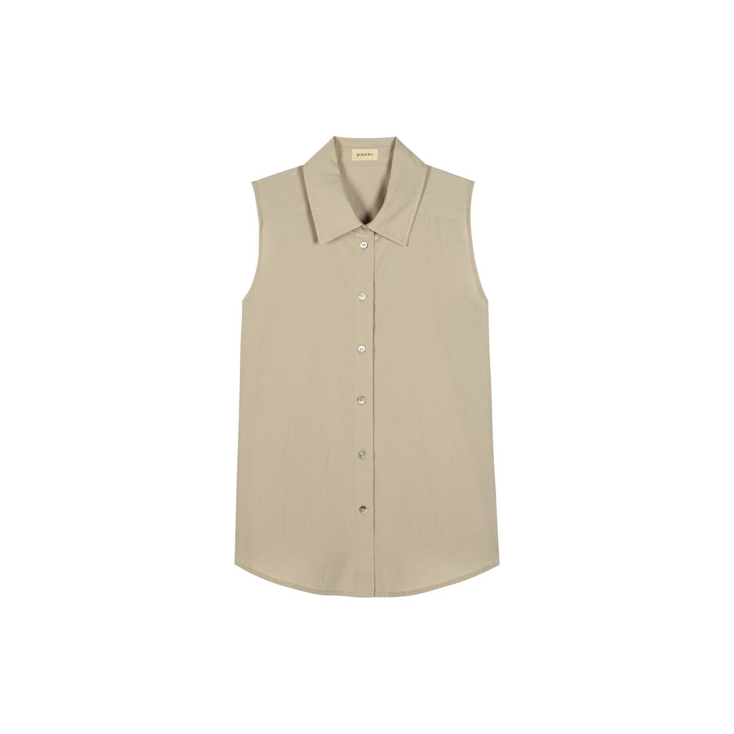 A classic button down shirt that will never go out of style. Discover the Sandwash Sleeveless Shirt by DONNI., a chic Shitake-hued addition to your minimalist summer wardrobe. Expertly crafted in the US from 100% Cotton Poplin, it features a classic collared neckline and tortoise-like button closure for a sophisticated touch. Designed with a solid pattern, this top offers effortless pairing for holiday parties or Thanksgiving gatherings. Care is simple: machine wash cold with like colors and tumble dry low. Model Maya, standing at 5’9” with a 34” bust, 25” waist, and 33.5” hips, wears a size small.