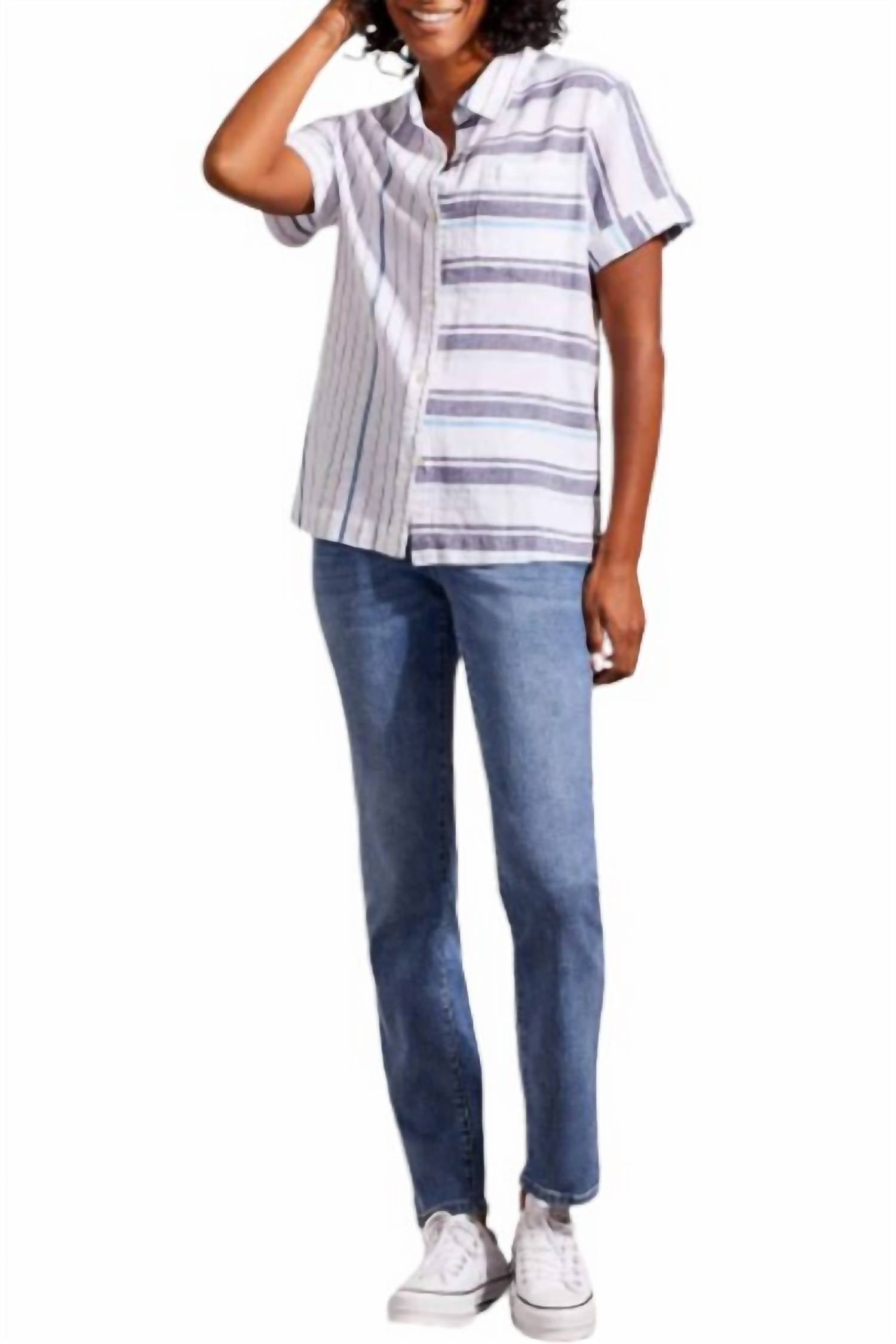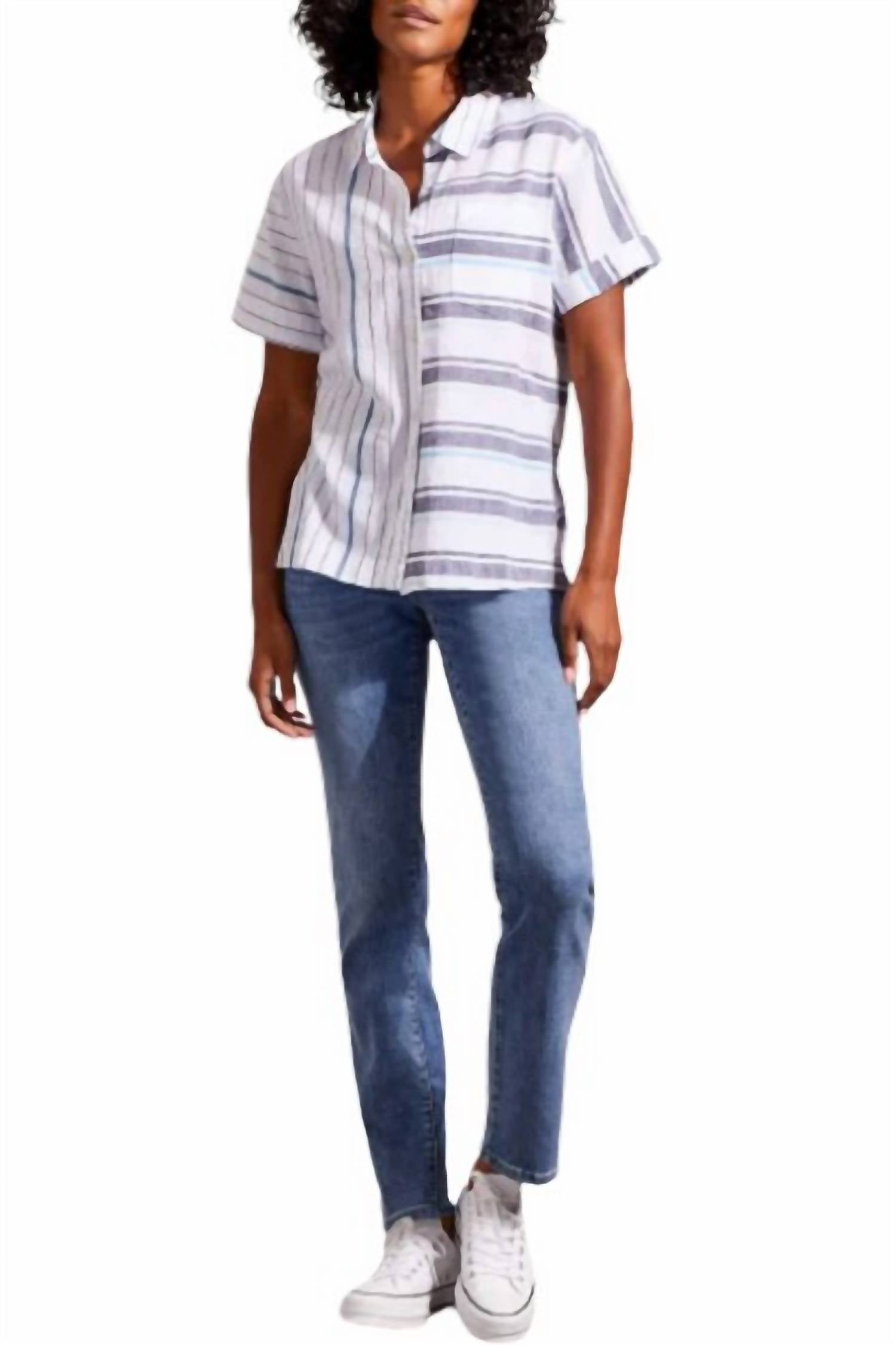 A classic button down shirt that will never go out of style. Stylish Deep Blue with a striking stripe pattern. Featuring short sleeves and a convenient button closure. Blends 55% Linen with 45% Cotton for a breathable feel. Designed with a functional pocket. Promises comfort and effortless style for everyday wear. Care is simple with machine wash instructions.