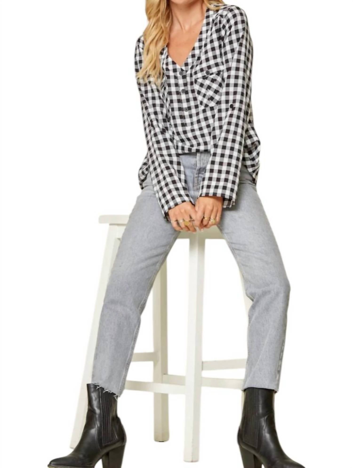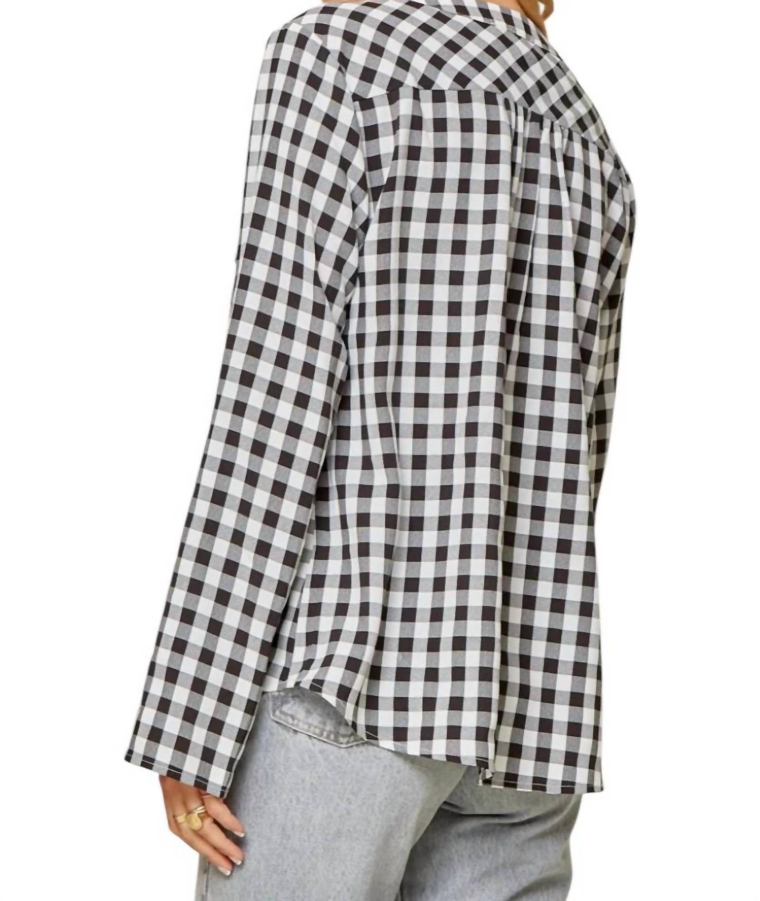 This casual button-down gingham top features double front pockets, rolled-up sleeves, a relaxed bodice, long sleeves, a V-neck, and a curved hemline. It is made from 50% cotton and 50% polyester.