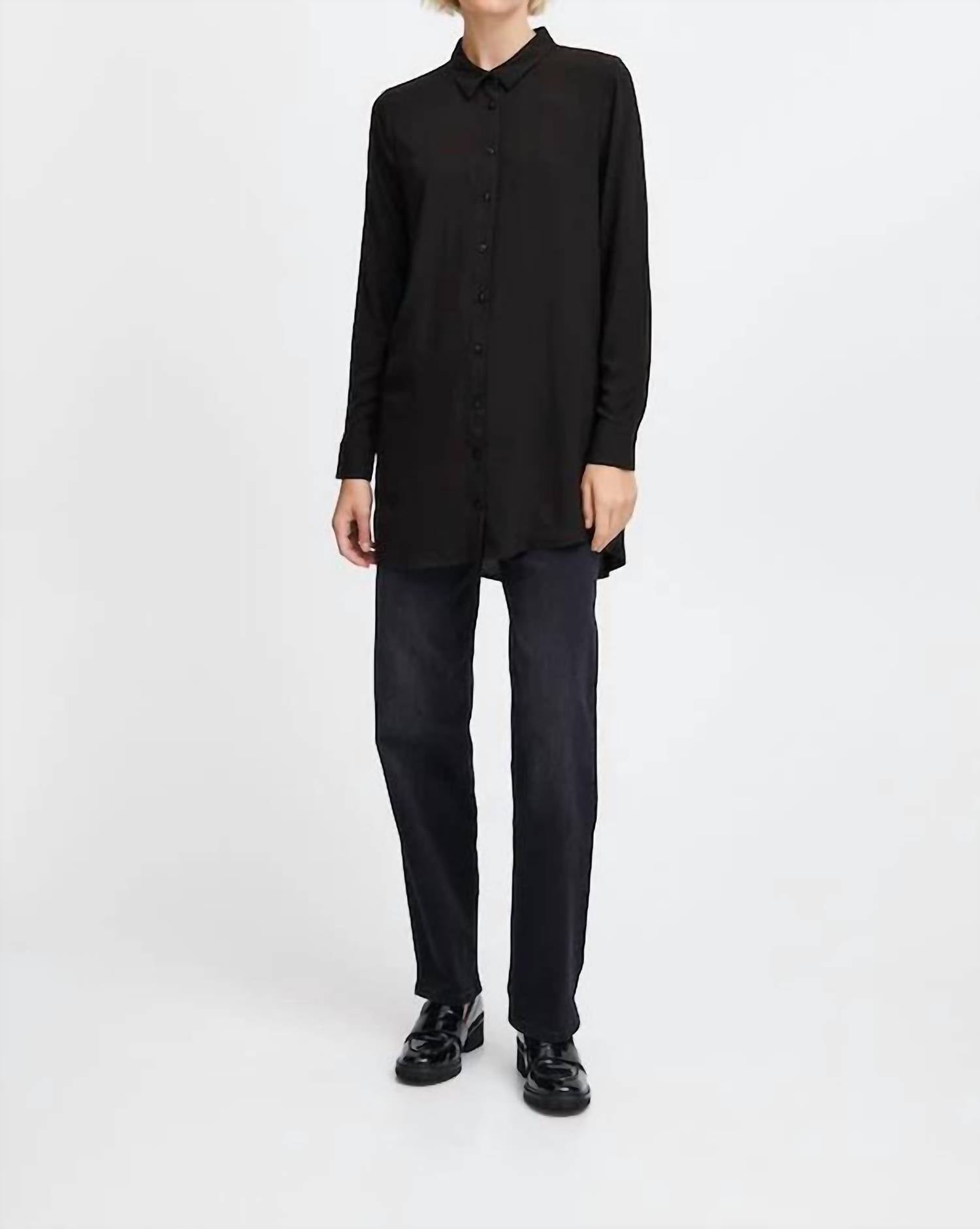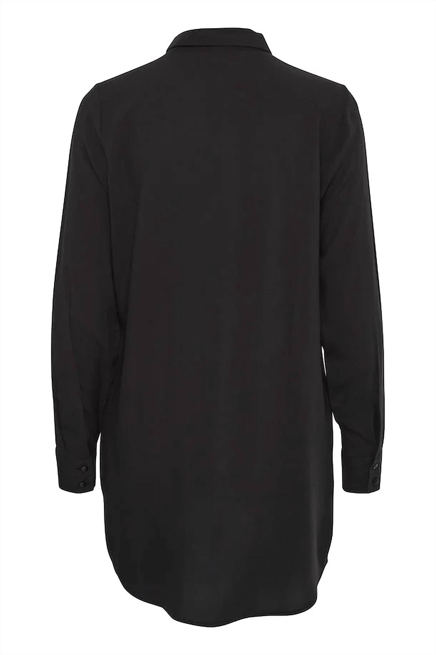 This button down shirt is comfortable yet polished. Introducing the Long Sleeve Button Down Shirt by ICHI, designed for women seeking elegance and versatility. This shirt features long sleeves, a solid black color, and a classic collar for a timeless look, with a length falling below the waist. Made from 100% viscose, it ensures a soft touch and effortless maintenance. Closure: Button closure. Care: Machine wash. Perfect for workwear and any occasion.