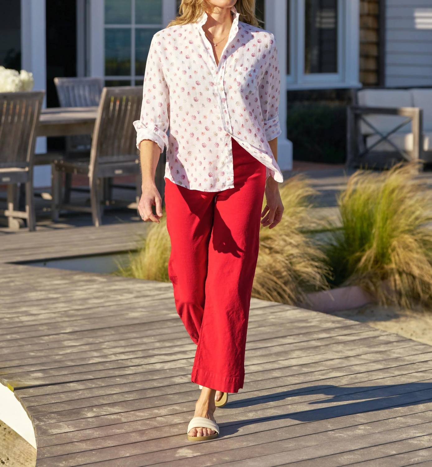A classic button down shirt that will never go out of style. Introducing the Eileen Relaxed Button-up Shirt by Frank & Eileen, featuring long sleeves with button cuffs and a flattering shirttail hem that adds coverage and style. Crafted entirely from Italian Classic Linen, this exquisite piece offers a naturally soft, textured feel and delightful floral pattern in red/blue messy flower. Designed with a chest pocket and signature bust-accentuating button placement, it provides both functionality and a flattering silhouette. Care is simple—turn it inside out, machine wash cold, and tumble dry low. 100% Linen.