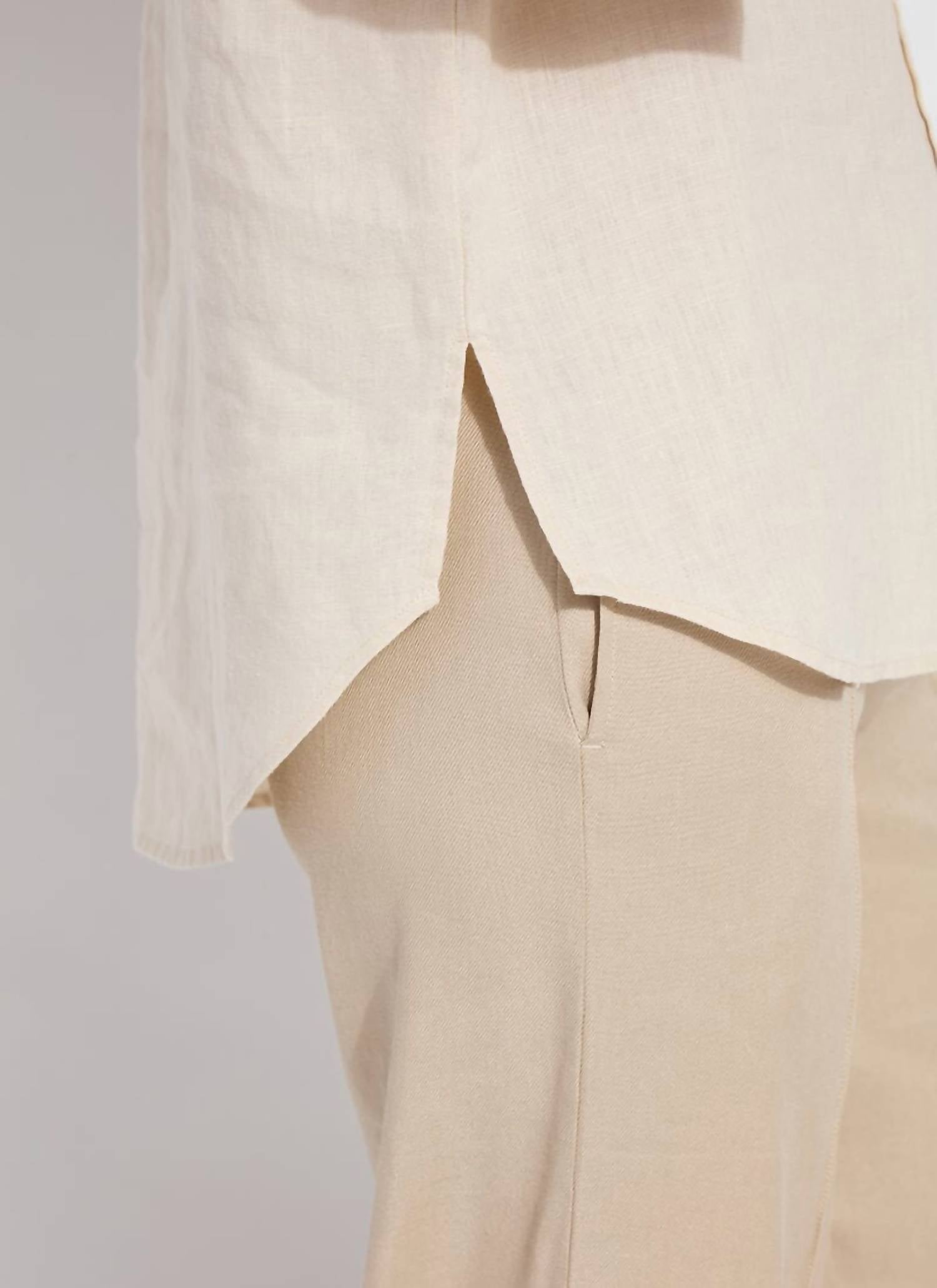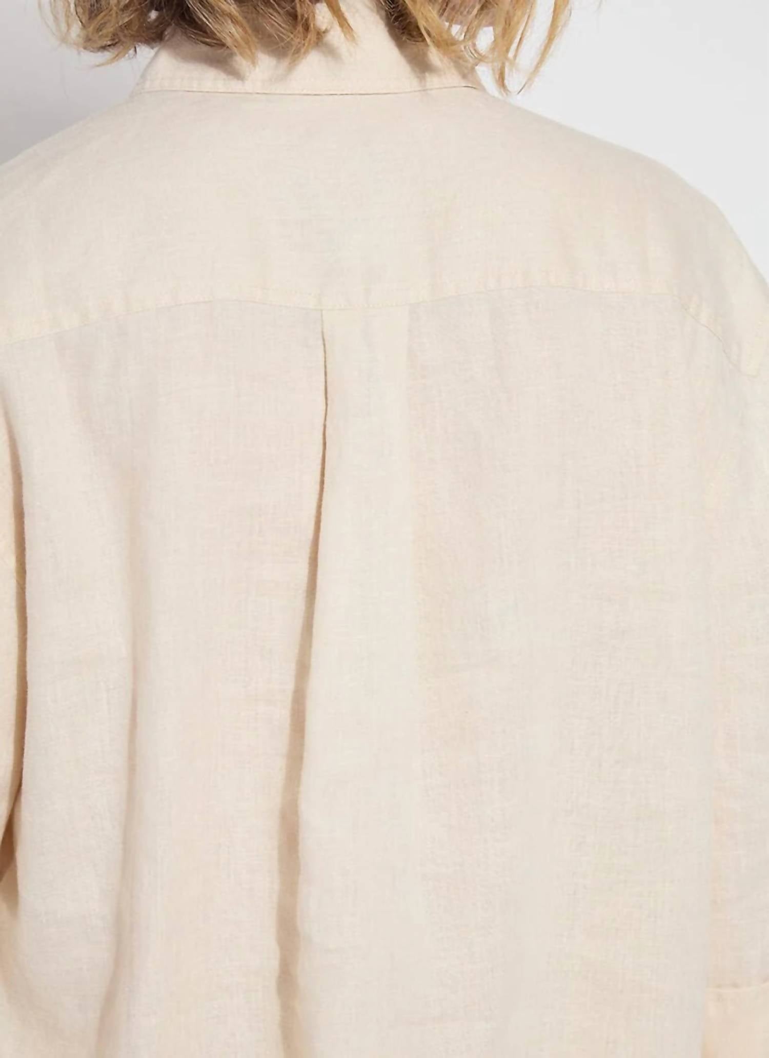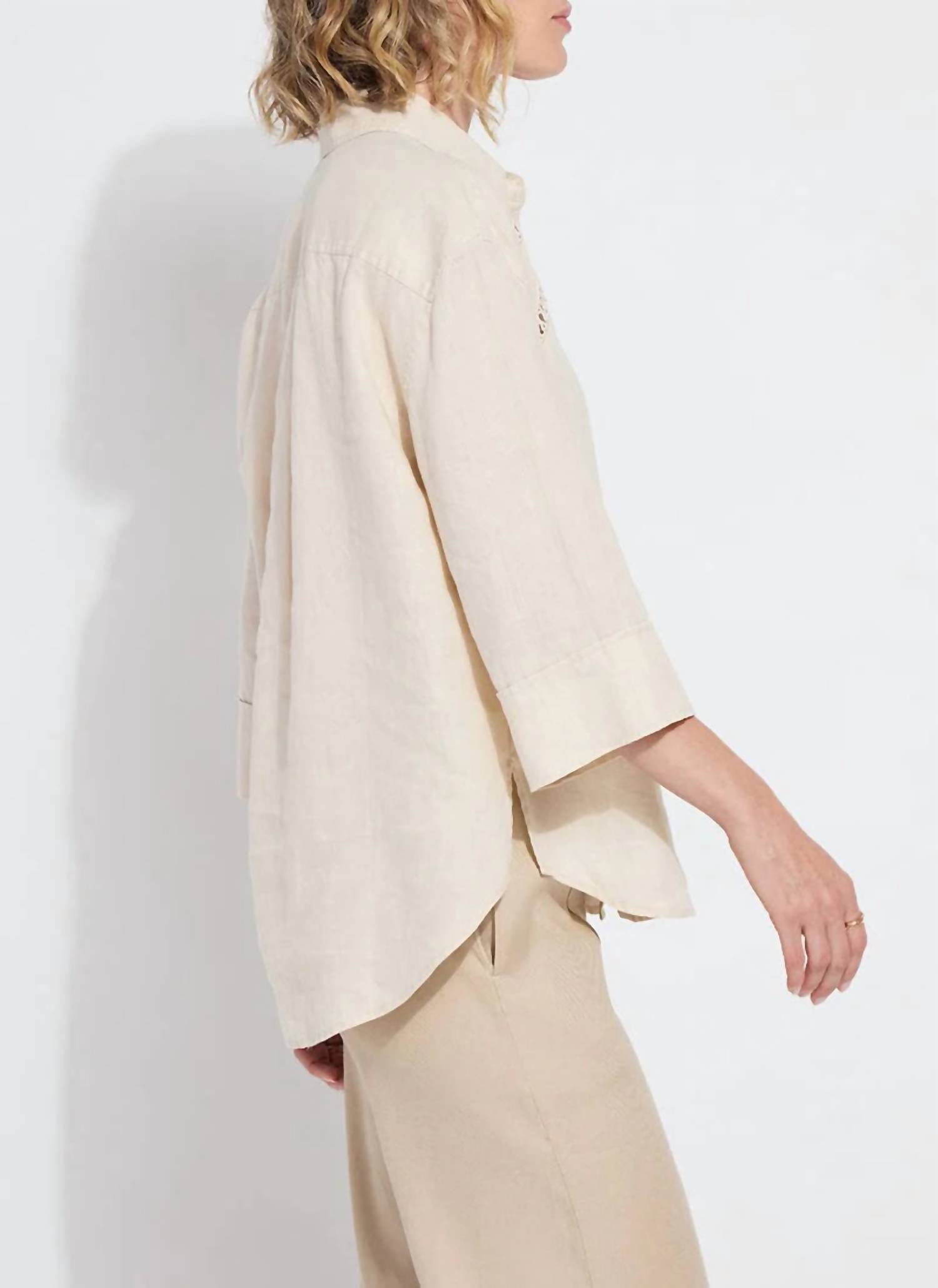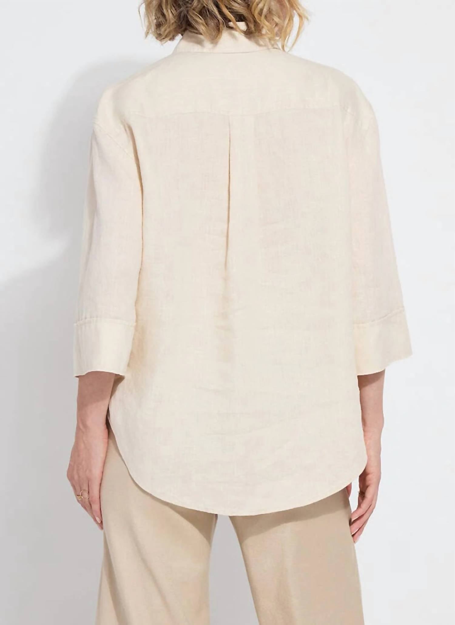 A classic button down shirt that will never go out of style. This women’s button-down shirt features three-quarter sleeves and is crafted from 100% linen, giving it a naturally relaxed fit with a luxurious softness. It showcases refined details like a double back yoke, back pleat, and embroidery on the front yoke, all complemented by a rounded high-low hem with side slits. Machine wash and line dry. Model is 5’10” and is wearing a size S.