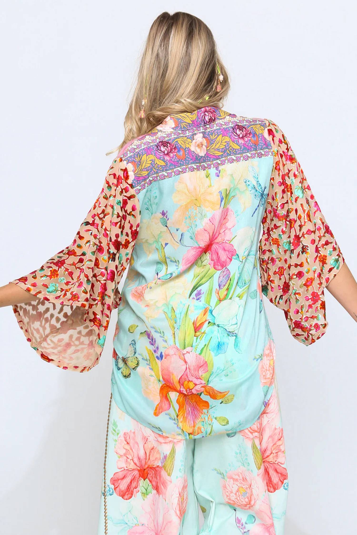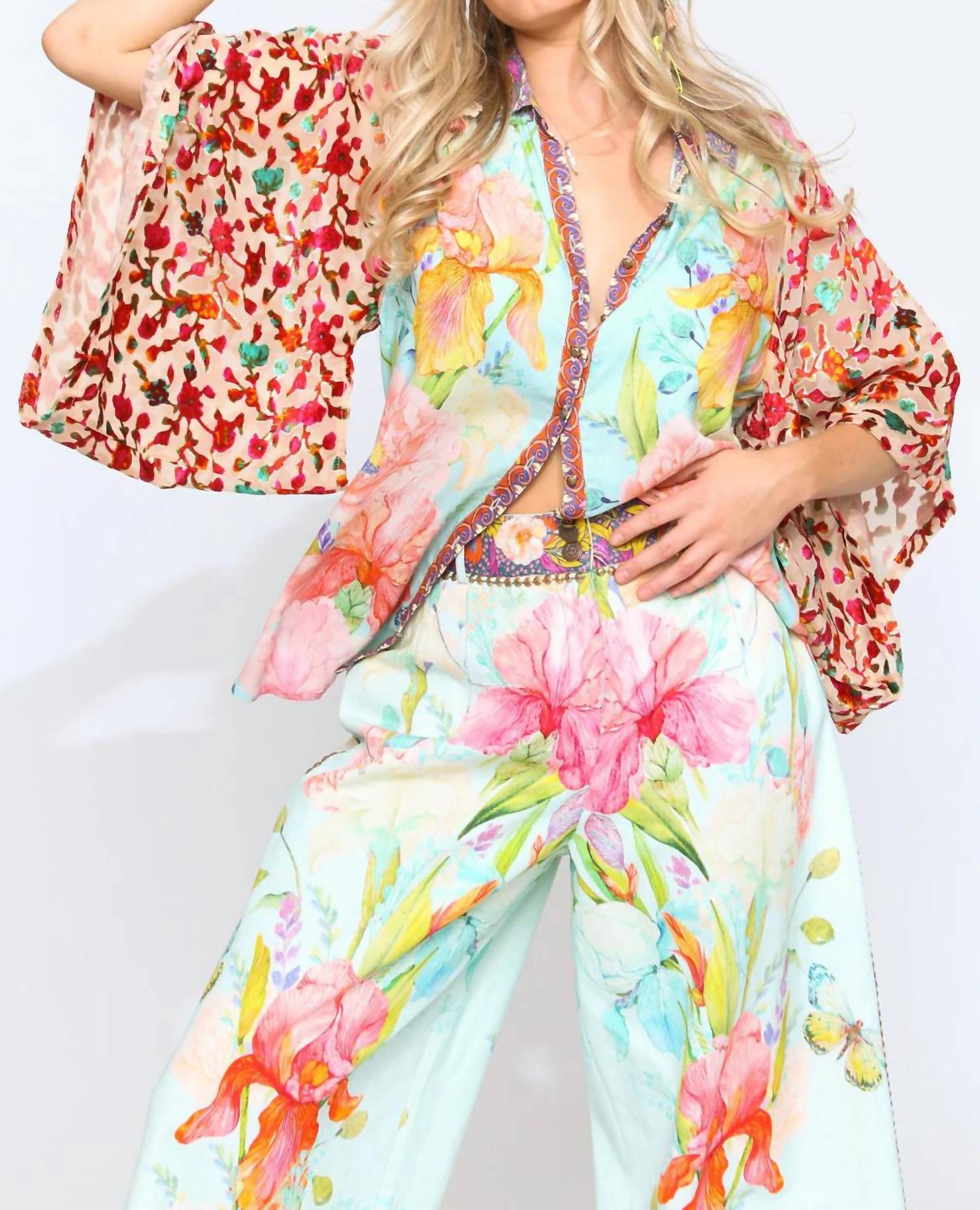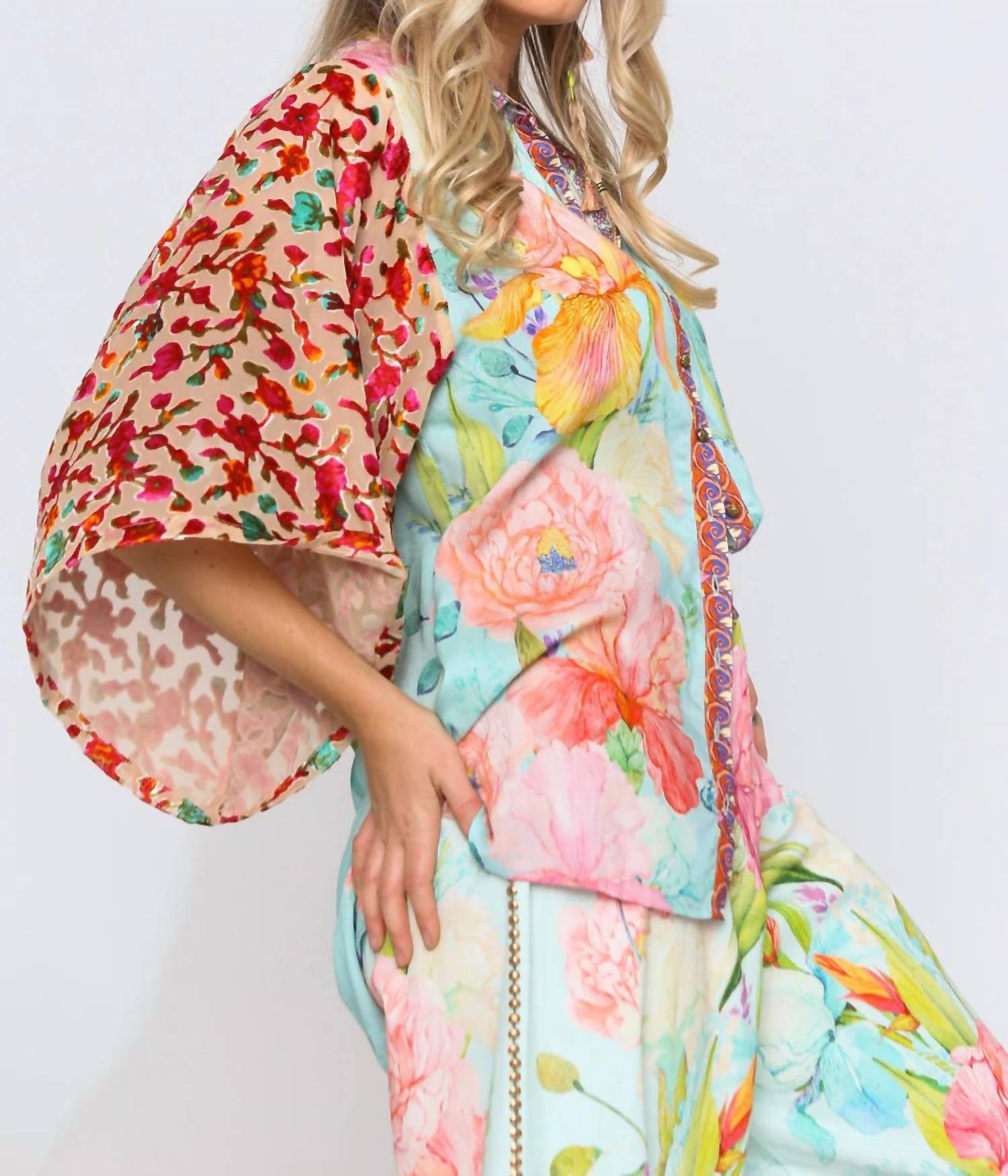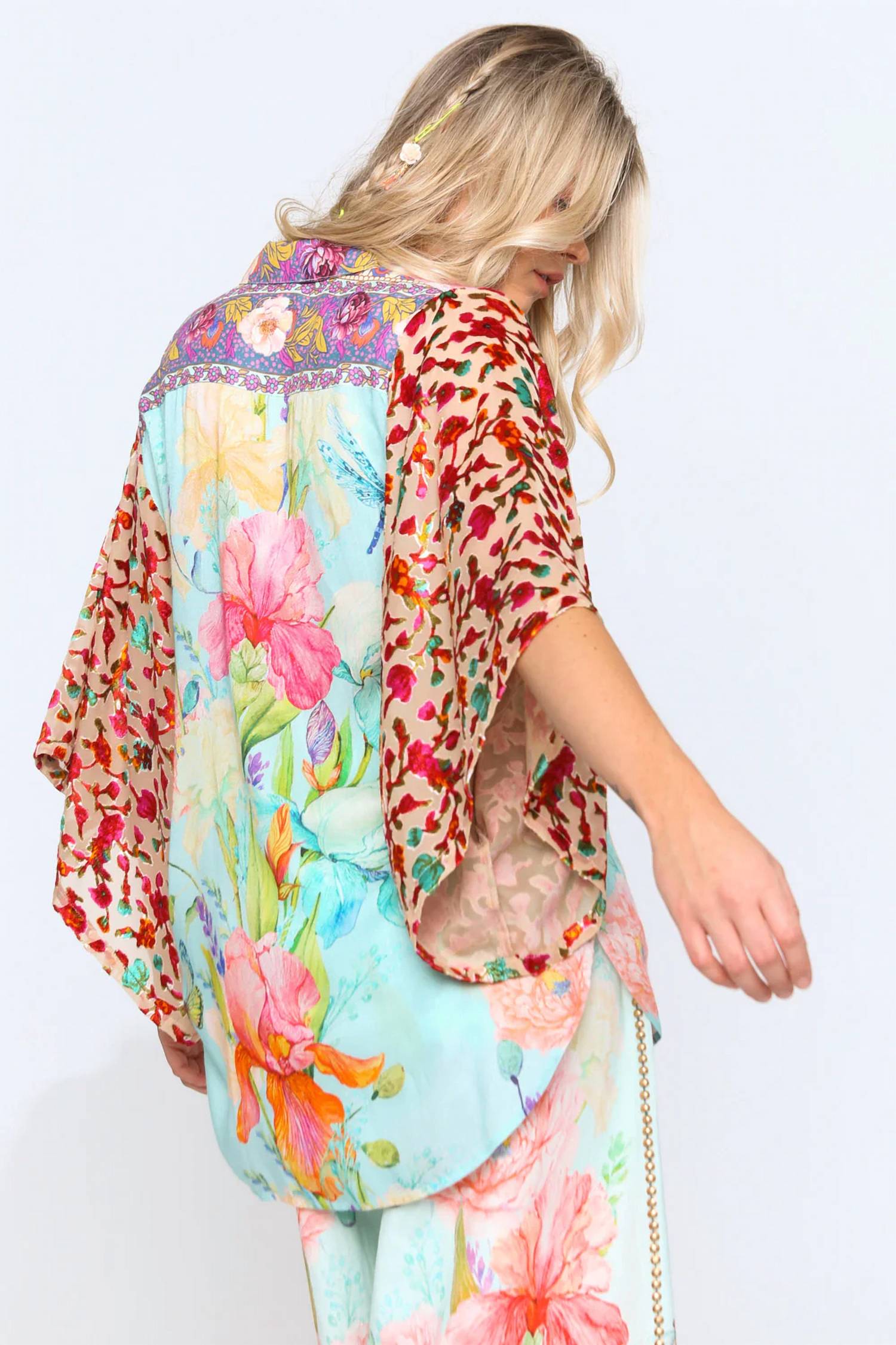 Perfectly tailored and soft to the touch. Discover the Stunning Florals Shirt by Aratta, a vibrant piece adorned with a teal floral pattern in a unique multi-color design. This eye-catching shirt features three-quarter burnout velvet sleeves and a classic collar neckline. Crafted with a self fabric of 100% Rayon and contrast fabric of 100% Polyester, it secures with a button closure. Care for it by hand washing warm with like colors and line drying.