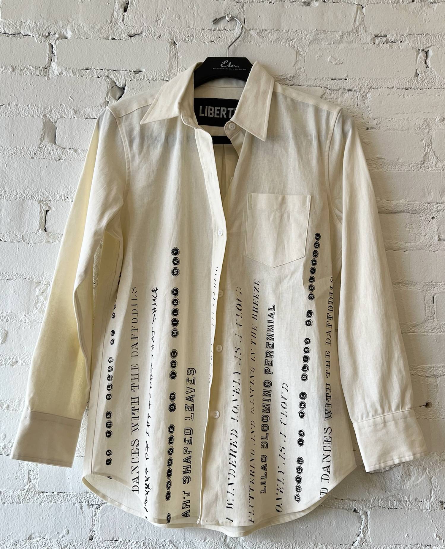 Perfectly tailored and soft to the touch. Introducing the Women's Wordsworth Classic Ecru Shirt by Libertine, a chic addition to your summer streetwear collection. Designed with long sleeves, this button-down shirt is crafted from a comfortable linen blend. Its graphic pattern and practical pocket add a stylish touch to your vacation wardrobe. Closure: Button closure.