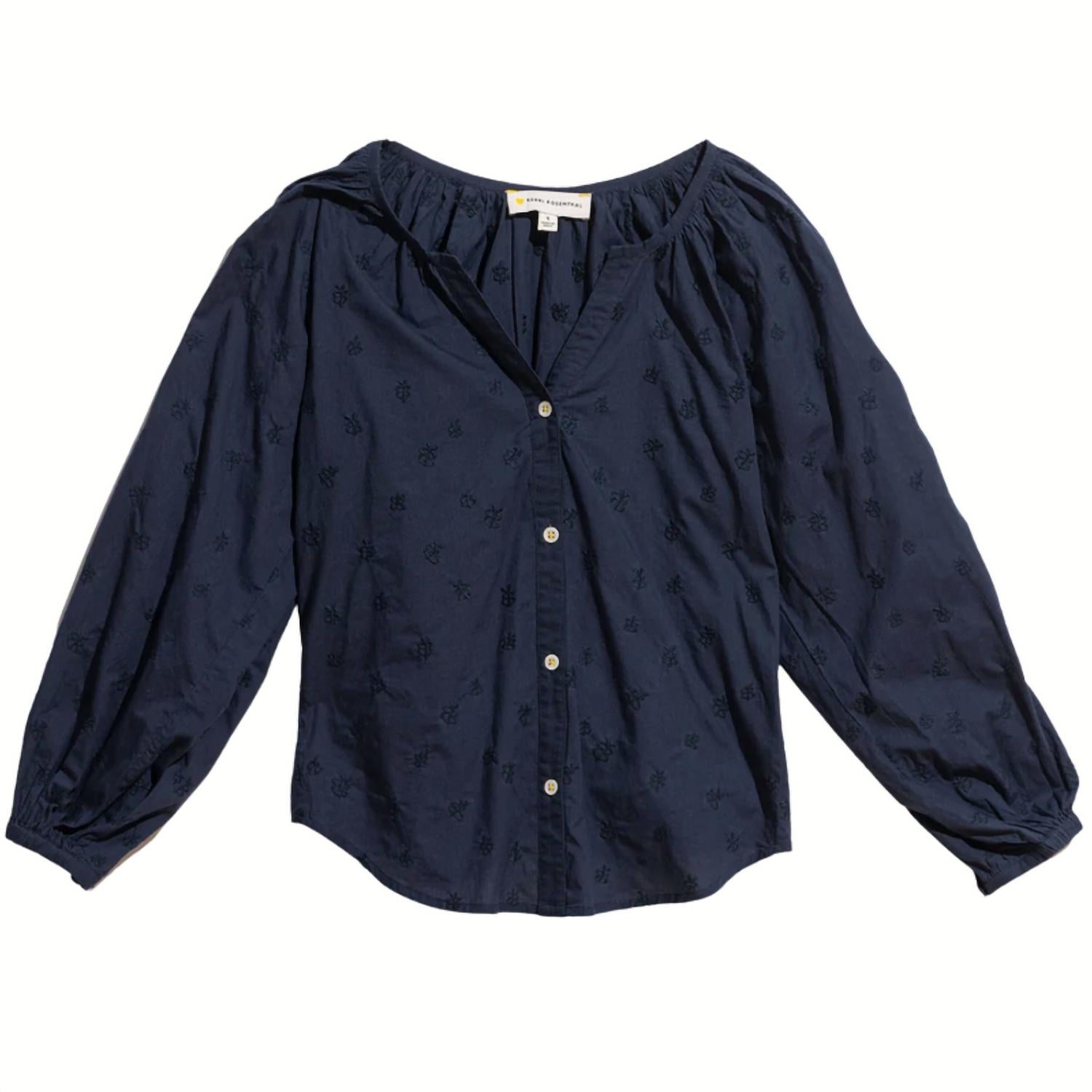 100% cotton. 24 3/4" front length (Size S). Button Front Blouse. Wrist Length Sleeves with Elastic Cuffs. Allover Floral Embroidery. Split Neckline. Curved Hem. Machine Wash Cold. Model is 5'4" and wearing a size small