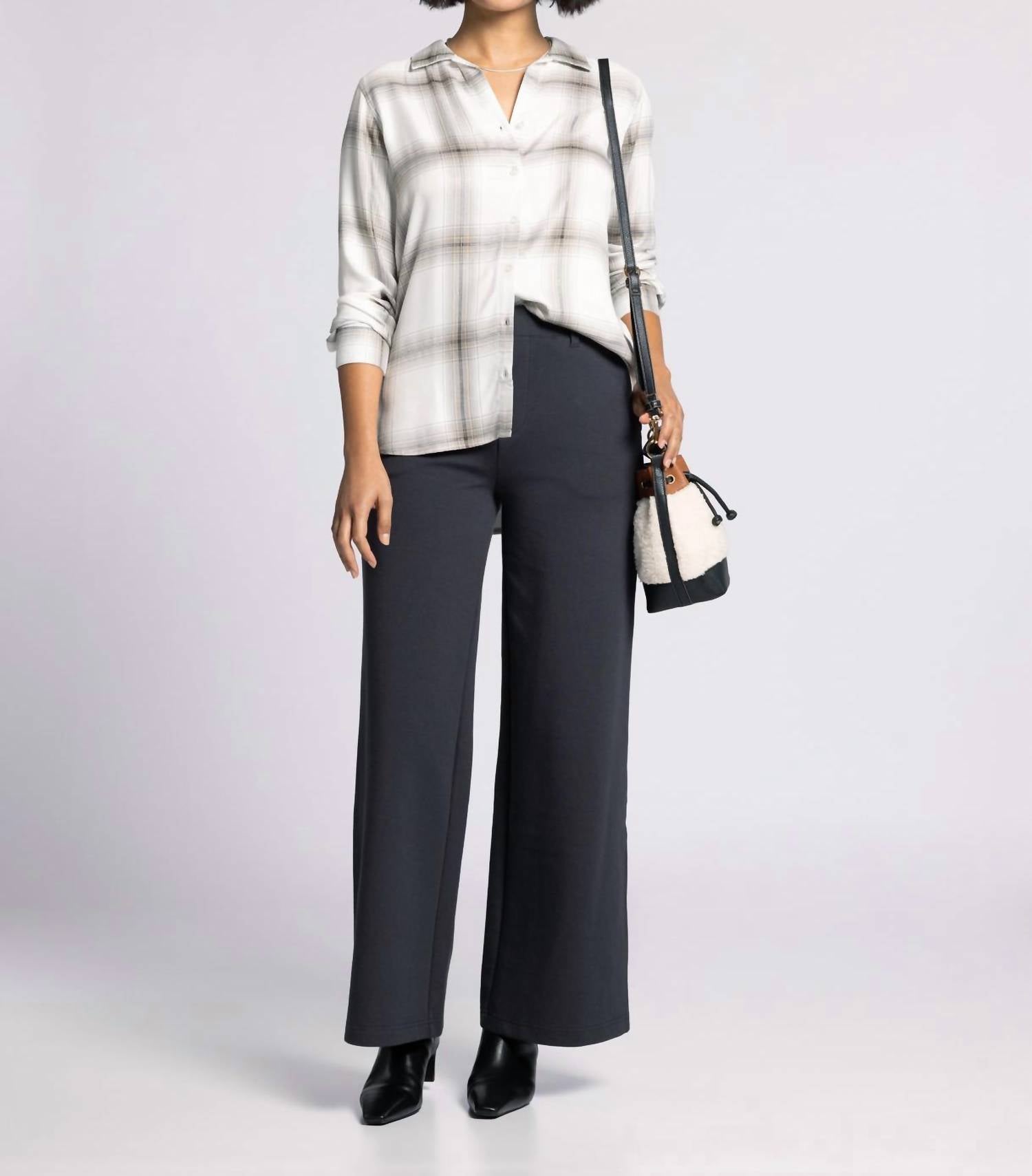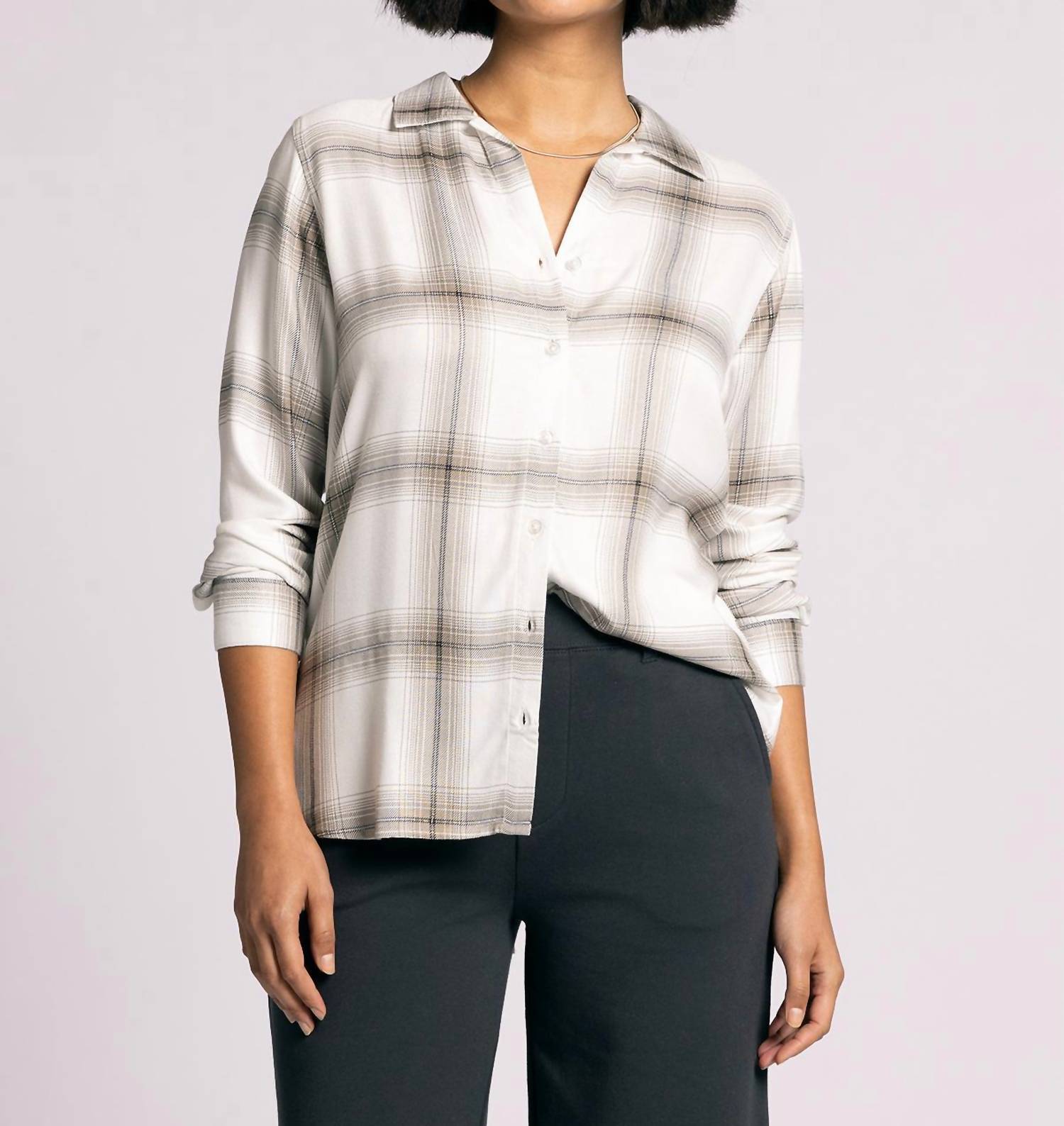 A classic button down shirt that will never go out of style. Elevate your wardrobe with the Adeline Top by Thread & Supply, where classic style meets contemporary flair. This women's button-down in Ivory Silver Plaid features a metallic yarn throughout, offering a subtle shimmer to its long sleeves and collared V neckline. Crafted from 99% Rayon and 1% Polyester, it measures 25.5" in length and 19" in chest for a flattering fit. Closure: Button closure. Care: Machine wash cold.