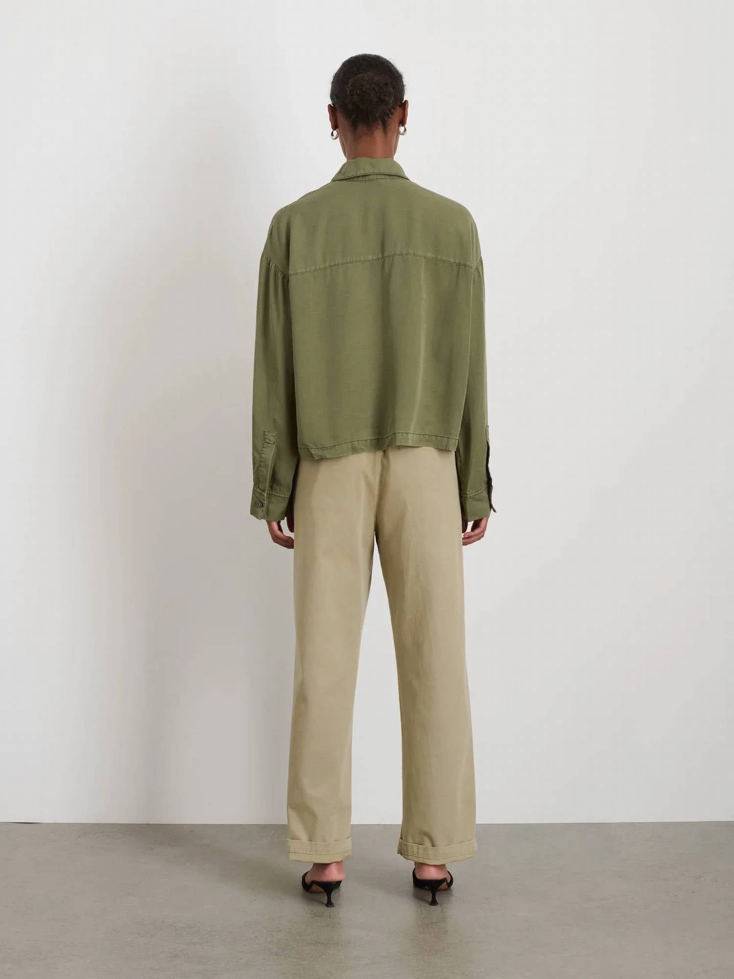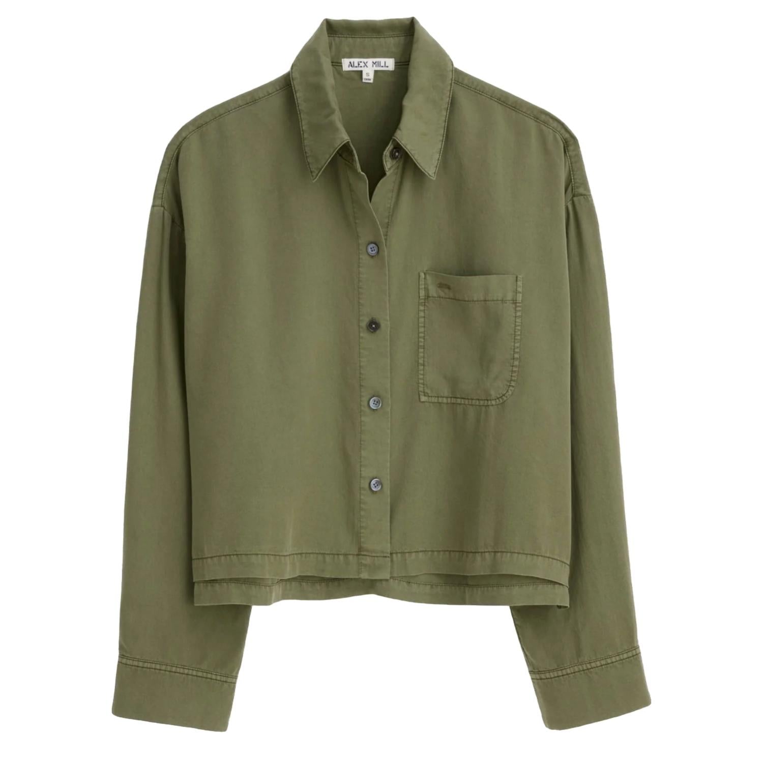 Perfectly tailored and soft to the touch. Introducing the Gemma Button Down Lyocell Shirt by Alex Mill, a stylish piece in Faded Olive tailored for modern sophistication. This cropped shirt features a chic long sleeve design with a drop shoulder and a convenient chest patch pocket, all effortlessly fastened with a button closure. Crafted from 100% Lyocell, it offers a wrinkle-resistant, drapey silhouette perfect for workwear or evening events. Garment length is 20.5 inches. Care: Machine wash.