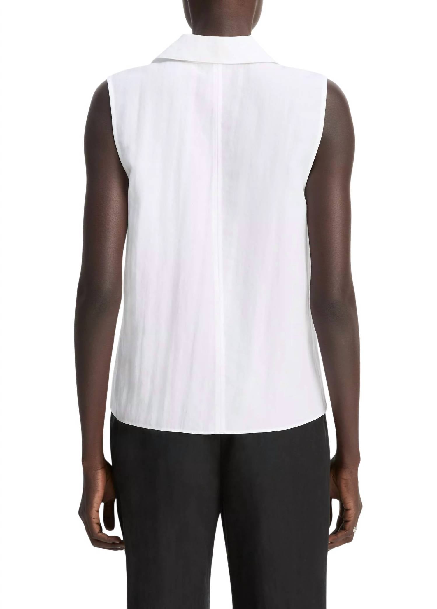 Perfectly tailored and soft to the touch. Elevate your wardrobe with the Boxy Sleeveless Button Front Shirt by Vince, crafted in a solid Optic White hue for a minimalist look. Made from a luxurious blend of 84% LENZING™ lyocell, 9% nylon, and 7% wool, this shirt promises a soft drape and textured feel. Featuring a pointed collar and a hidden button-front closure, this imported piece is perfectly versatile with a 24.75" length. Care instructions include hand wash cold with non-chlorine bleach as needed, line dry, and cool iron if necessary or opt for dry cleaning. Model wears a size S (5'10" height, 32" bust, 24" waist, 35" hips).