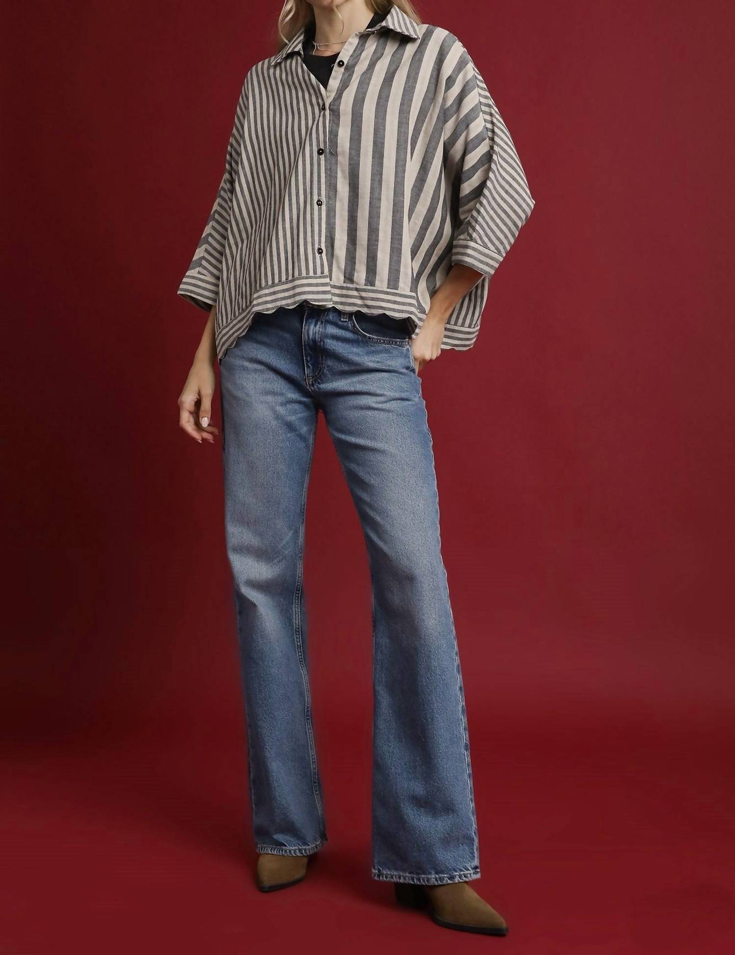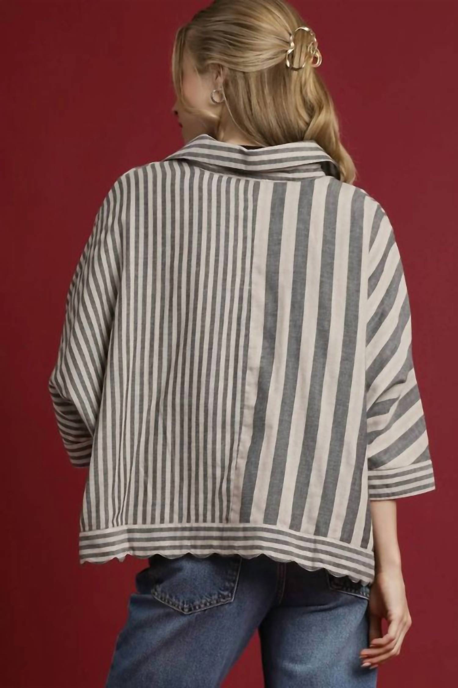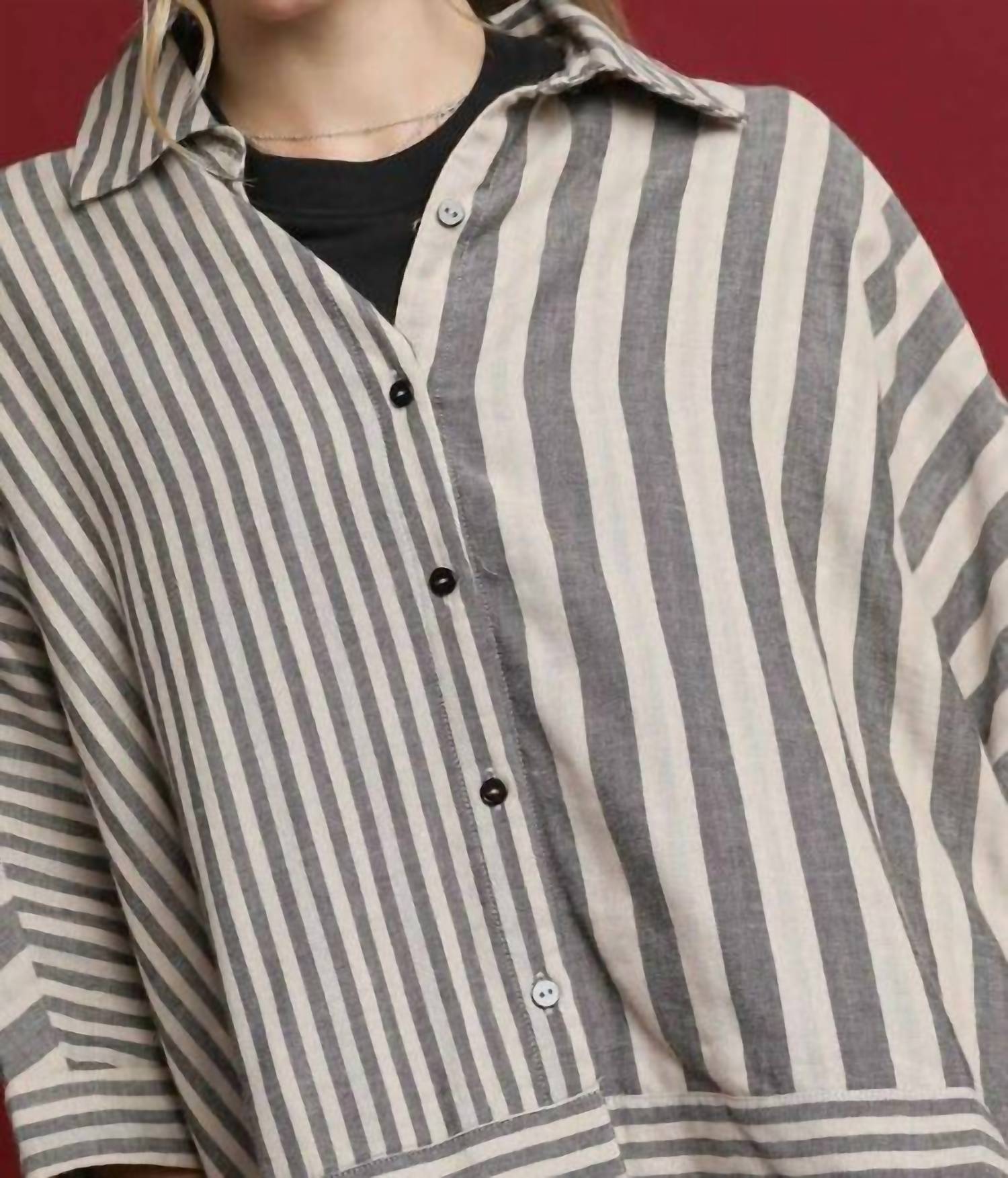 Elevate your wardrobe with the Mixed Stripe Button Down Shirt by Umgee, a chic and versatile piece in black. Featuring three-quarter sleeves with roll-tab buttons, this shirt is crafted from a cotton blend comprising 95% cotton and 5% linen. Its mixed vertical and horizontal stripe pattern along with a slight high-low cut adds a modern twist to any outfit. Closure: Button closure. Ideal for holiday parties or a casual day out, this shirt promises style and comfort for various occasions. Model is 5'9" and is wearing a size small.