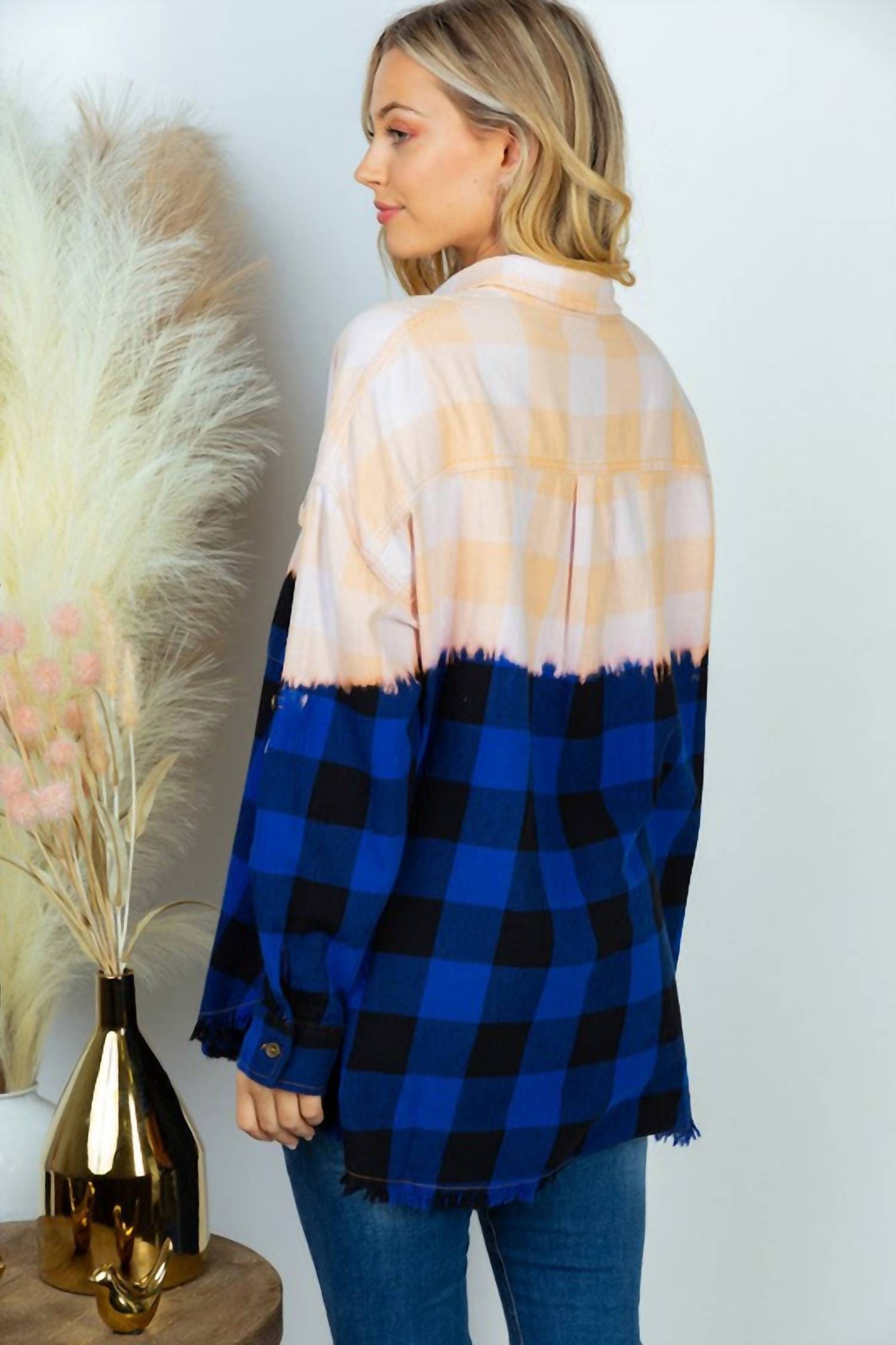 This button down shirt is comfortable yet polished. A stunning blend of blue hues in a classic plaid pattern. Featuring long sleeves and a button closure, this design also offers practical front pockets and an edgy frayed hem for a modern twist.