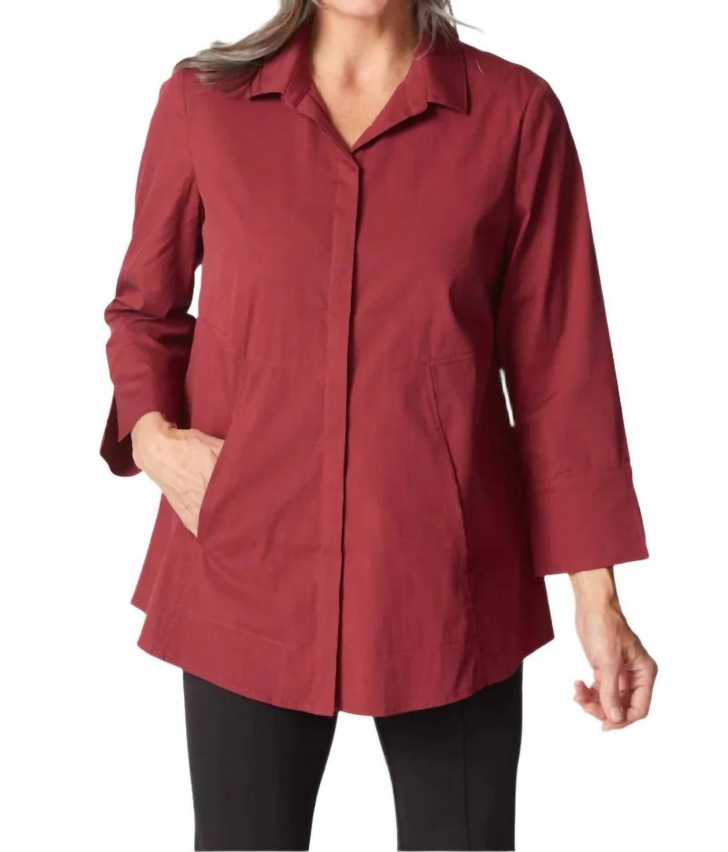 Perfectly tailored and soft to the touch. Introduce elegance and versatility to your wardrobe with the Perfect Travel Hidden Placket Shirt by Habitat, a minimalist staple in a deep wine hue. Featuring long sleeves, this A-line shirt is composed of a comfortable cotton blend, ensuring both style and ease for any summer vacation. The hidden placket with a button closure adds sophistication, while built-in pockets offer practicality. Fabric content is 78% cotton, 20% nylon, and 2% spandex; care instructions recommend machine washing cold on a gentle cycle and tumble drying at low temperatures.