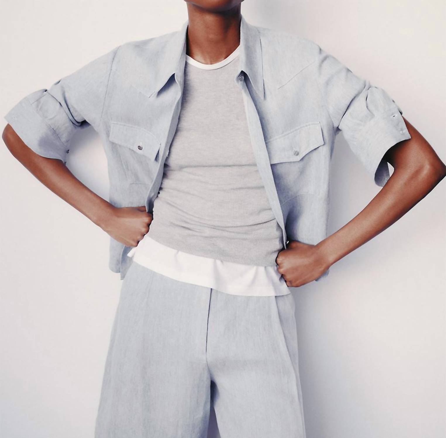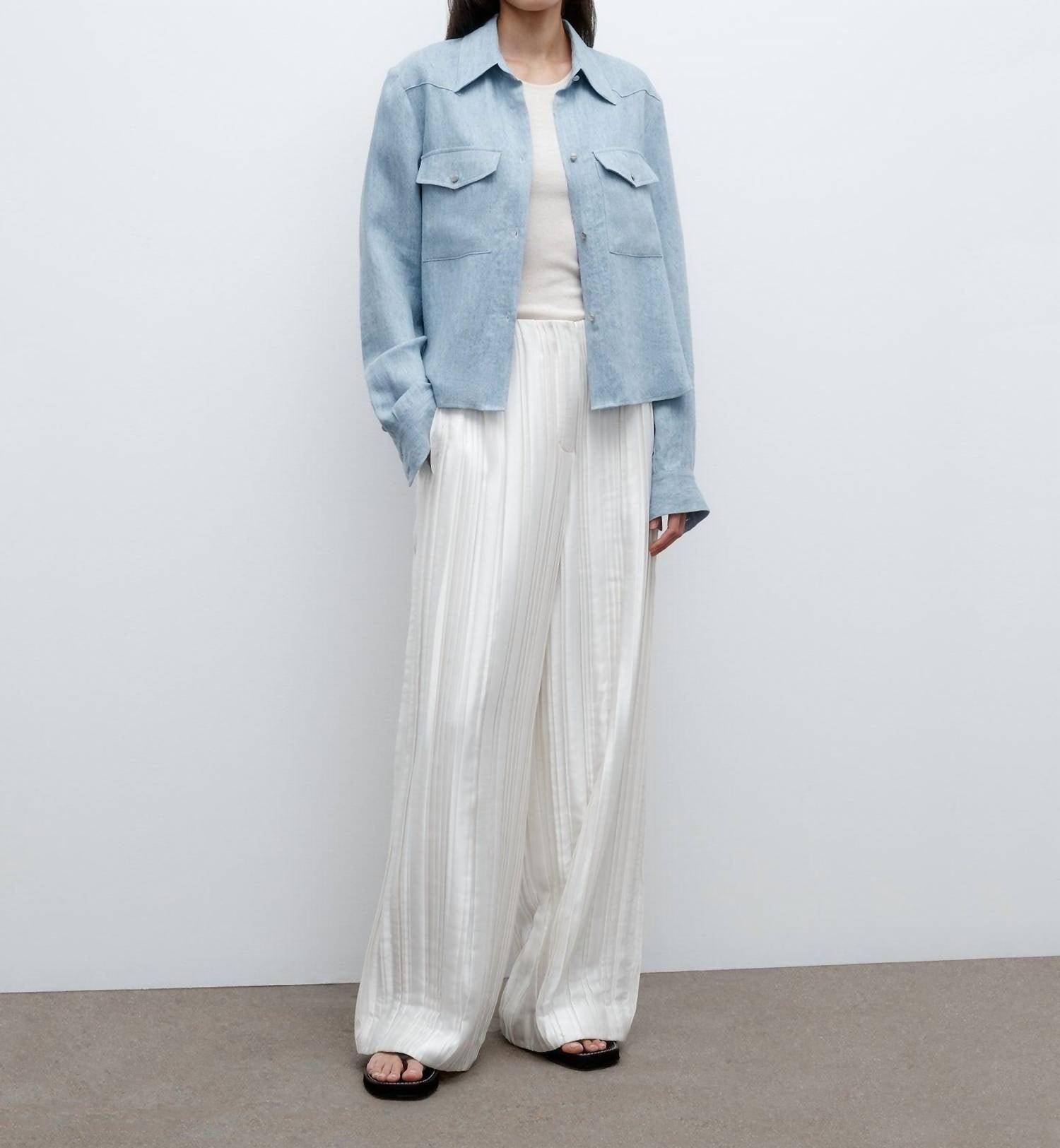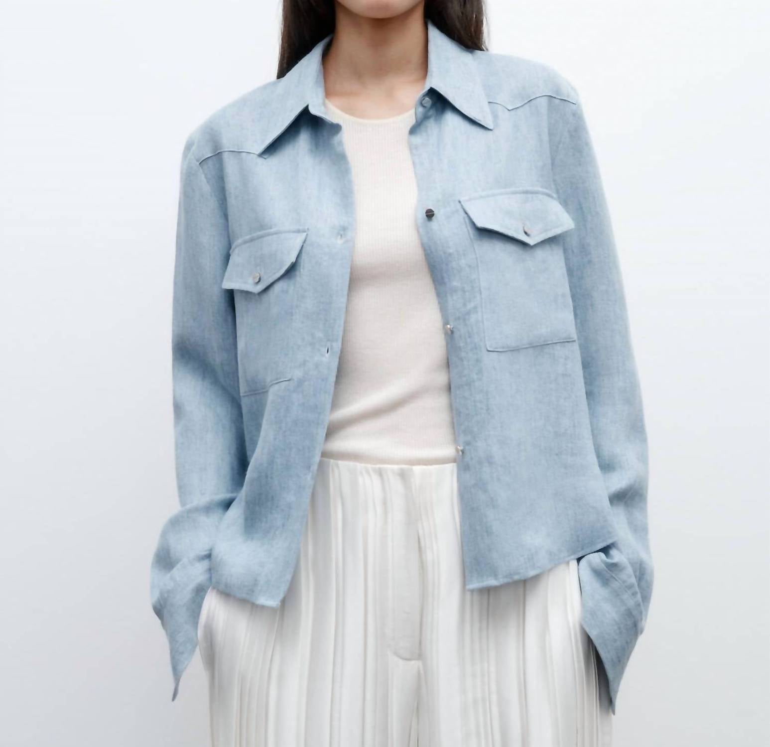 A classic button down shirt that will never go out of style. Introducing the New Carter Long Sleeve Shirt by TWP, a modern reinterpretation of the classic work shirt in a chic light indigo hue. Crafted from 100% hemp, this lightweight cropped button-up features a soft, distressed finish ideal for effortless layering. Designed with a relaxed, boxy silhouette, it includes a collar neckline, button cuffs, and practical flap chest pockets. Closure: Button closure. Care: Machine wash, line dry.