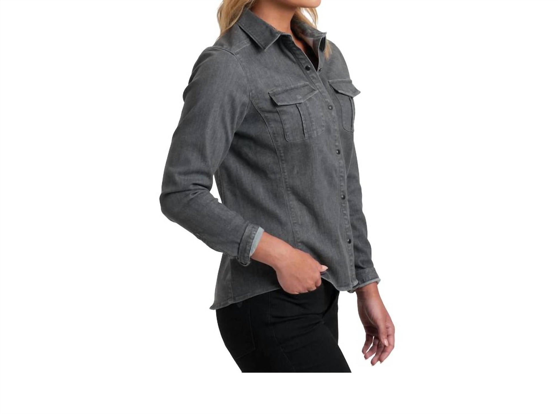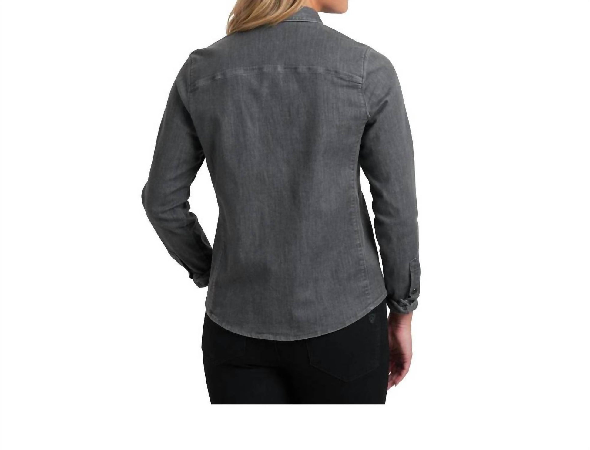 A classic button down shirt that will never go out of style. Introducing the Josie Denim Shirt by KUHL in a sophisticated Alloy shade, perfect for women seeking style and comfort. This long sleeve shirt, crafted from a soft yet durable cotton blend, offers two-way stretch for superior mobility. Designed with a snap-up closure and flattering princess seams, it features two chest pockets with hidden snaps, and subtle patterned fabric details inside the cuff and neck, making it an essential piece for workwear and casual engagements. Care for this imported shirt is simple: machine wash cold on a delicate cycle, tumble dry low, and iron at medium temperature.