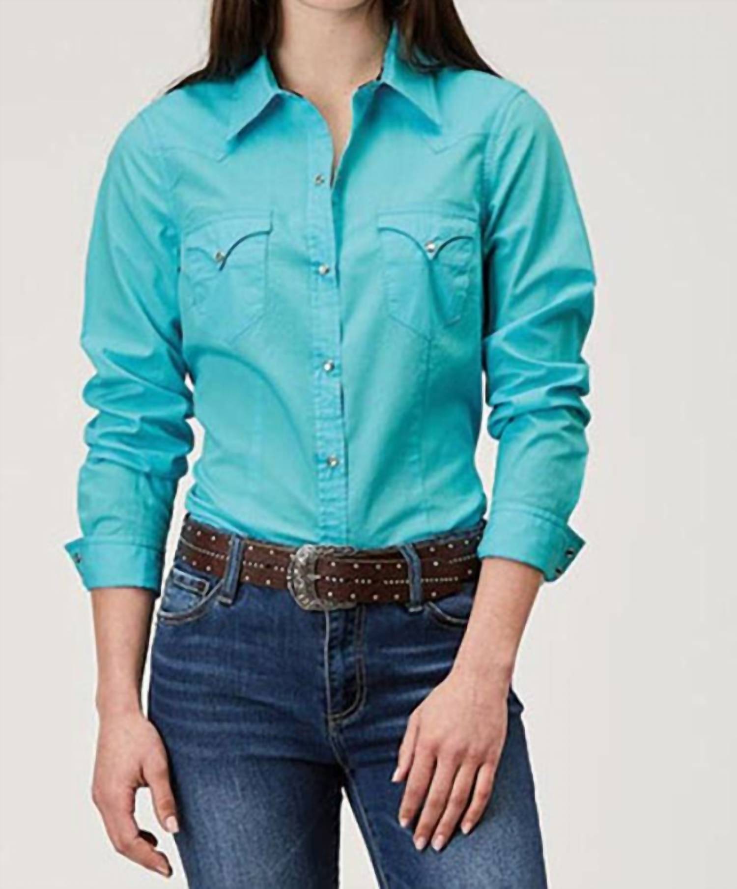 Perfectly tailored and soft to the touch. Introducing the Women's Western Snap Shirt by ROPER, a stylish addition to your summer wardrobe in a vibrant turquoise hue. This long sleeve shirt is crafted from quality cotton, ensuring comfort and breathability for your vacation outings. Featuring a solid pattern with a classic collar and practical pockets, it embodies the timeless western trend. Closure: Button closure.