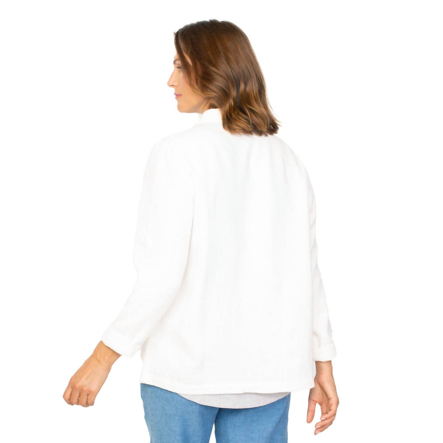 Perfectly tailored and soft to the touch. A classic, carefree style with an easygoing appeal. With two slash pockets and curved princess seams. The gently textured jacquard fabric provides volume and depth and lengthy sleeves. The hips are reached by the softly curved A-line hem. Sun Wash Jacquard Jacket Button Front; Spread Collar Front Seamed Pockets Measurements: Medium: Bust: 42” Back Length: 25” 100% Cotton Care Instructions: Wash Cold