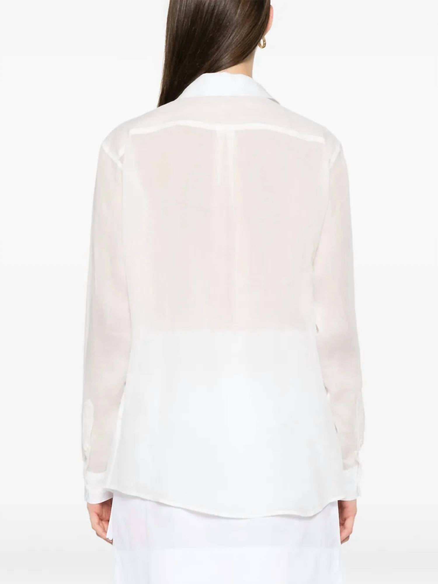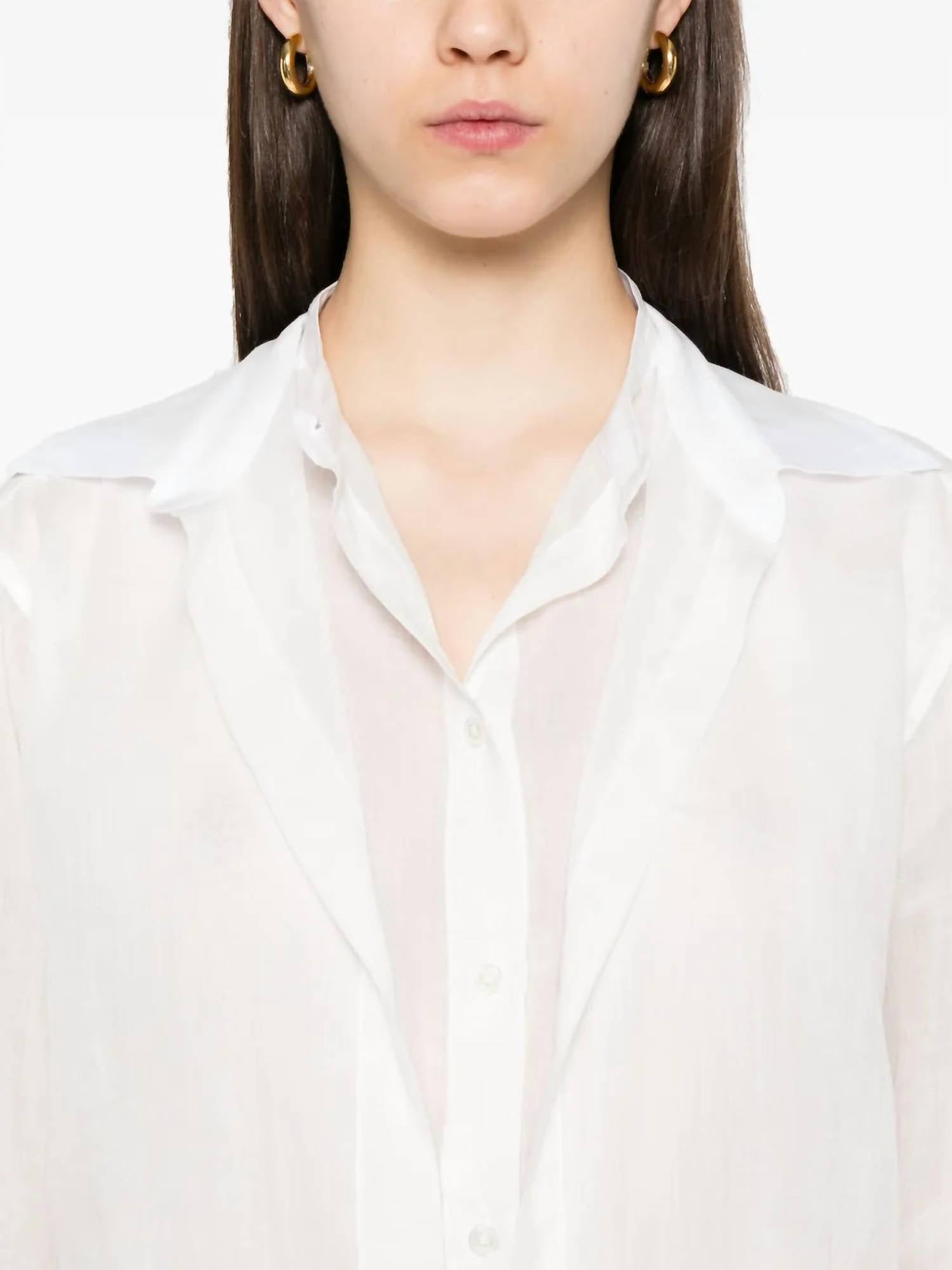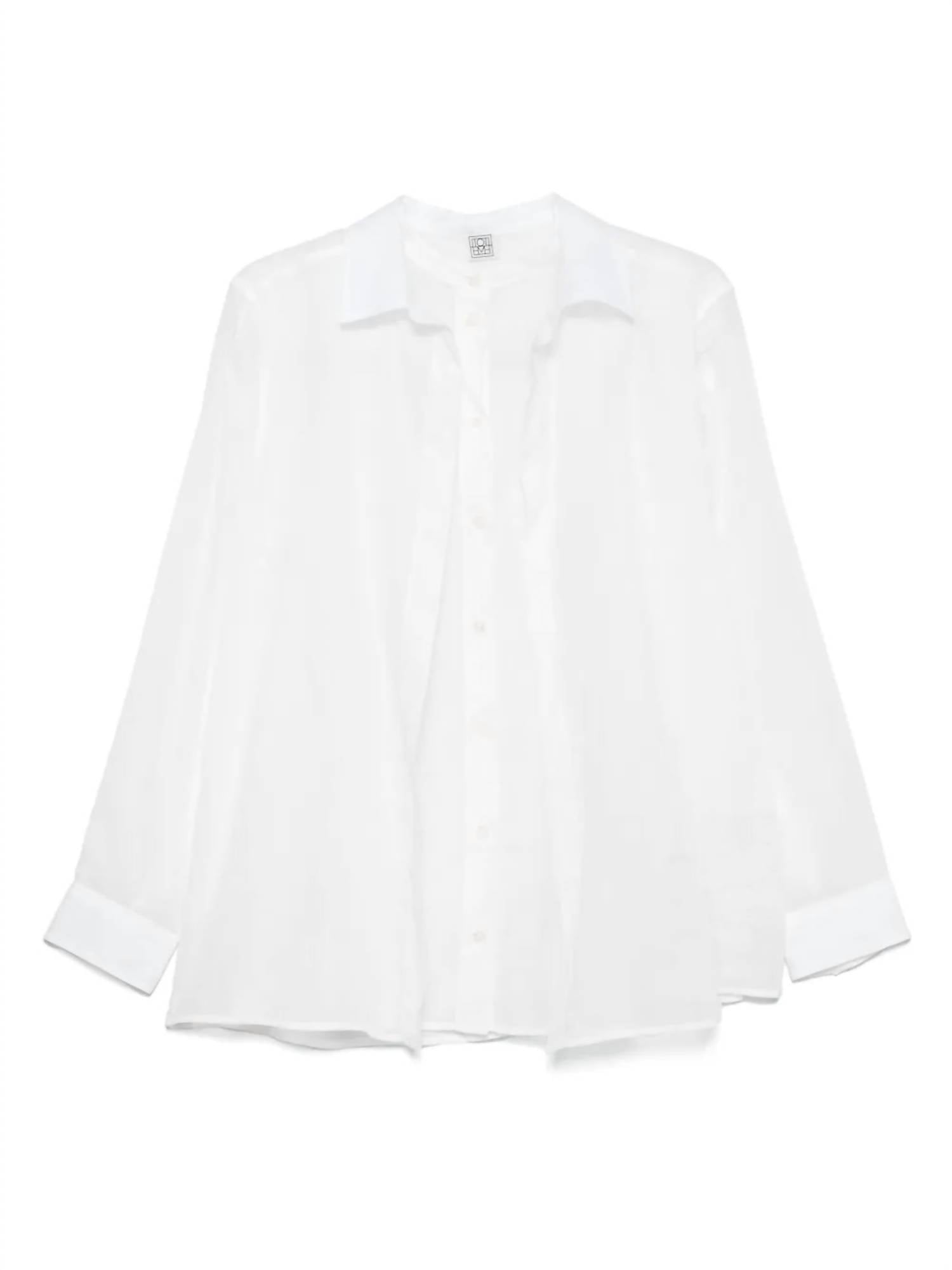 A classic button down shirt that will never go out of style. Introducing the Double Collar Shirt by TOTEME, a standout piece designed with the season's layering theme in mind. This women's button-down shirt is crafted from 100% ramie, offering a semi-sheer, relaxed fit that exudes a preppy yet relaxed attitude. The shirt features a solid white color and long sleeves, complemented by a classic collar and button closure. Made to effortlessly enhance your holiday party wardrobe, it is imported and can be machine washed for easy care.