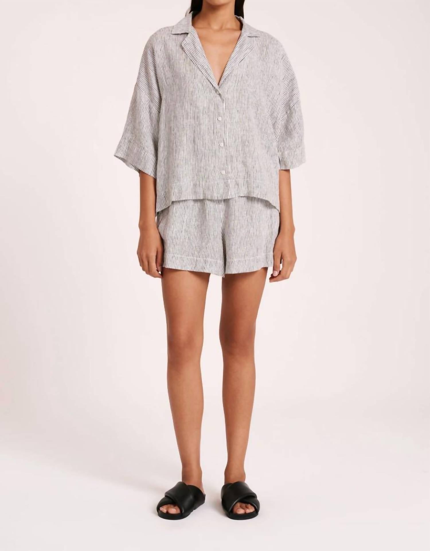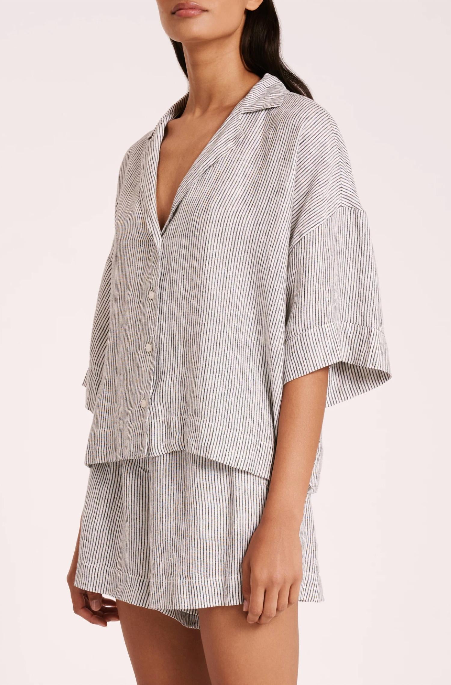 A classic button down shirt that will never go out of style. Elevate your summer wardrobe with the Nude Lucy Lounge Stripe Linen Shirt in a chic pinstripe pattern, perfect for minimalist and vacation looks. Crafted from 100% organic French linen, this shirt offers a soft and breathable feel, making it ideal for warm weather occasions. The design features a wide collared neckline and wide elbow-length sleeves, providing a clean and casual fit with a classic button closure. While washing details are not provided, its premium quality ensures effortless style throughout the season.