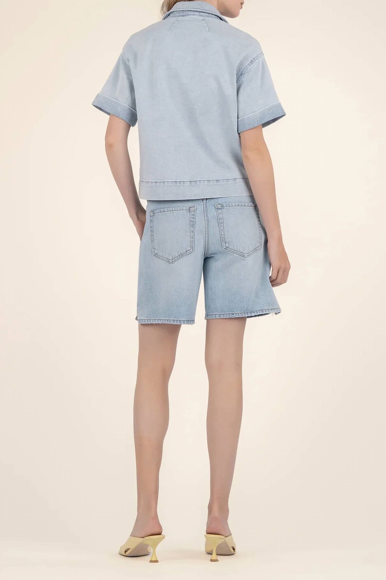 A classic button down shirt that will never go out of style. The Kiko Boxy Camp Shirt by KUT from the Kloth is a stylish choice for a concert-ready look. It features short sleeves and is crafted from a blend of 93% cotton, 6% polyester, and 1% spandex, with a total length of 22 inches. This light wash denim shirt comes with a spread collar, dropped shoulders, and functional chest patch pockets. Closure: Button closure. Care Instructions: Machine wash. Perfect for a vintage vibe this spring.