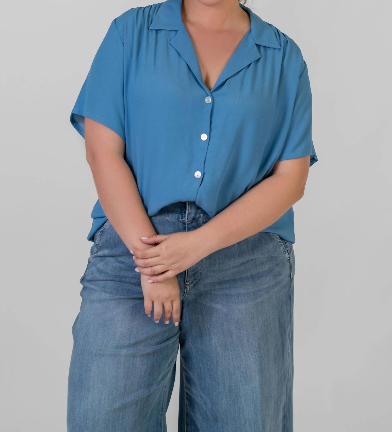 This button down shirt is comfortable yet polished. Introducing the Camp Shirt by Karen Kane, a stylish choice in Baltic Blue tailored for a relaxed fit. This women's shirt features short sleeves and a classic collar, crafted from luxurious viscose. Its solid pattern is accentuated with a button closure for easy wear. Care for this garment by dry cleaning only to maintain its textured pebble crepe finish.