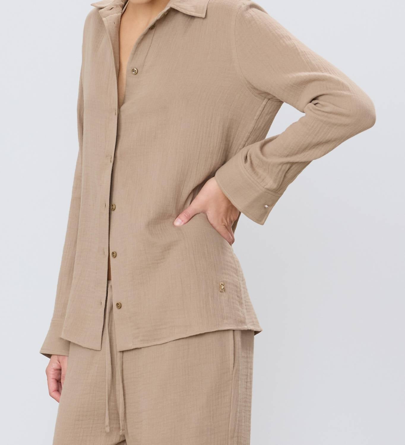 Perfectly tailored and soft to the touch. ÉTERNE's Constance Top in taupe combines elegance and comfort with its long sleeves and classic collared neckline. Made from lightweight, breathable cotton gauze, this button-down shirt features a textured pattern and offers a tailored fit, perfect for a minimalist summer wardrobe. Closure: Button closure. Care: Machine wash and tumble dry.