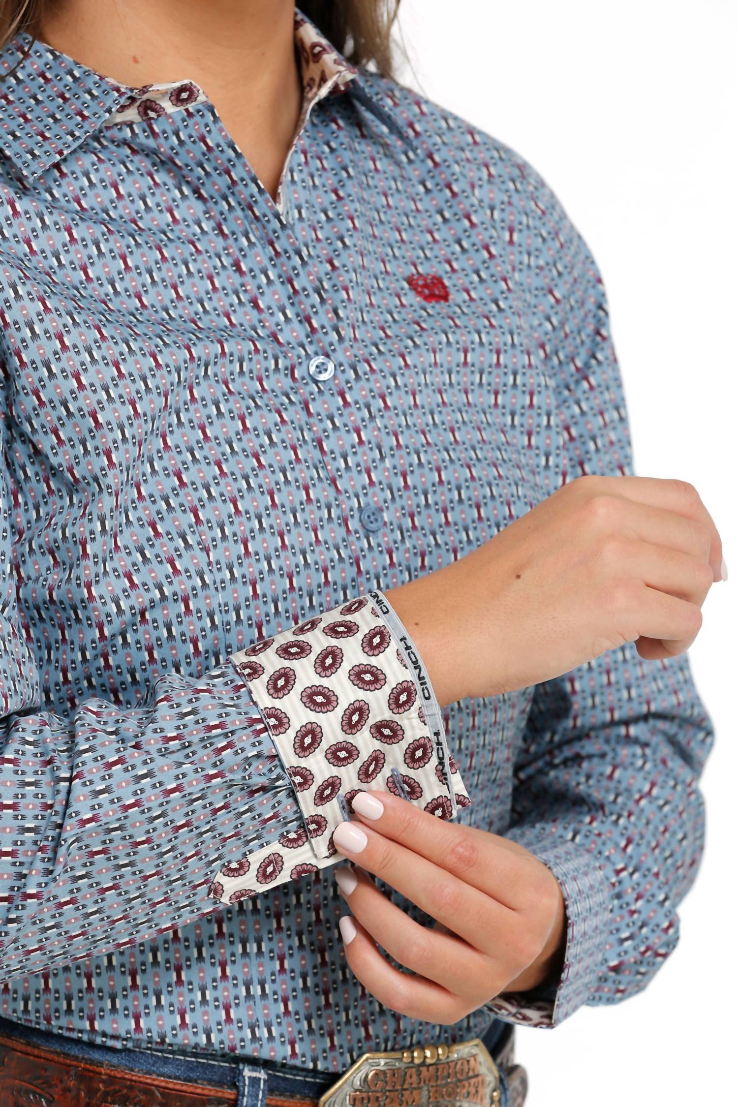 A classic button down shirt that will never go out of style. Introducing the Women's Geo Button Long Sleeve Shirt by CINCH, a stylish and durable choice in patterned blue. Crafted from 100% premium grade cotton, it combines classic single-needle tailoring with reinforced double needle stitching for superior comfort and durability. Featuring long sleeves, contrasting cuffs, and a neat collar, this shirt is designed with a button closure and a functional pocket, ideal for spring and holiday parties. Proudly designed in the USA, this garment perfectly marries craftsmanship with timeless style.