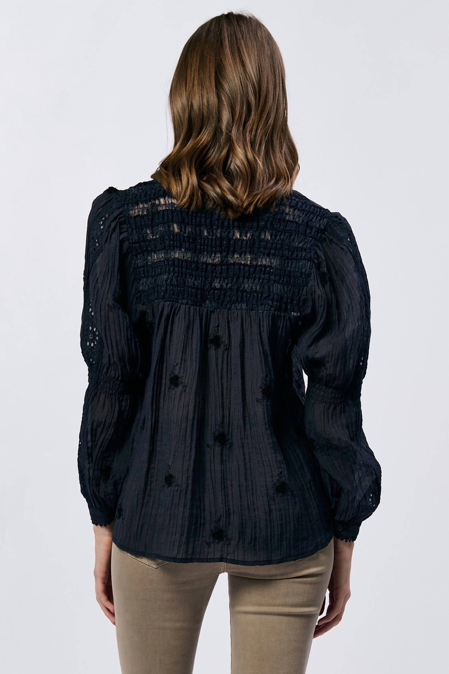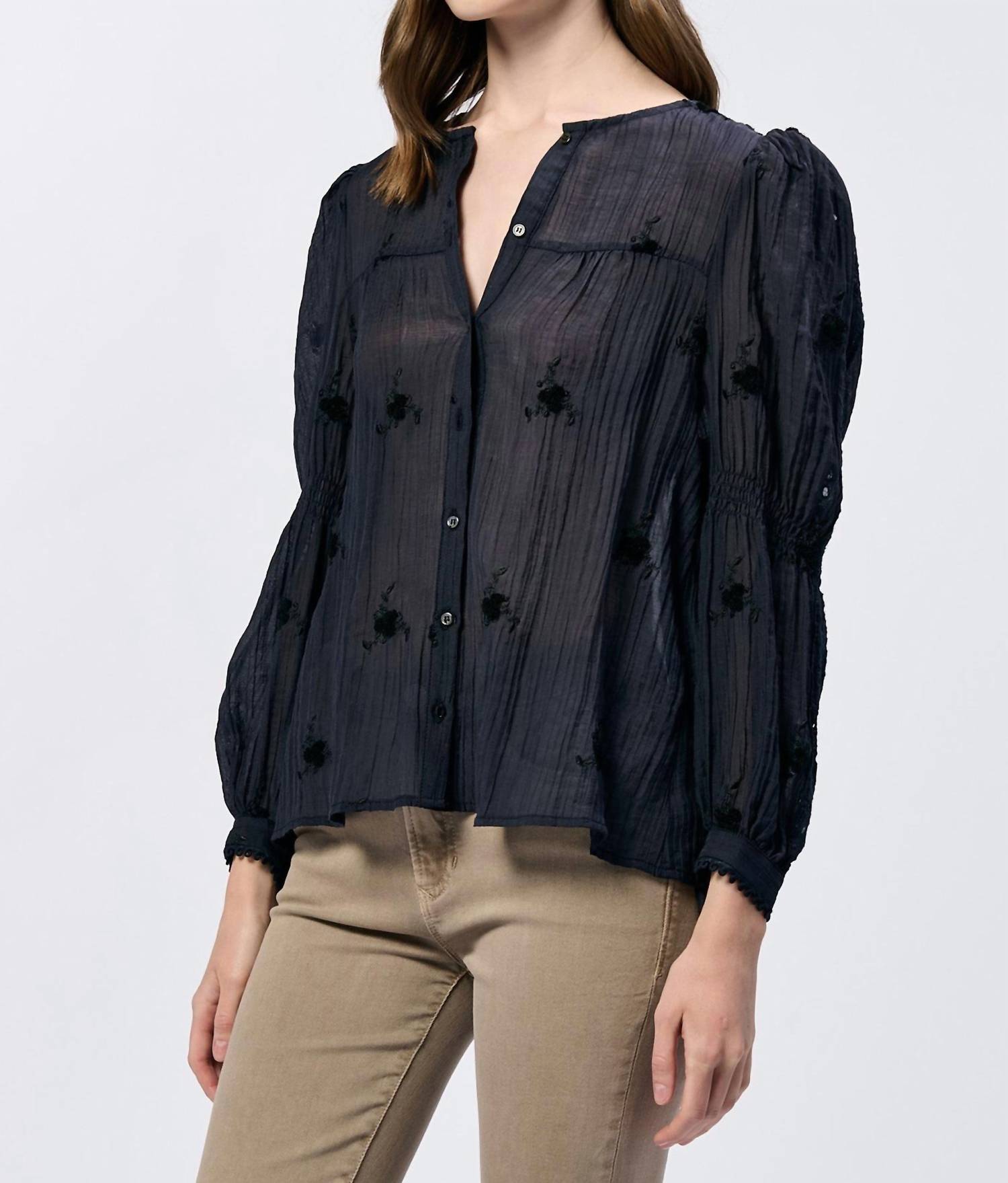 This button down shirt is comfortable yet polished. Introducing the Anna Lisa Button Up Long Sleeve Relaxed Fit Shirt by Dear John Denim, a must-have for any wardrobe in the elegant Black Iris color. With its long sleeves and V-neck design, this shirt is crafted from a comfortable nylon blend, offering a relaxed fit with a subtle textured pattern. Closure: Button closure. Care: Machine wash and line dry. Garment length: 25 inches.