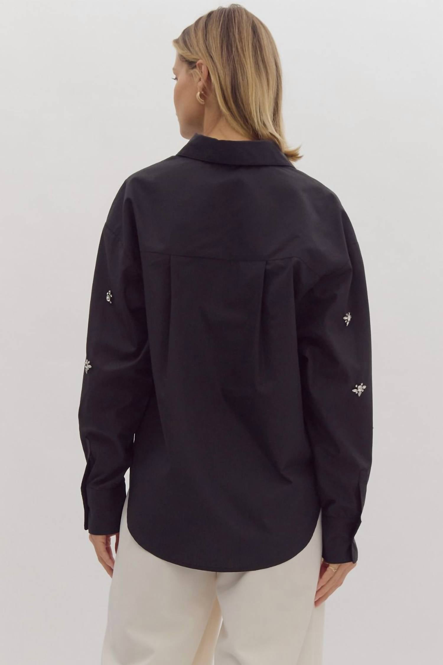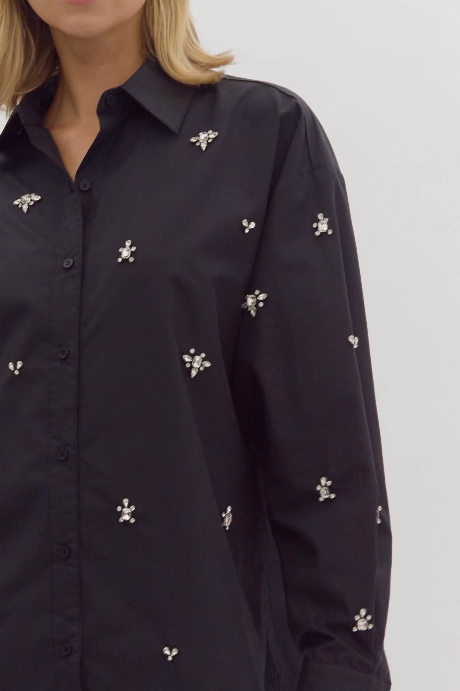 This button down shirt is comfortable yet polished. Introducing the Shine Bright Button Up Top by Entro, a chic black button-down shirt that effortlessly enhances any wardrobe. This long sleeve top is crafted from a lightweight woven fabric composed of 80% Polyester and 20% Cotton, and showcases elegant rhinestone details for added flair. The chic collared neckline and button closure at the cuffs ensure a polished finish. Designed for comfort and style, the model stands at 5'10" and is wearing a size small.