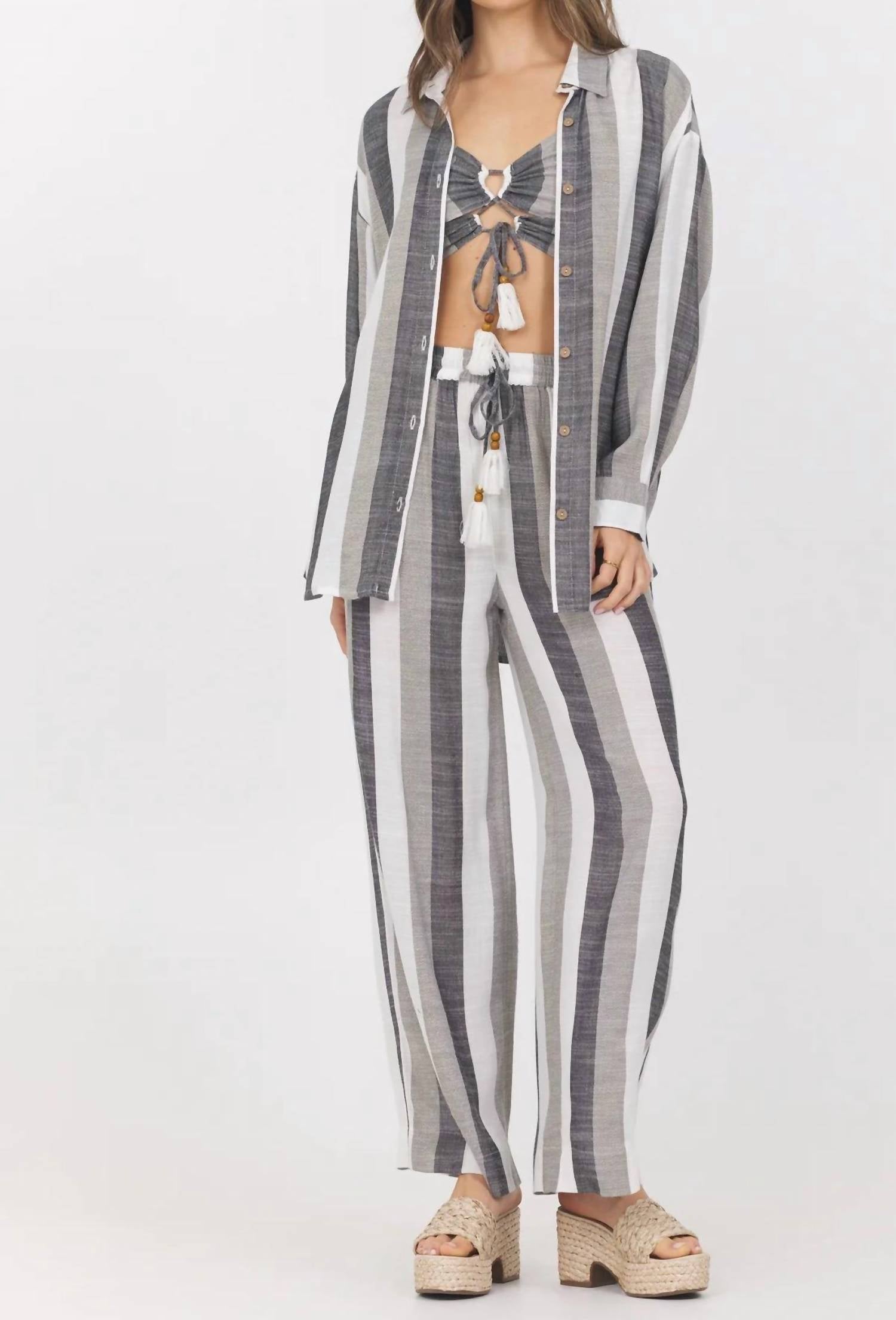 Perfectly tailored and soft to the touch. Vintage Havana presents the Metallic Button Shirt, a stylish and breathable option crafted for women's everyday wear. This long sleeve shirt in black, white, and grey features a striking stripe pattern that adds sophistication to a classic silhouette. Made with a collar neckline, it closes with a convenient button closure.