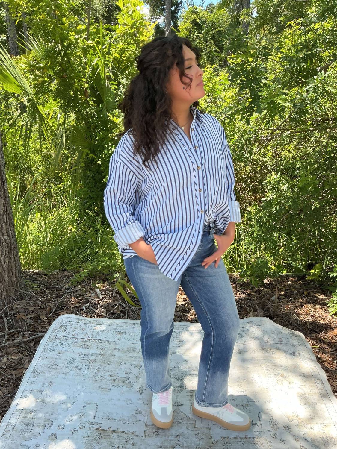 A classic button down shirt that will never go out of style. Introducing the Entro Textured Stripe Long Sleeve Button Down Shirt, a stylish addition to your wardrobe available in Chambray Blue. This shirt features long sleeves and a classic collar, complemented by a textured stripe pattern for a chic look. The shirt has a button closure, ideal for mixing comfort with style. Perfect for holiday parties, it seamlessly blends a playful pleated drape hem at the back for added flair.