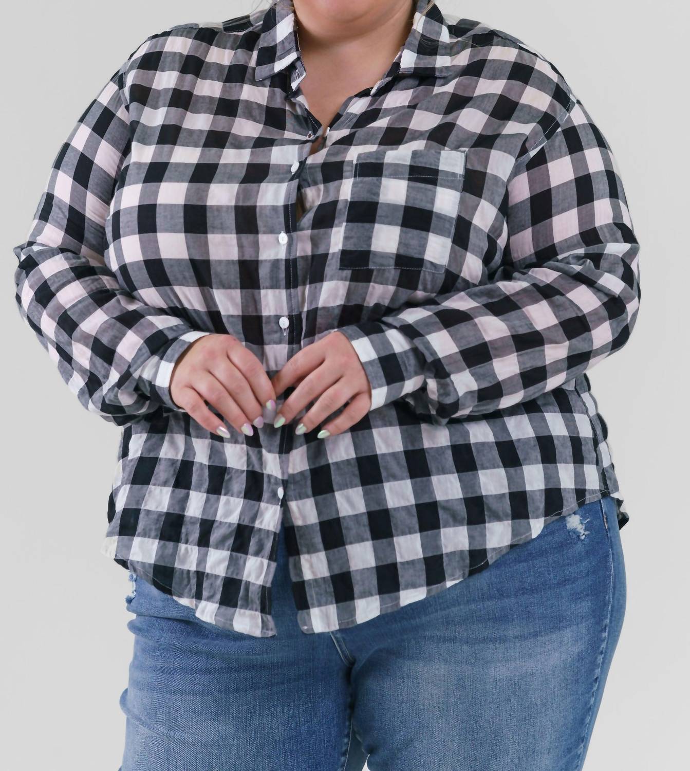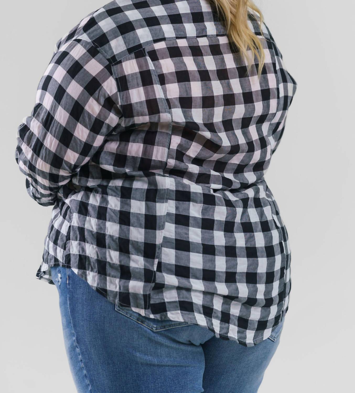 Perfectly tailored and soft to the touch. Elevate your wardrobe with the Kat Button Down Shirt by Jill McGowan, designed exclusively in plus sizes. This stylish piece features long sleeves and is crafted from 54% Cotton, 45% Viscose, 1% Other Fiber in a sophisticated black and white plaid pattern. With a classic collar and button closure, it perfectly embodies the workwear trend for the spring season. Care: Hand wash and line dry to maintain its chic look, making it ideal for holiday parties and Easter celebrations.