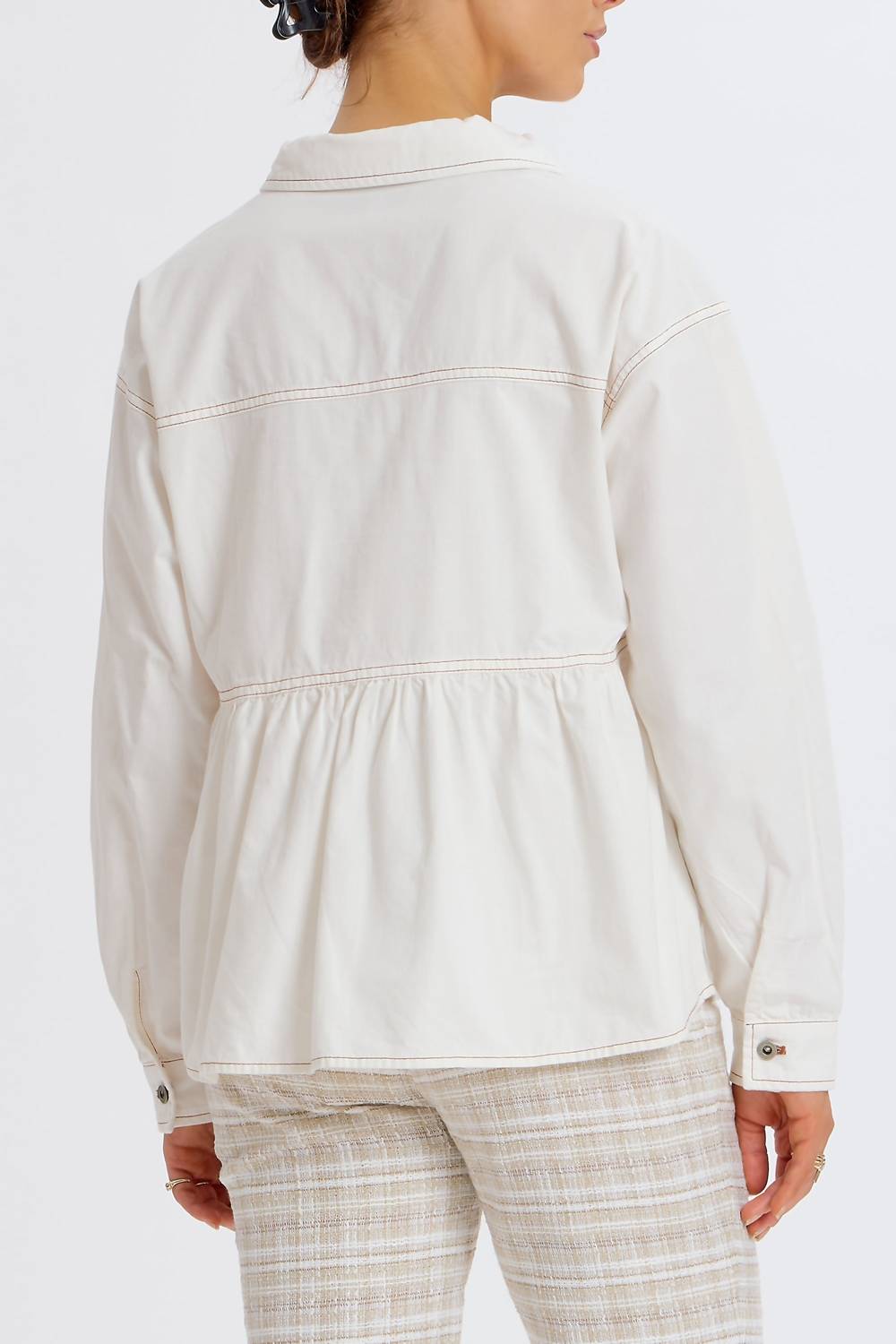 A classic button down shirt that will never go out of style. Elevate your style with the Chambray Peplum Shirt by SOMETHING NAVY, a chic piece perfect for both formal events and casual outings. Designed with long sleeves and a classic collar, this solid ivory blouse highlights a minimalist trend with its flattering silhouette. Closure: Button closure. Crafted without pockets, this shirt maintains a sleek and seamless look for women seeking both comfort and elegance.