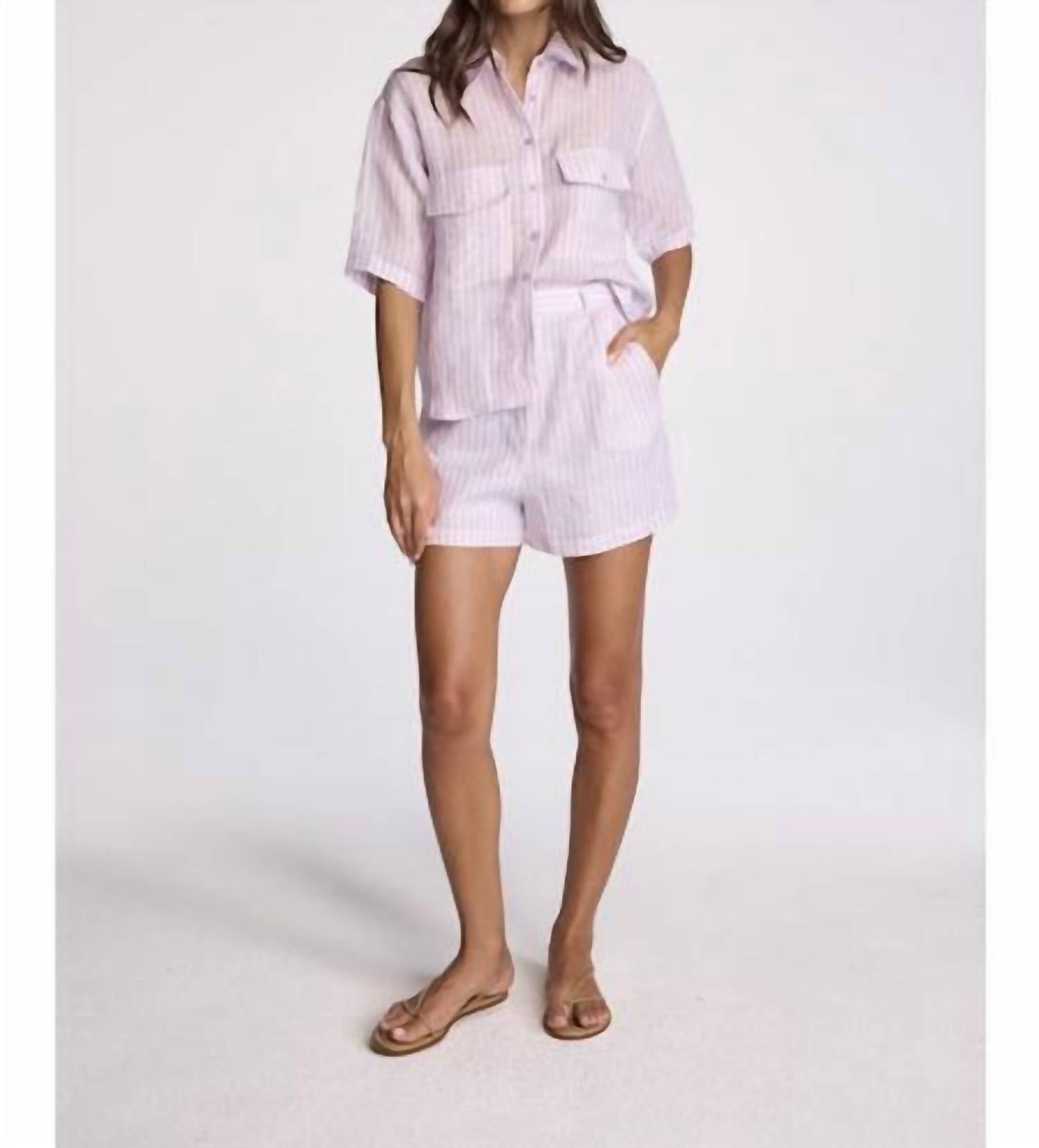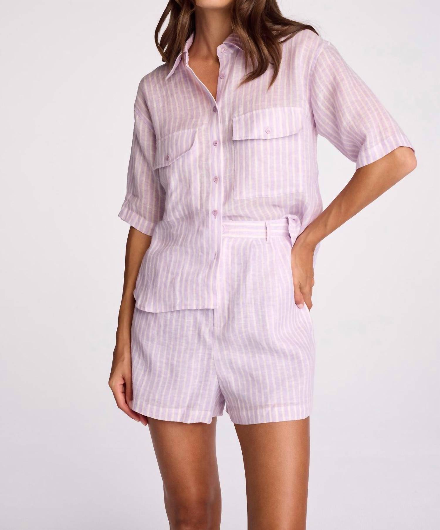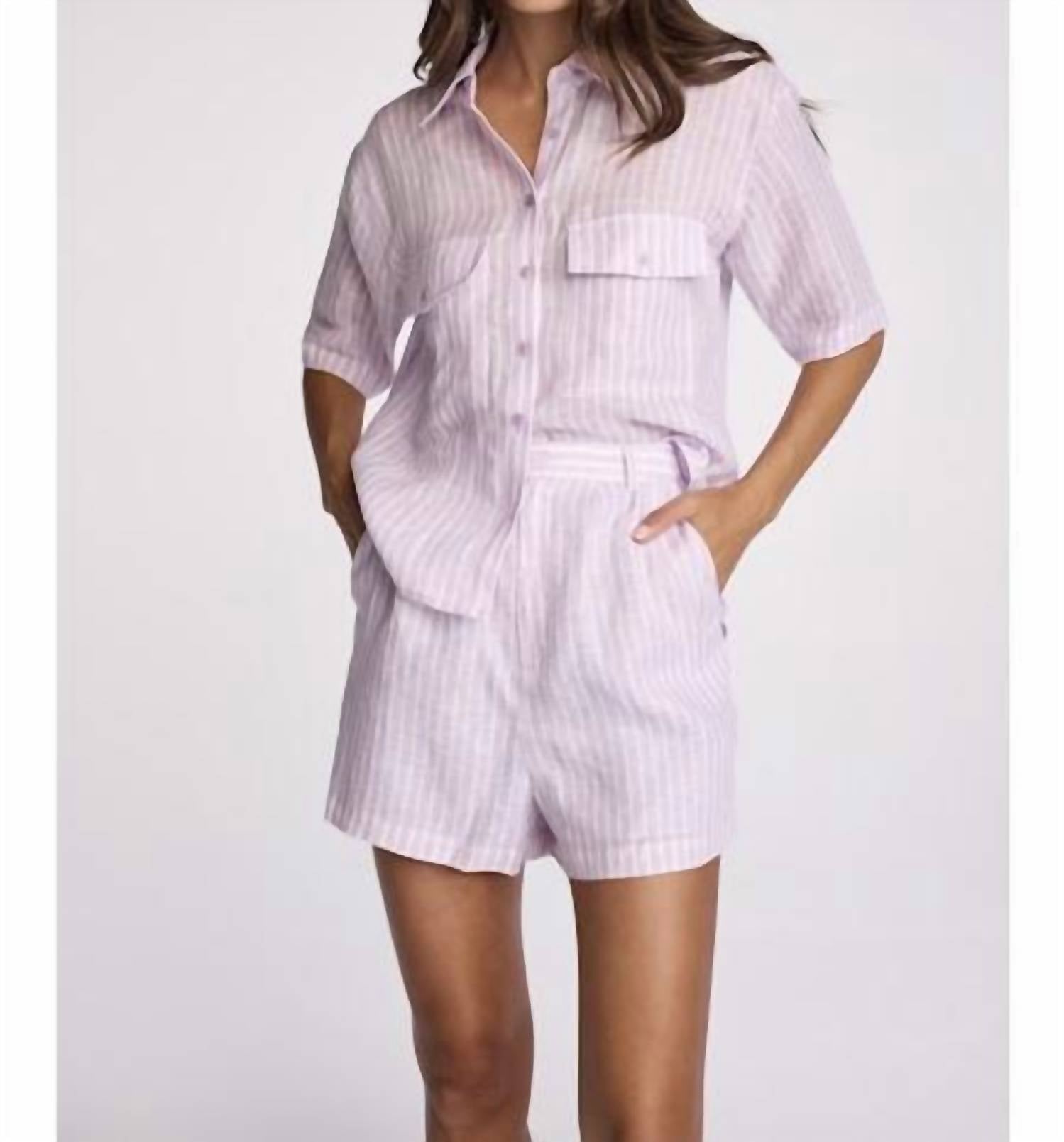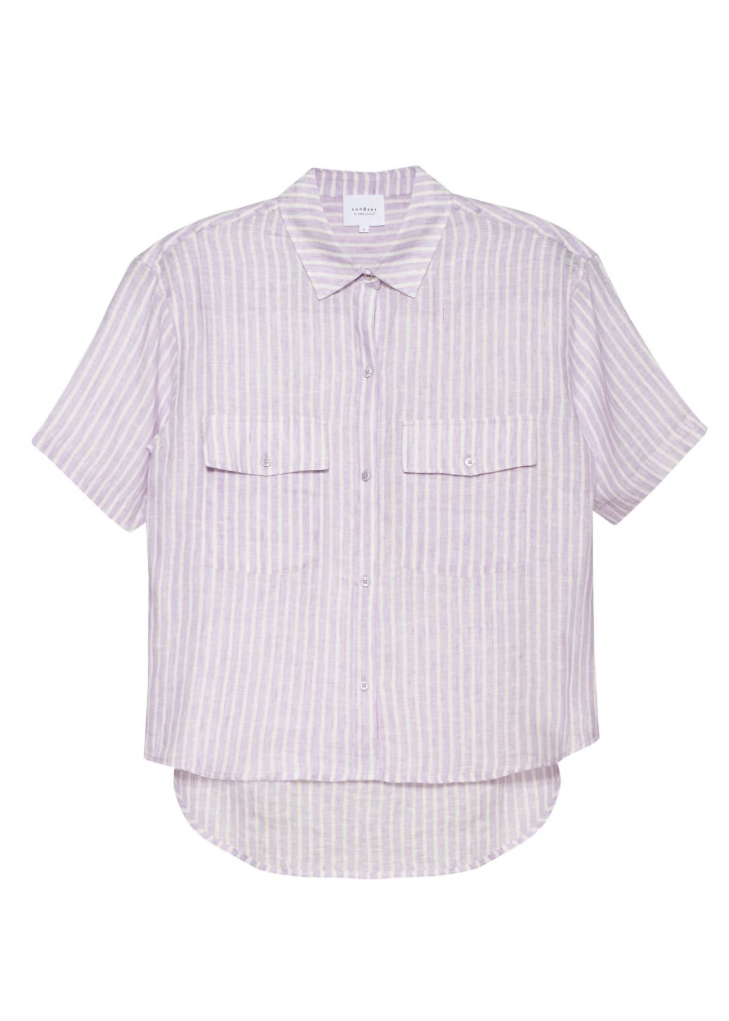 This button down shirt is comfortable yet polished. Elevate your fall wardrobe with the Sundays Crosby Shirt, a chic button-down designed for effortless style. This women's shirt in a stylish lavender stripe features elbow-length sleeves and a comfortable oversized fit with handy pockets, perfect for the linen season. Crafted from 100% linen, its breathable fabric ensures comfort throughout the day. Button closure. Machine wash cold.