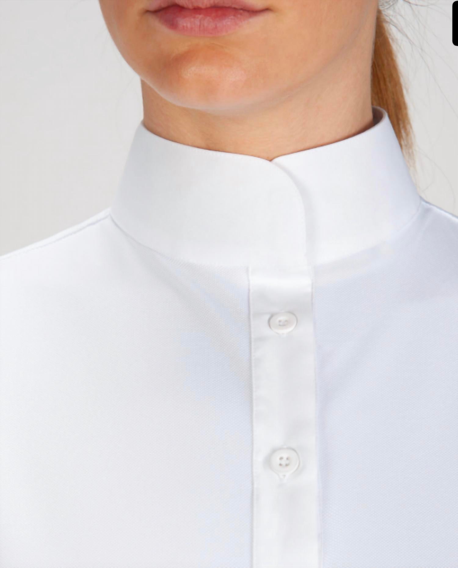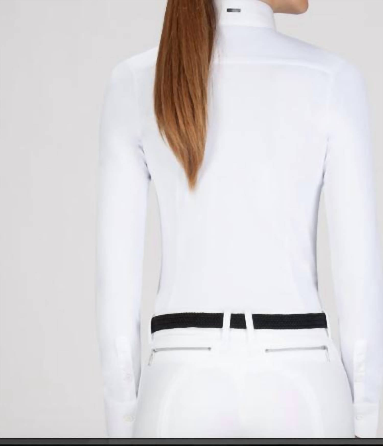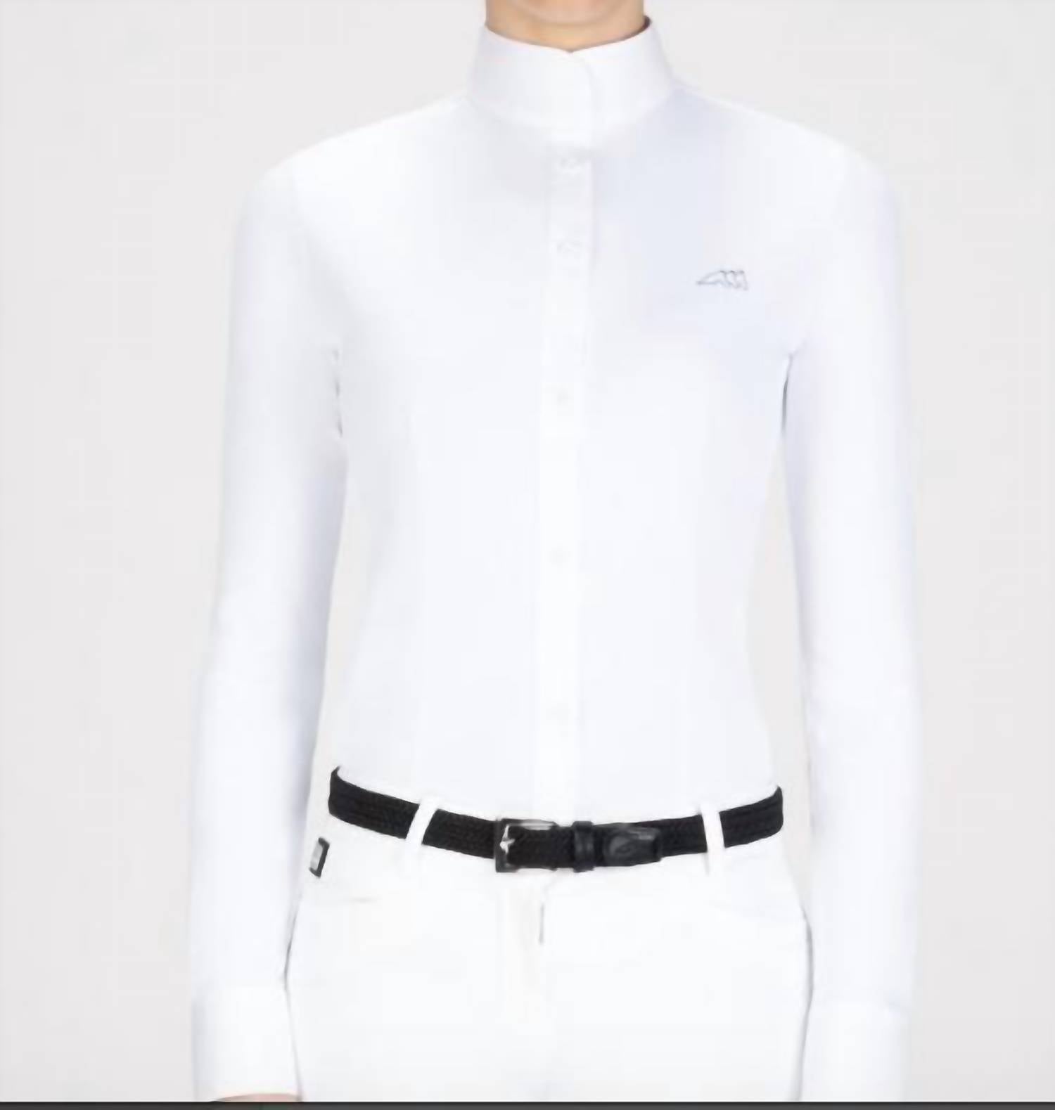 A classic button down shirt that will never go out of style. The Victoria adds innovative technology to the classic long-sleeve women’s white show shirt for hunters. Breathable and with 4-way stretch, the Victoria shirt features a tailored fit with true cuffs and Equiline’s X-Premium fabric, which is elasticized and fast-drying, allowing for enhanced comfort during performance. The Equiline logo is in subtle blue print on the chest.
