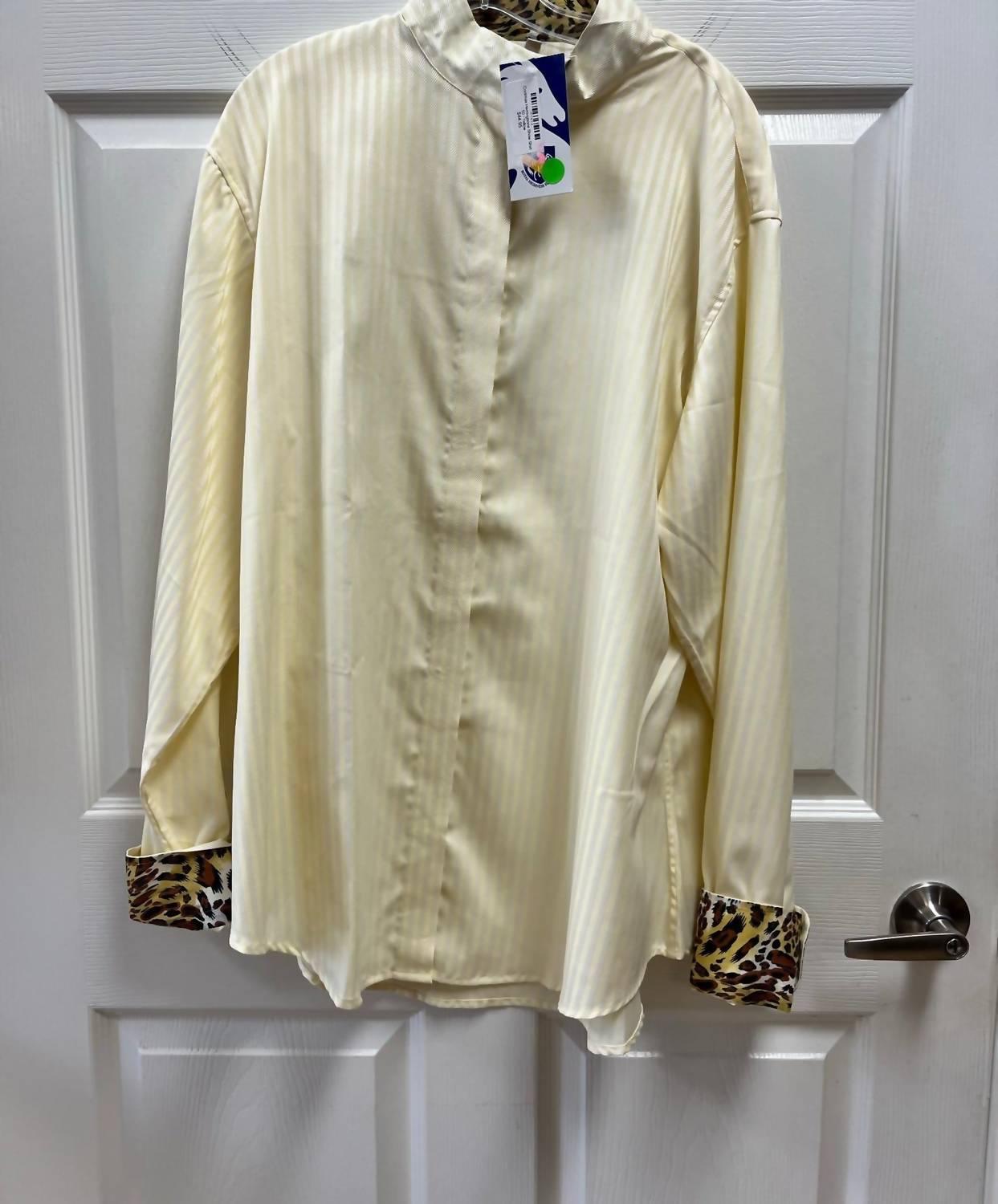 ROYAL HIGHNESS EQUESTRIAN Coolmax Herringbone Show Shirt is made from breathable Coolmax fabric and features snap style collar that is intended to be worn without a choker. The wrap around style collar is beautiful for inside the show ring and outside the show ring, fold down the collar and roll up your cuffs. The trim lines collar, cuffs and inside of the placket.