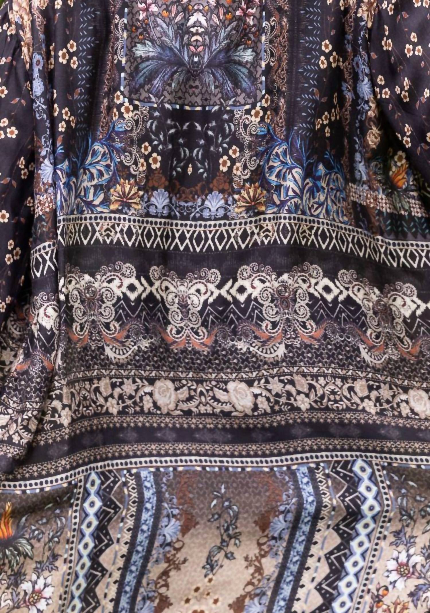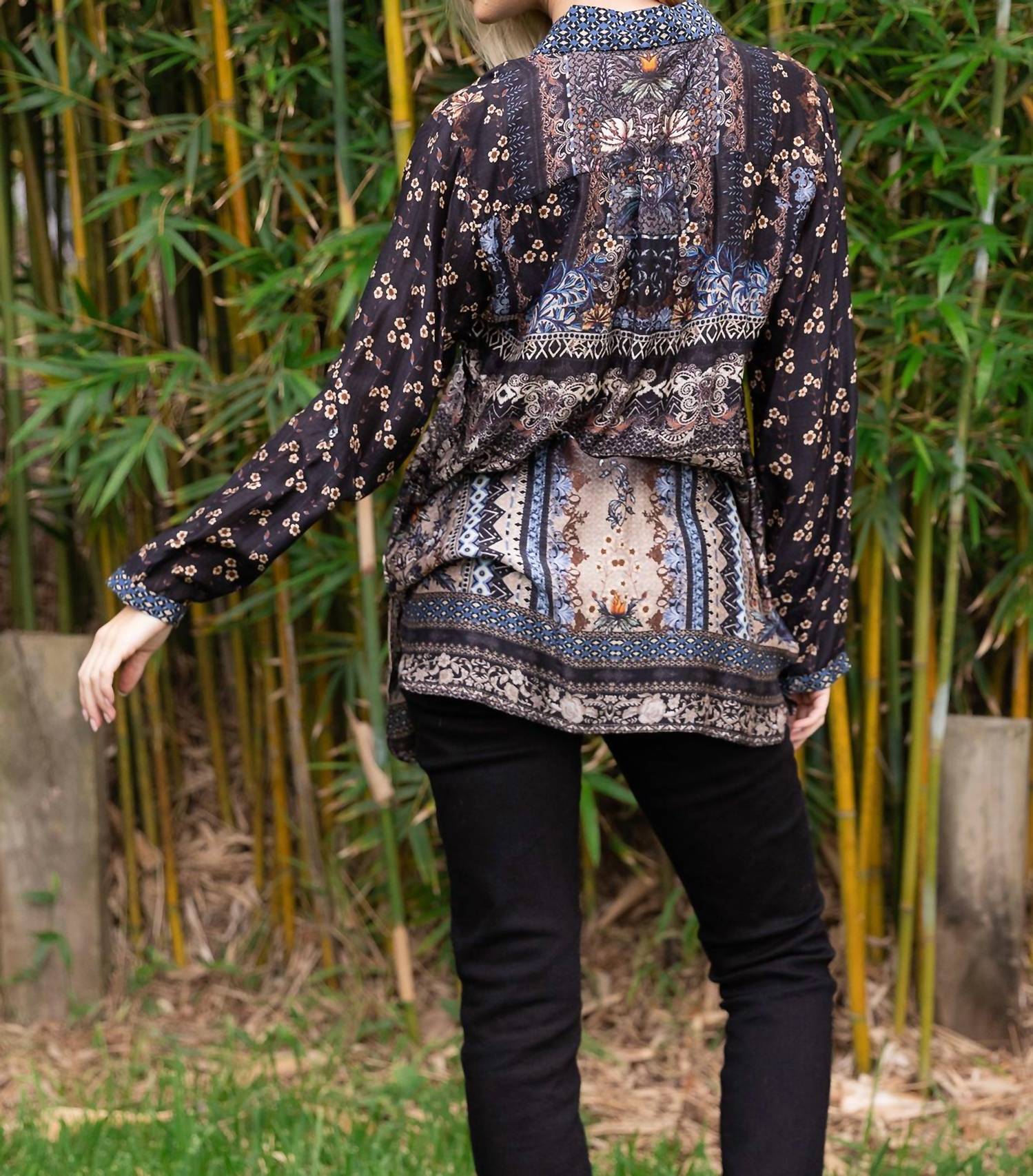 This button down shirt is comfortable yet polished. Introducing the Belle Top by Cienna, a stunning long sleeve shirt featuring a unique and gorgeous Billie print, perfect for a boho chic summer look. Made from 100% silk viscose, this piece offers an oversized fit with a button-through front, allowing you to tuck, tie, or wear it loose for a flowy vibe. Crafted in India and designed in Australia, it sports a V-neck, hi-low hem, and side splits for added movement. Closure: Button closure. Care: Cold hand wash only.