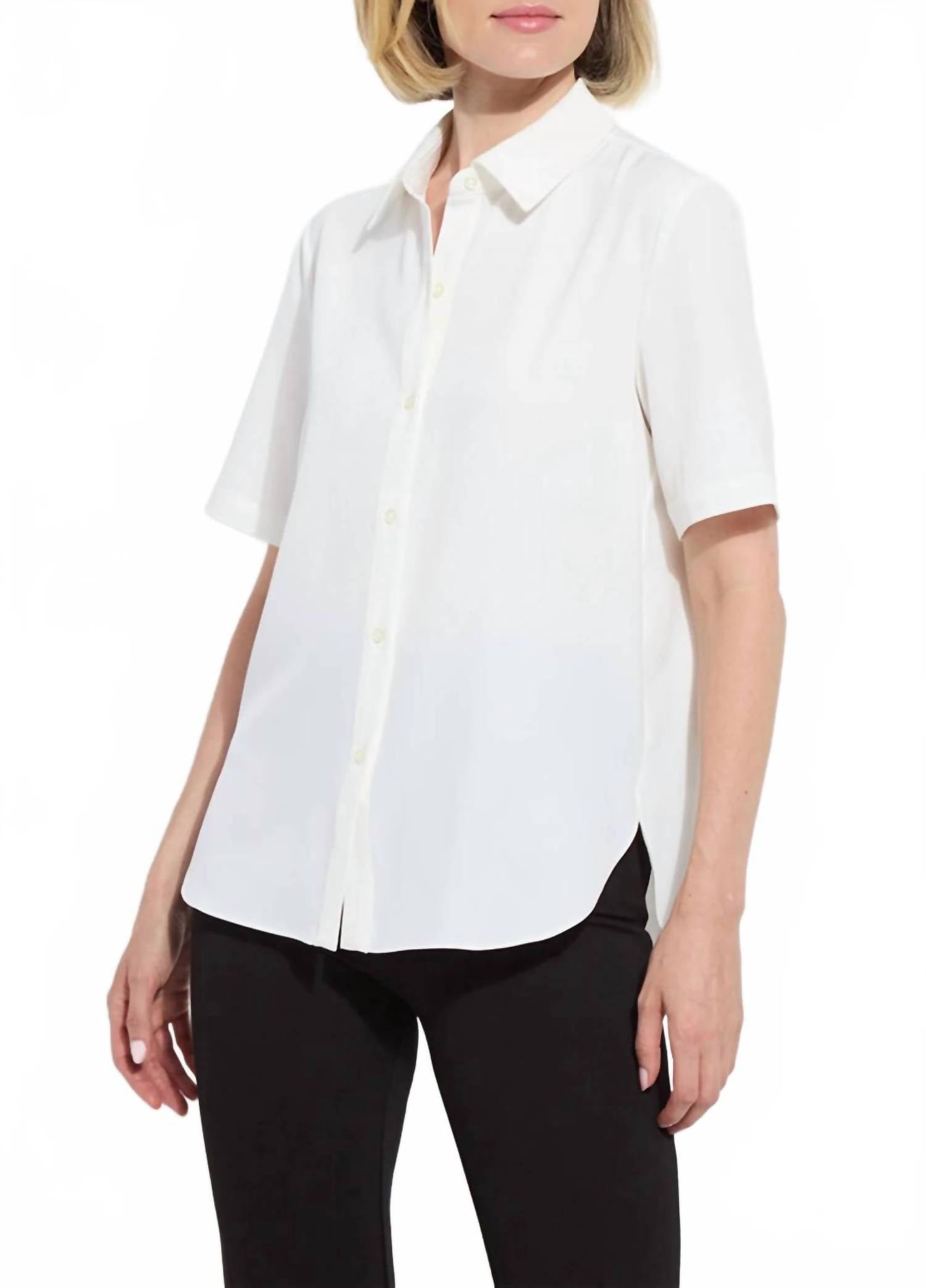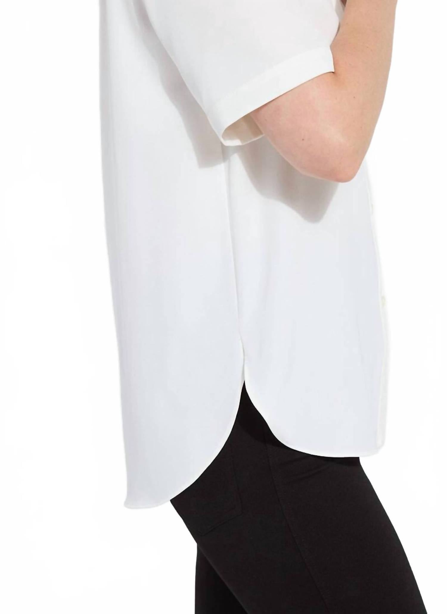 Perfectly tailored and soft to the touch. Introducing the Short Sleeve Button Shirt by Lysse, crafted for effortless elegance in solid white. With a slim fit and high-low, hip-length hem, it's made from a wrinkle-resistant Stretch Woven fabric comprising 95% polyester and 5% elastane, offering 2-way stretch for added comfort. The shirt features a clean collar and button closure.