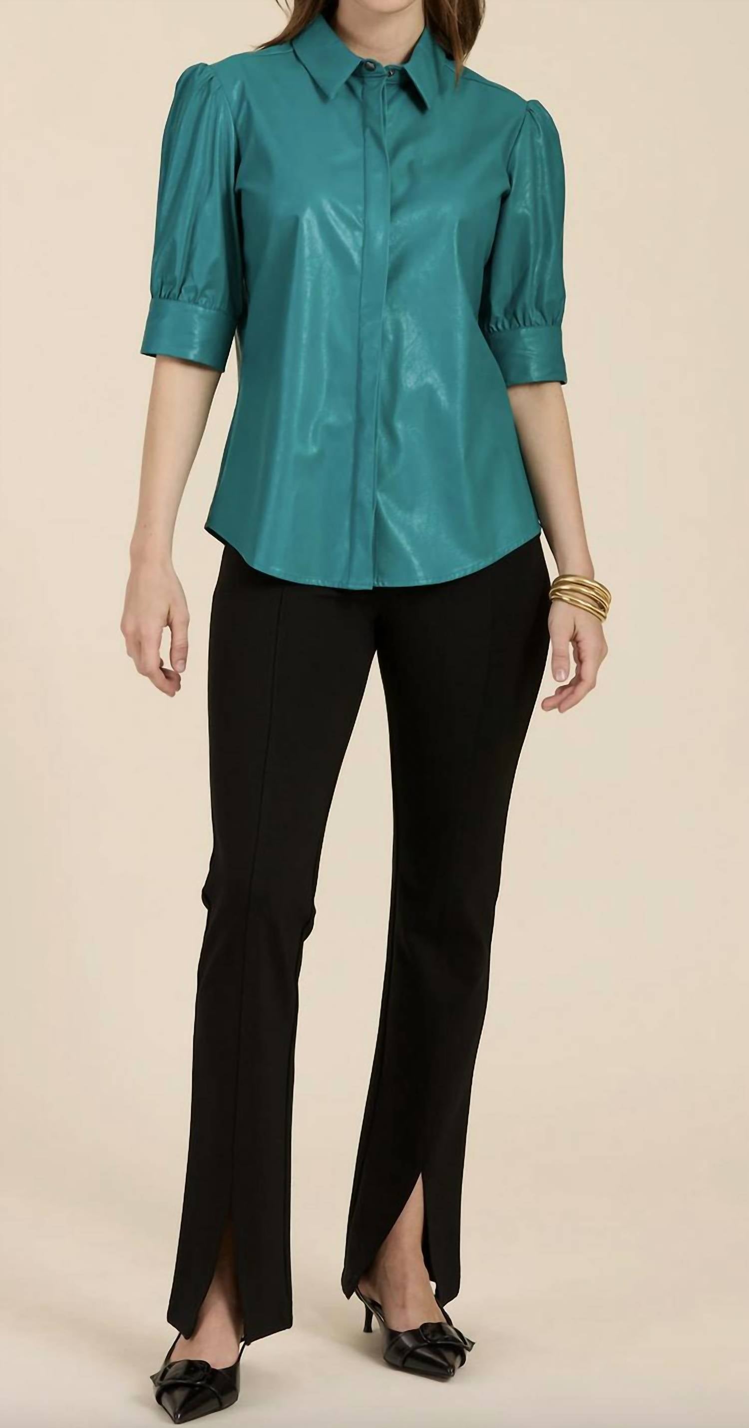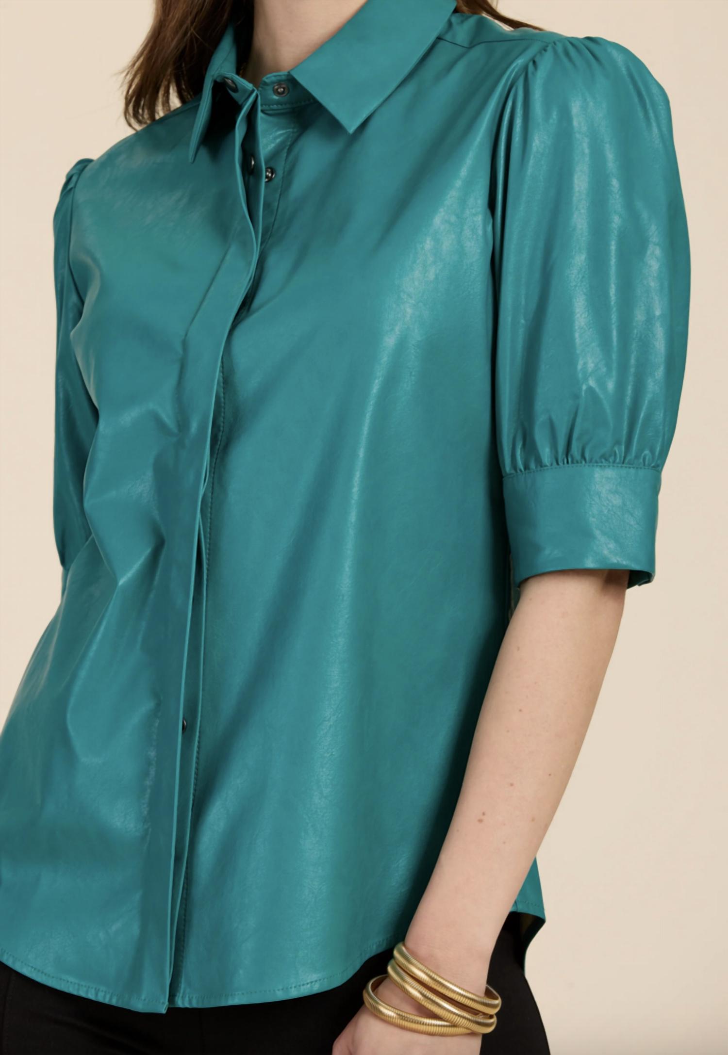 A classic button down shirt that will never go out of style. Introducing the ALICE VEGAN LEATHER SHIRT by Tyler Boe, an exquisite piece in a stunning deep lake color. This shirt offers elbow-length puff sleeves and a sleek collar, all in a buttery vegan leather for a chic, bold look. Crafted with a blend of 56% polyurethane and 44% viscose, it features a secure snap front closure. Perfect for any occasion, it adds a touch of edge to your wardrobe essentials.