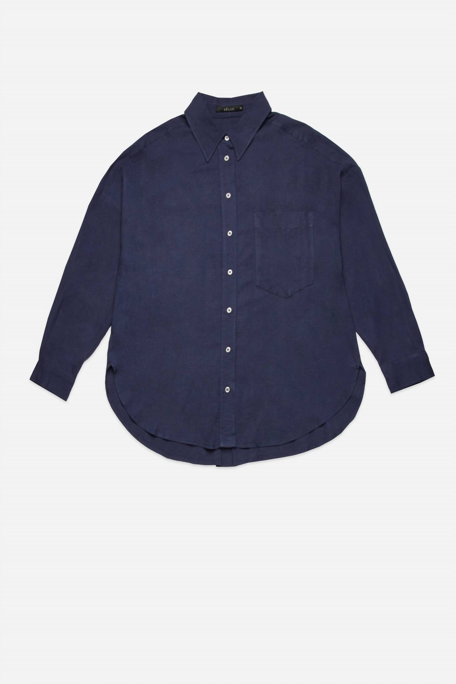 A classic button down shirt that will never go out of style. Introducing the Roxa Shirt by DELUC, a sophisticated addition in a rich navy hue. This linen blend shirt features long sleeves with buttoned cuffs and a stylish lapel collar, enhanced by a practical patch pocket. Designed with a curved hem that's longer at the back, it offers a flattering silhouette. Closure: Button closure.
