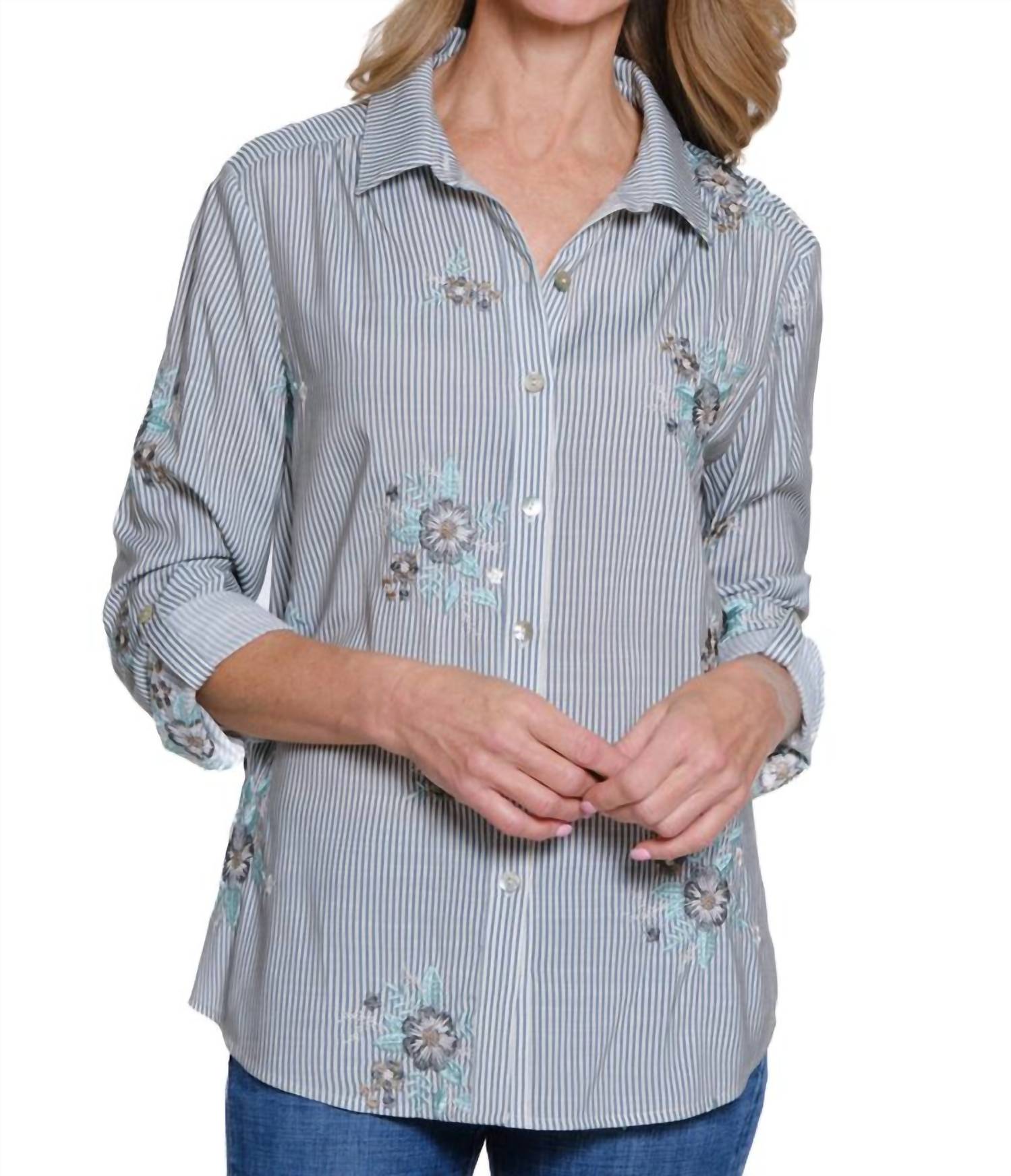 Multiples - Roll Tab Button Front Hi/lo Shirt With Embroidery
