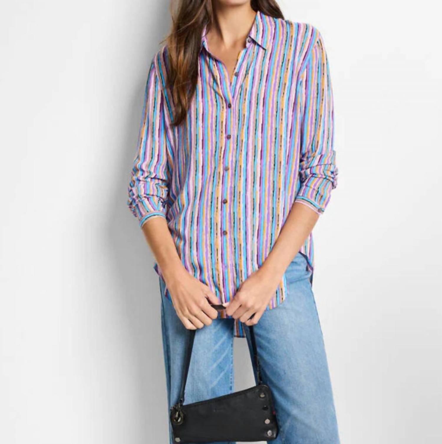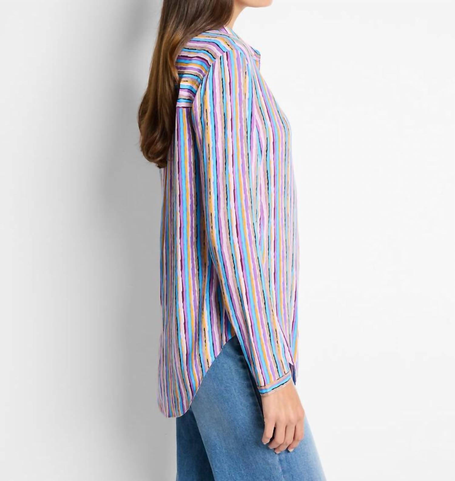 A classic button down shirt that will never go out of style. Elevate your wardrobe with the Solstice Stripe Shirt by Nic + Zoe, a dynamic purple multi blouse that showcases a striking stripe pattern. Designed with long sleeves, this button-down shirt offers versatility, adapting from polished to casual with ease. Its 100% Lenzingâ„¢ Ecoveroâ„¢ Viscose composition ensures a soft, sustainable feel, while the button closure adds a classic touch. Care is simple: machine wash cold, line dry, and cool iron if needed.