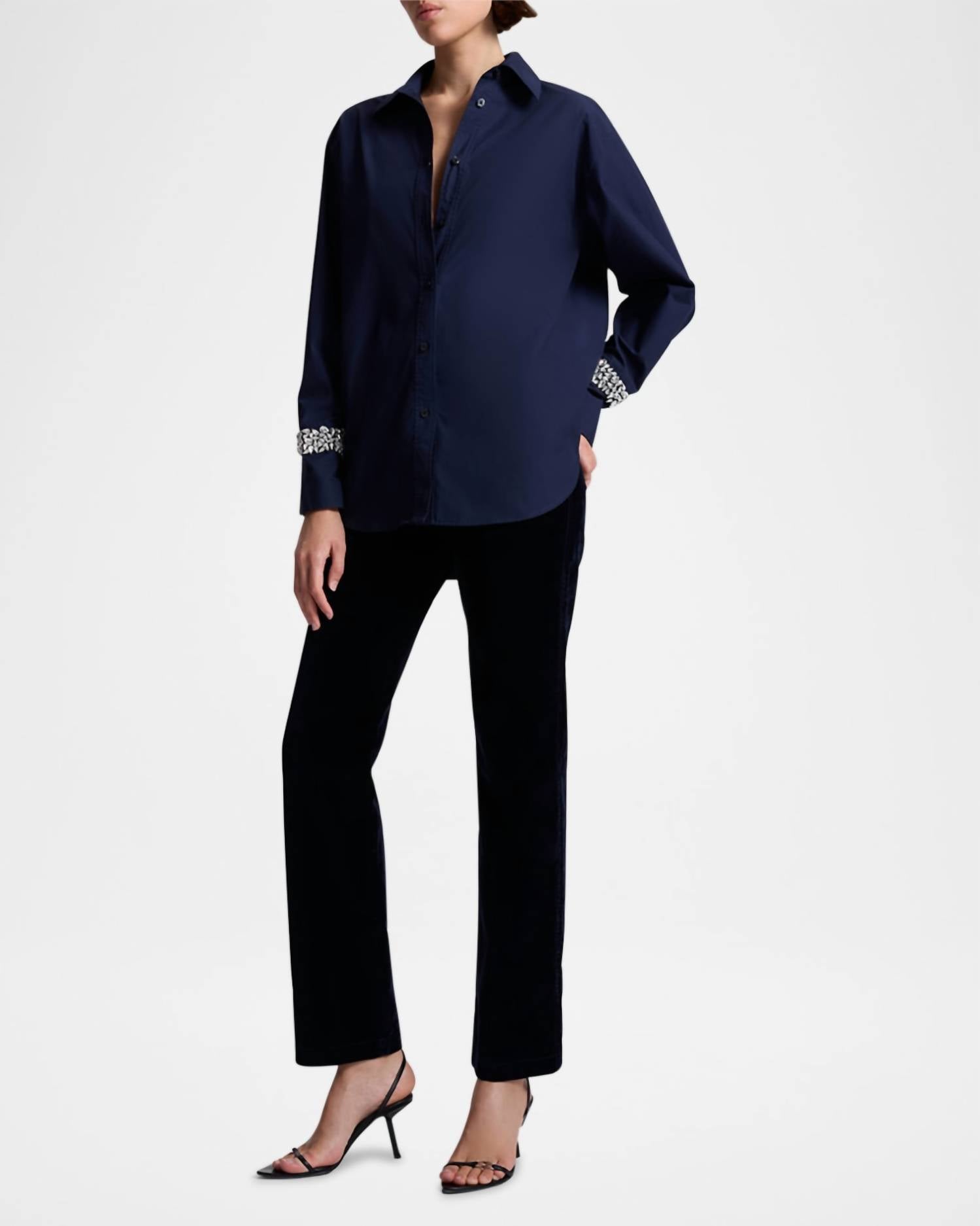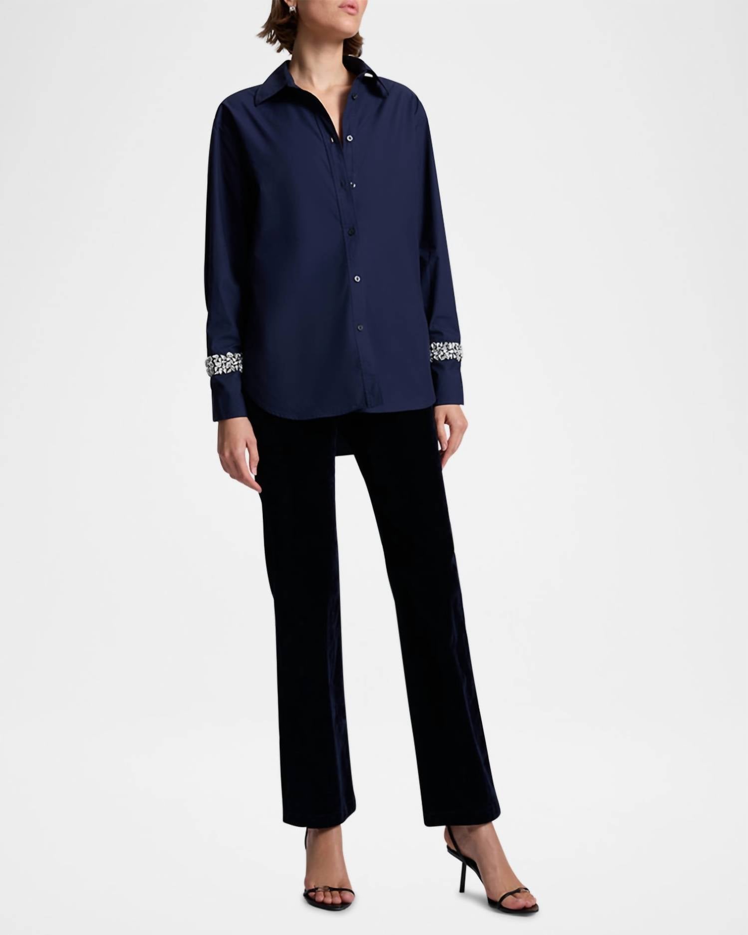 This button down shirt is comfortable yet polished. Meet the Calvin Top by A.L.C., a sophisticated addition to your wardrobe in a rich navy hue. This long sleeve button-down shirt is crafted from premium cotton poplin, adorned with elegant embellishments that add a touch of flair. Designed with a classic collar, it offers a timeless silhouette perfect for any occasion. Closure: Button closure. Care: Dry clean only.