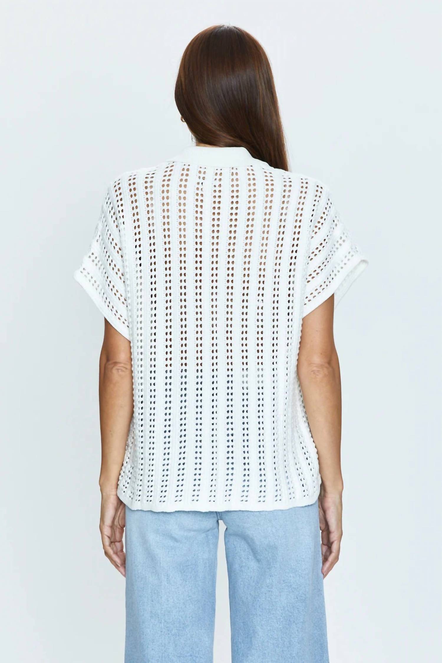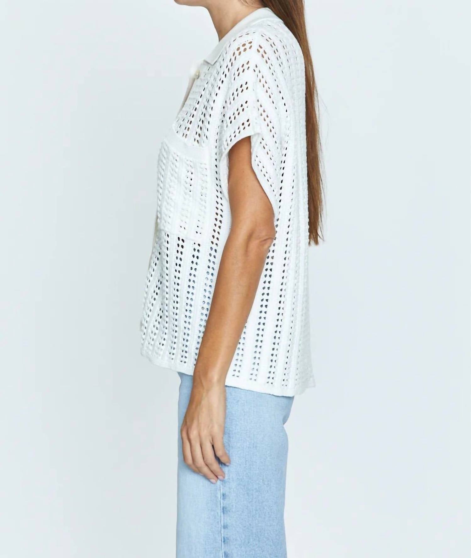 This button down shirt is comfortable yet polished. Unveil a sophisticated twist with the Pistola Lola Crochet Shirt in a chic ecru hue, crafted for the modern woman. This short sleeve button down shirt is meticulously designed with a semi-sheer open-weave construction and a soft collar neckline. Crafted from a luxurious blend of 77% Viscose and 23% Nylon, it offers both comfort and style, measuring at 23.5" in length. Features include button closure and open front pockets, perfect for adding a subtle touch of elegance to any ensemble.