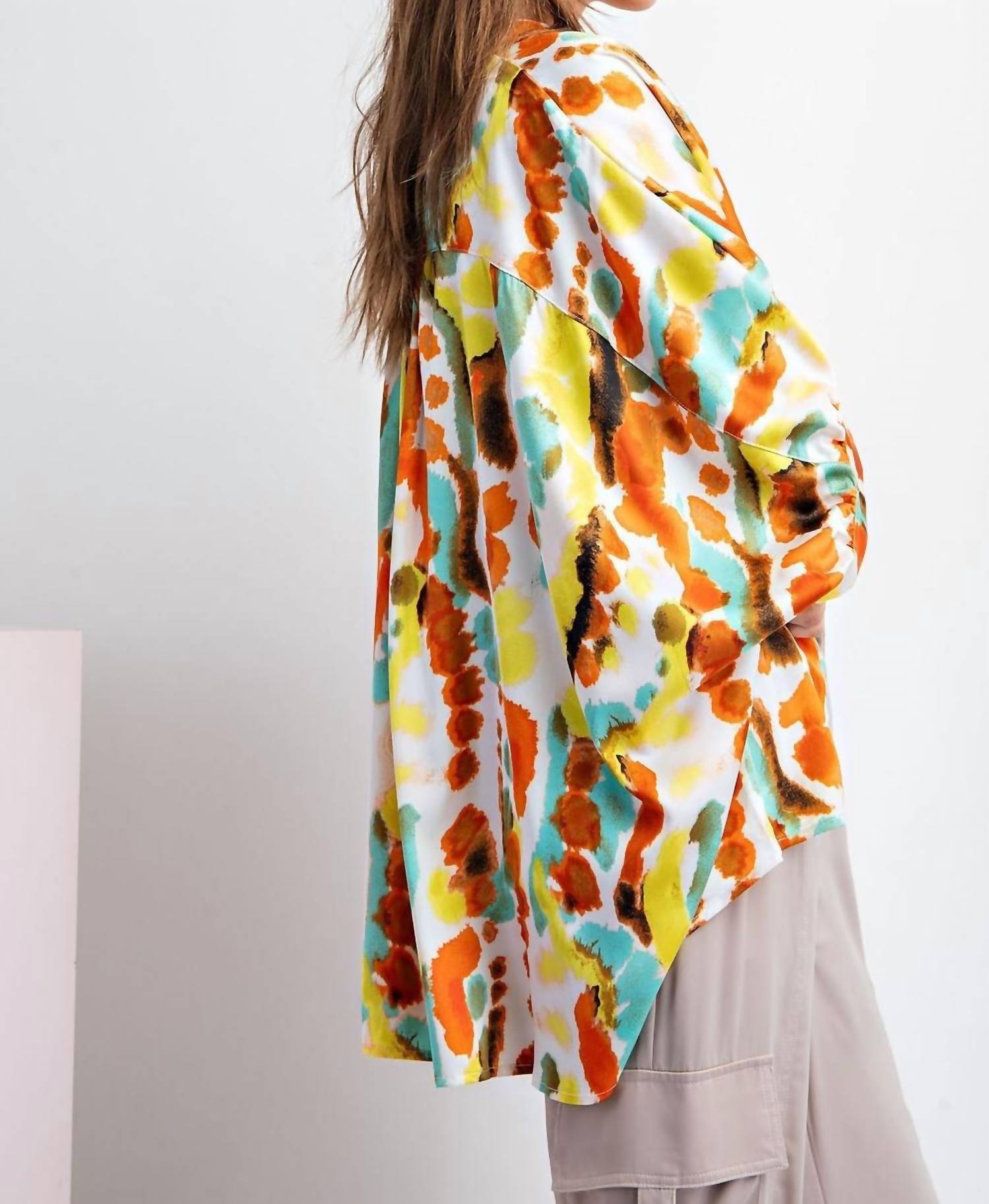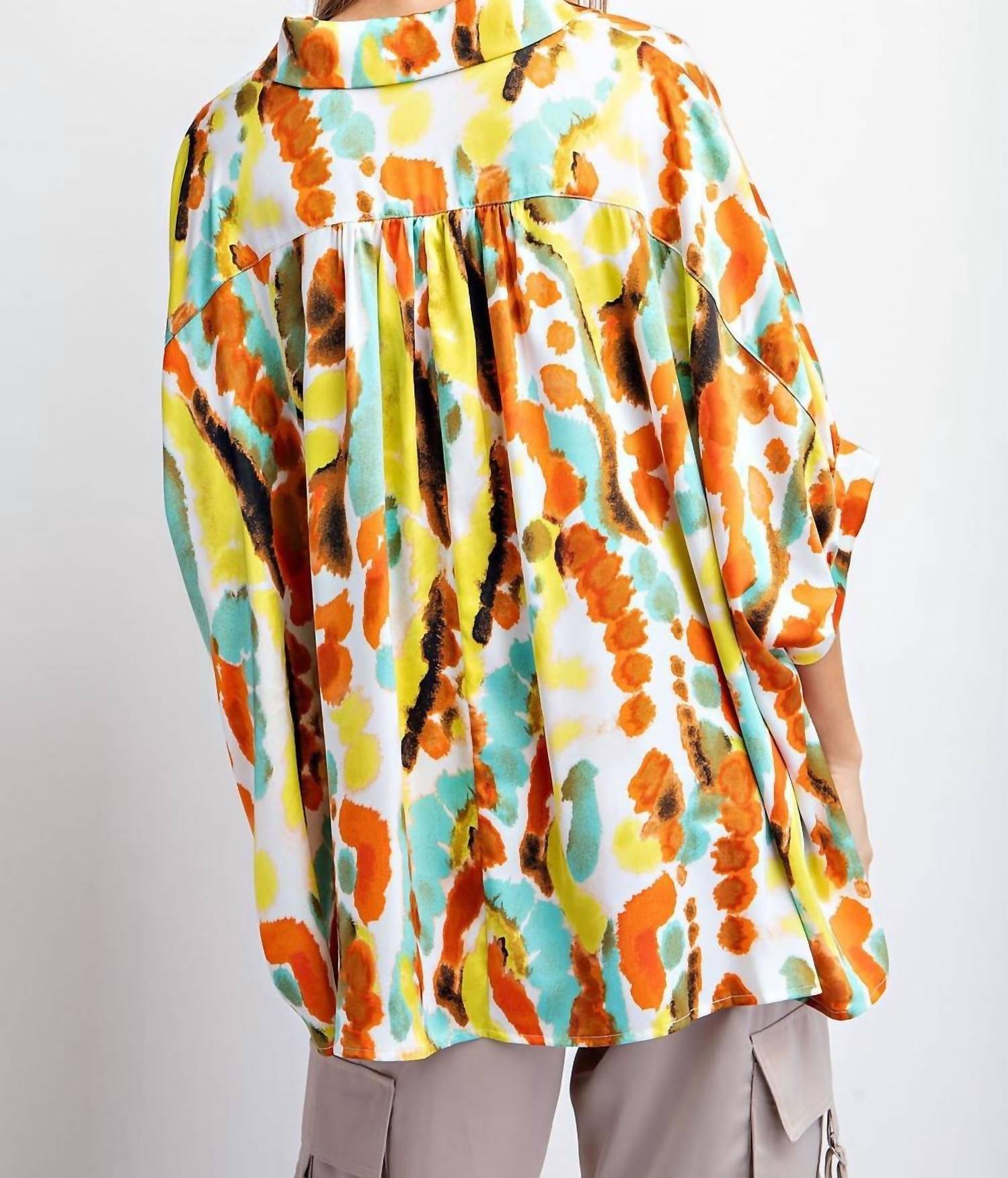 A classic button down shirt that will never go out of style. Introducing the Tie Dye Button Down Blouse by ee:some, a vibrant addition to any wardrobe with its eye-catching multi-colored pattern. Crafted from 100% Polyester, this short sleeve top features a collared neckline and a button closure for a classic look. The dolman sleeves and loose fit silhouette add a stylish, relaxed touch perfect for spring occasions. With its unique tie-dye design, this blouse effortlessly combines bold style with everyday comfort.