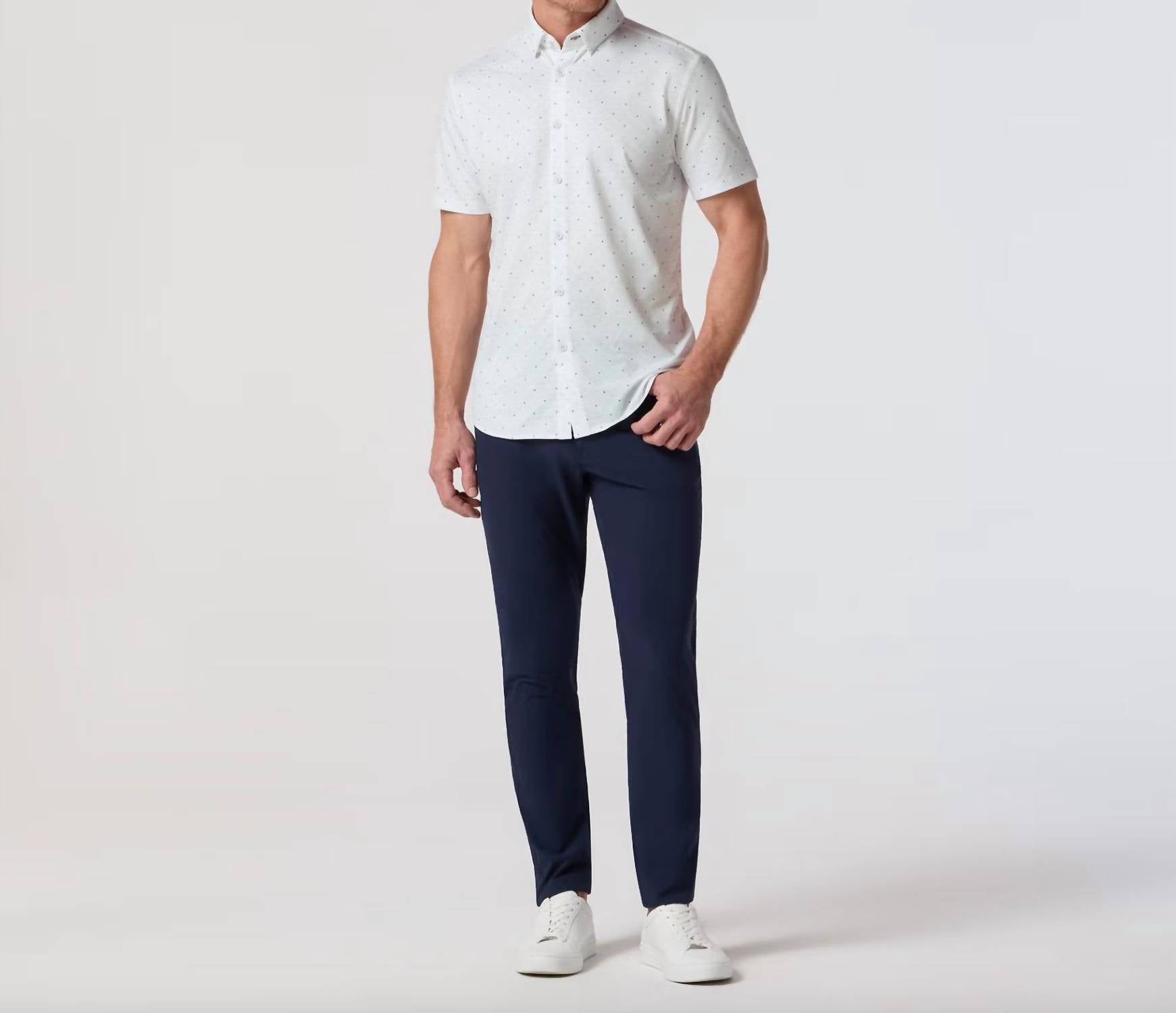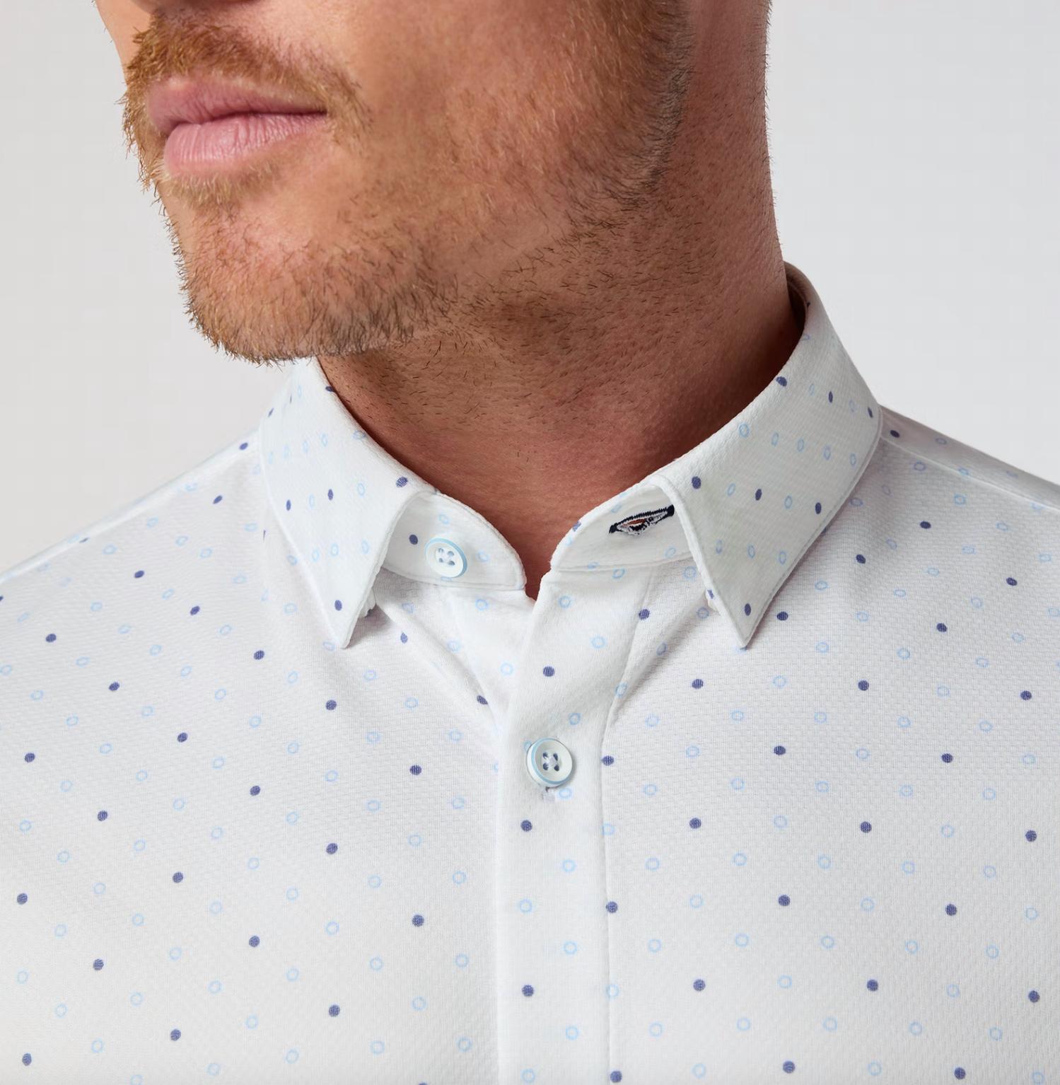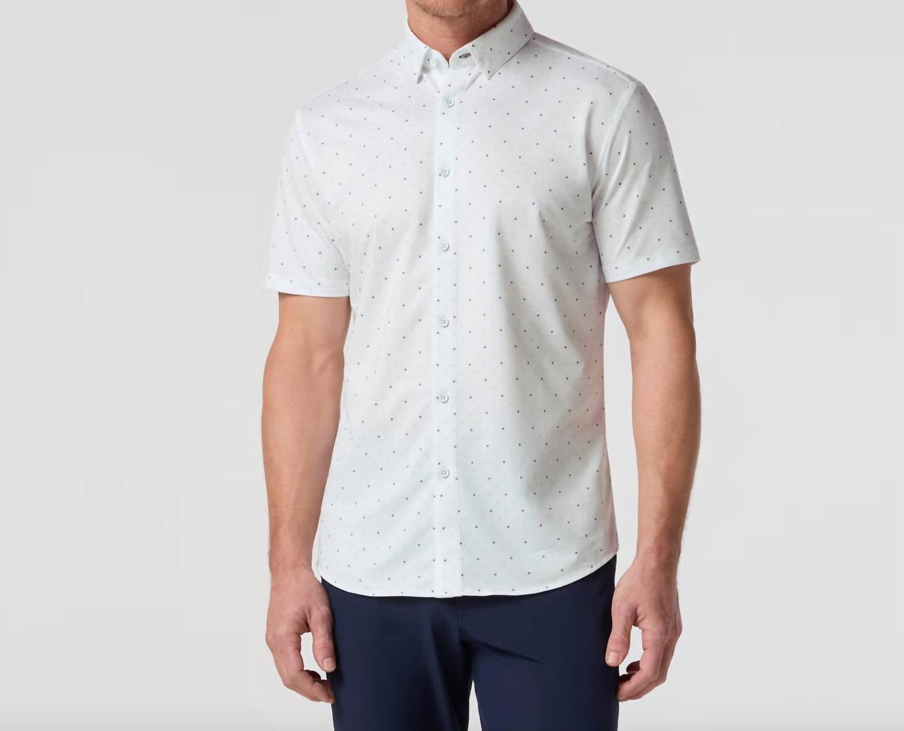This button down shirt is comfortable yet polished. The Halyard Short Sleeve Dress Shirt by Mizzen + Main offers ultimate comfort and style with its finely textured knit material, perfect for warm weather occasions. Designed in a striking White Dot pattern, this men's button-down shirt features a classic collar and is crafted to keep you cool and dry. Enjoy the convenience of a button closure and effortless care with machine wash cold instructions and low heat tumble dry. Whether for workwear or holiday parties, this versatile piece ensures you look and feel your best.