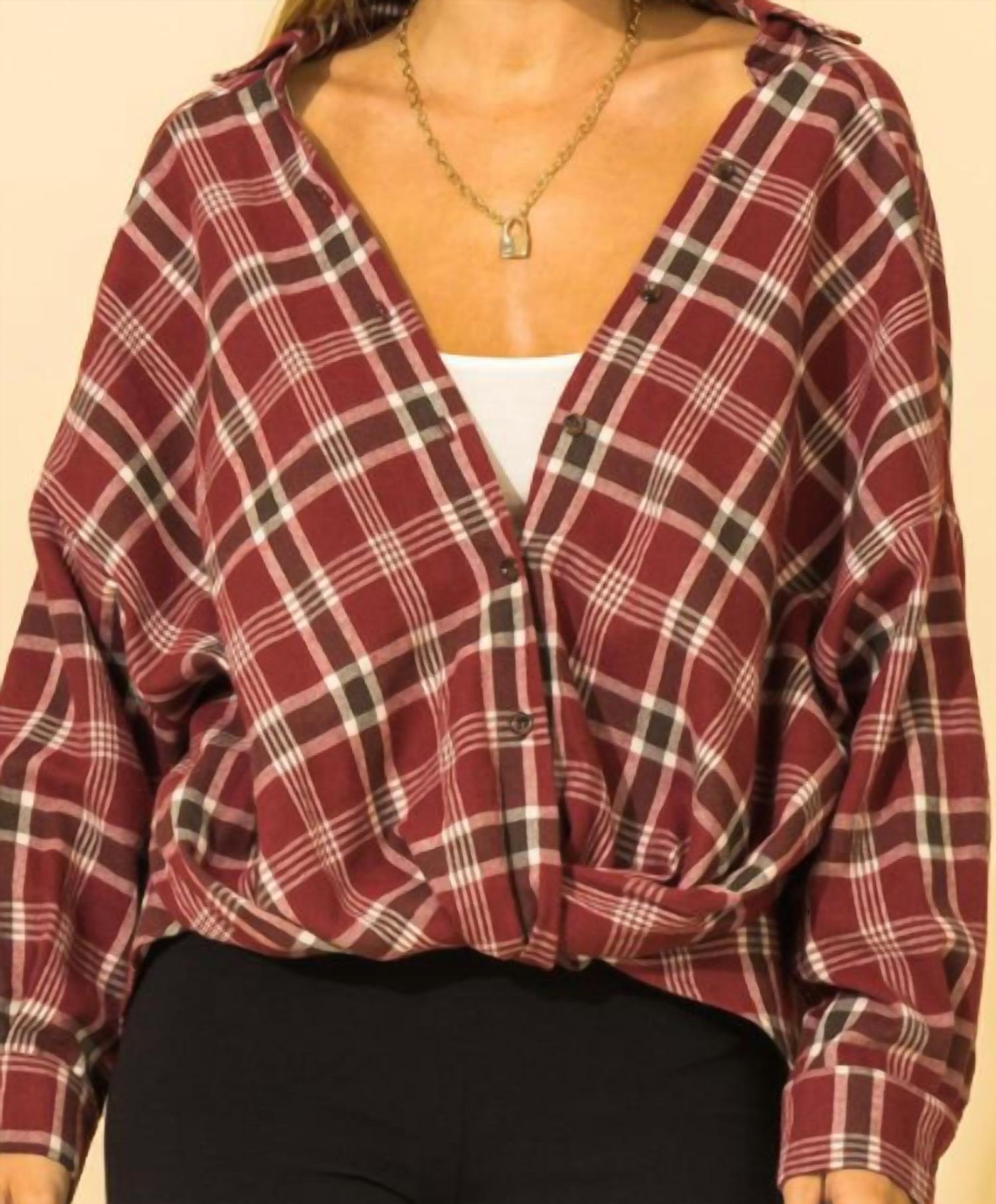 A classic button down shirt that will never go out of style. Embrace the fall season with the Twisted Oversized Plaid Shirt by Double Zero, a chic choice in a bold red plaid pattern. This button-down shirt features long sleeves and a collared neckline, offering a contemporary yet comfortable fit. It’s an ideal layering piece made from lightweight fabric, perfect for travel or spring outings. Closure type: Button closure.